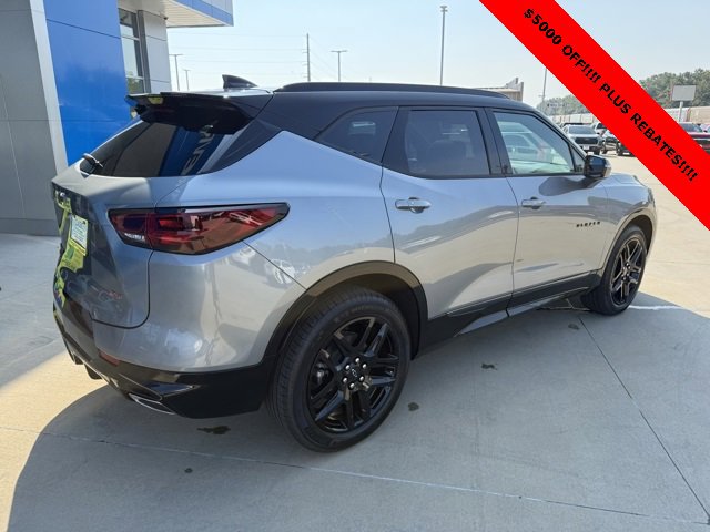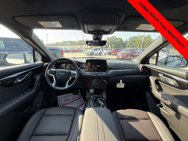 Sterling Gray Metallic 2025 Chevrolet Blazer RS FWD 9-Speed Automatic with Overdrive 3.6L V6 SIDI 19/26 City/Highway MPG The 2025 Chevrolet Blazer comes with the following features; Driver Confidence II Package (Adaptive Cruise Control, Enhanced Automatic Emergency Braking, HD Surround Vision, Rear Camera Mirror, Rear Camera Mirror Washer, and Safety Alert Seat), Preferred Equipment Group 1RS, 3.49 Final Drive Axle Ratio, 4-Wheel Disc Brakes, 6-Way Power Front Passenger Seat Adjuster, 8 Speakers, 8-Way Power Driver Seat Adjuster, ABS brakes, Air Conditioning, Alloy wheels, AM/FM radio: SiriusXM with 360L, Apple CarPlay/Android Auto, Auto High-beam Headlights, Auto-dimming door mirrors, Auto-dimming Rear-View mirror, Automatic temperature control, Black 2-Tone Roof, Bose Premium 8-Speaker Audio System Feature, Brake assist, Bumpers: body-color, Child-Seat-Sensing Airbag, Compass, Delay-off headlights, Driver door bin, Driver vanity mirror, Dual front impact airbags, Dual front side impact airbags, Electronic Stability Control, Emergency communication system: OnStar and Chevrolet connected services capable, Four wheel independent suspension, Front anti-roll bar, Front Bucket Seats, Front Center Armrest, Front dual zone A/C, Front reading lights, Fully automatic headlights, Garage door transmitter, Heated door mirrors, Heated front seats, Heated steering wheel, Illuminated entry, Knee airbag, Leather Shift Knob, Leather steering wheel, Low tire pressure warning, Navigation System, Occupant sensing airbag, Outside temperature display, Overhead airbag, Overhead console, Panic alarm, Passenger door bin, Passenger vanity mirror, Perforated Leather-Appointed Seat Trim, Power door mirrors, Power Driver Lumbar Control, Power driver seat, Power Liftgate, Power Panoramic Tilt-Sliding Sunroof, Power passenger seat, Power steering, Power windows, Premium audio system: Chevrolet Infotainment 3 Premium, Radio data system, Radio: Chevrolet Infotainment 3 Premium System, Rear anti-roll bar, Rear reading lights, Rear seat center armrest, Rear window defroster, Rear window wiper, Remote keyless entry, Security system, Speed control, Speed-sensing steering, Split folding rear seat, Spoiler, Steering wheel mounted audio controls, Stop-Start Engine Control System, Tachometer, Telescoping steering wheel, Tilt steering wheel, Traction control, Trip computer, Turn signal indicator mirrors, Variably intermittent wipers, and Voltmeter.