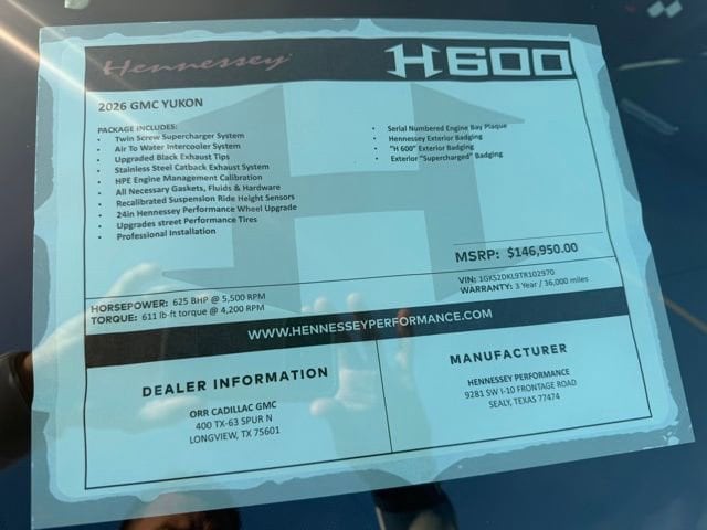 HENNESSEY PERFORMANCE, 4WD, 15 Diagonal Multi-Color Head-Up Display, 3 Years OnStar One, 4-Way Power Driver Lumbar Seat Adjuster, 4-Way Power Front Passenger Lumbar Seat Adjuster, Advanced Security Package, Advanced Technology Package, Air Ride Adaptive Suspension, AutoSense Hands-Free Power Liftgate, Blind Zone Steering Assist with Trailering, Bright Front and Rear Door Sill Plates, Denali Reserve Package, Driver Attention Assist, Dual Exhaust System, Dual-Pane Panoramic Power Sunroof, Electronic Limited Slip Differential (ELSD), Enhanced Trailering Technology Package, Extra Capacity Cooling System, Galvano Bodyside Moldings, Glass Breakage Sensor, Hill Descent Control, Hitch View, Inside Rearview Auo-Dimming Rear Camera Mirror, Integrated Trailer Brake Controller, License Plate Front Mounting Package, Magnetic Ride Control Suspension, Max Trailering Package, Navigation system: GMC Connected Navigation, Power Release 2nd Row Bucket Seats, Power Tilt and Telescopic Steering Column, Power-Retractable Assist Steps, Preferred Equipment Group 5SA, Premium Capability Package with Active Response 4WD, Rear Seat Media System, Smart Trailer Integration Indicator, Super Cruise, Theft-Deterrent Alarm System, Trailer Camera Provisions, Trailering Assist Guidelines, Vehicle Inclination Sensor, Vehicle Interior Movement Sensor, Wheel Locks (set of 4), Wheels: 22 x 9 Polished Aluminum, Wired Auxiliary Trailer Camera.