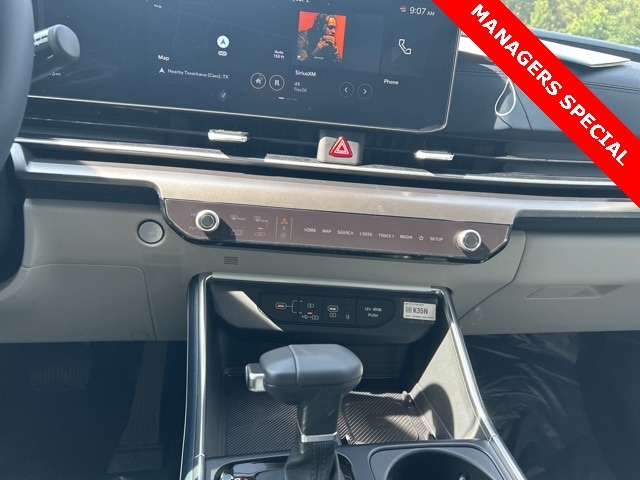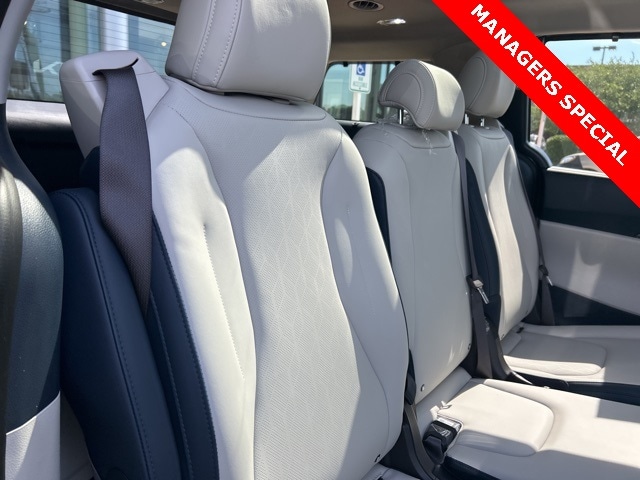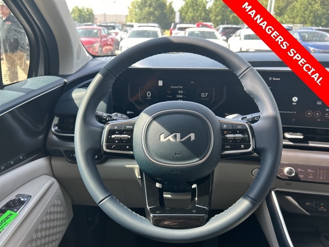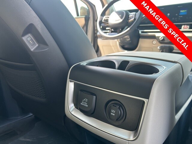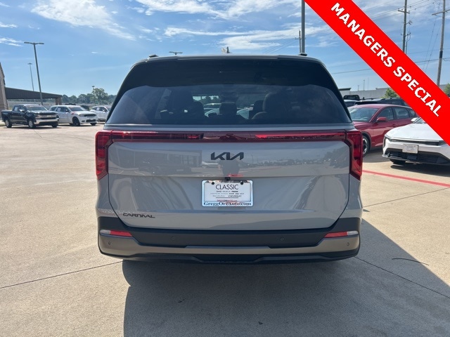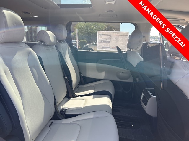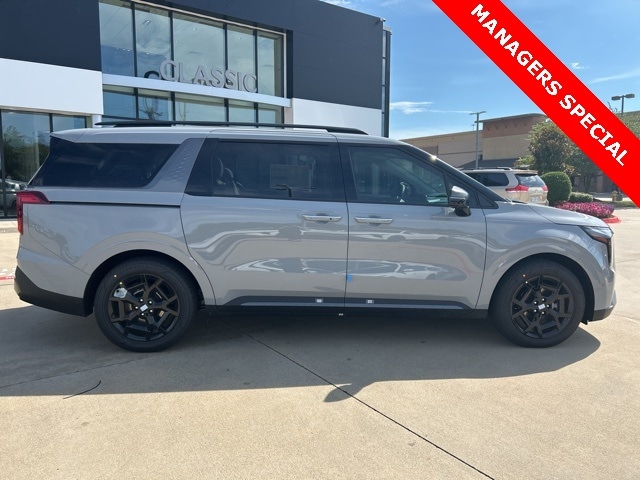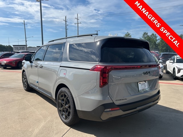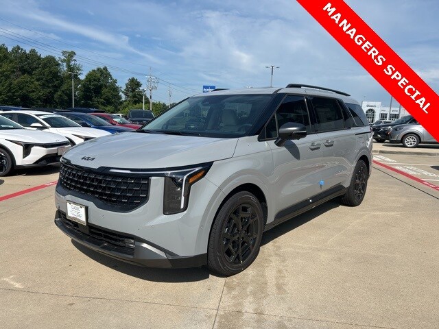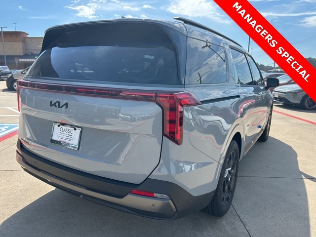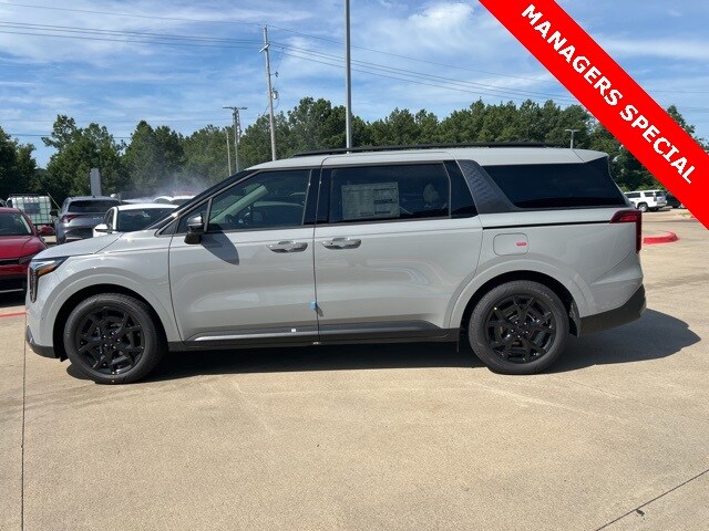 The 2025 Kia Carnival comes with the following features; Rear Seat Entertainment Package, SX Dark Edition Package (Wheels: 7.5J x 19" Alloy Dark Edition), 3.51 Axle Ratio, 3rd row seats: split-bench, 4-Wheel Disc Brakes, 8 Speakers, ABS brakes, Air Conditioning, Alloy wheels, AM/FM radio: SiriusXM, Apple CarPlay & Android Auto, Artificial Leather Seat Trim, Auto High-beam Headlights, Automatic temperature control, Brake assist, Bumpers: body-color, Cargo Tray, Carpeted Floor Mats (8-Passenger), Compass, Cross Bars, Dark Edition Front Grille Trim, Dark Edition Mirror Caps, Delay-off headlights, Driver door bin, Driver vanity mirror, Dual front impact airbags, Dual front side impact airbags, Electronic Stability Control, Emergency communication system, Exterior Parking Camera Rear, Four wheel independent suspension, Front anti-roll bar, Front Bucket Seats, Front Center Armrest, Front dual zone A/C, Front fog lights, Front reading lights, Fully automatic headlights, Heated & Ventilated Front Bucket Seats, Heated door mirrors, Heated front seats, Illuminated entry, Knee airbag, Leather Shift Knob, Leather steering wheel, Low tire pressure warning, Memory seat, Navigation system: AVN 5.0 Navigation System, Occupant sensing airbag, Outside temperature display, Overhead airbag, Overhead console, Panic alarm, Passenger door bin, Passenger vanity mirror, Power 2nd-Row Moonroof, Power door mirrors, Power driver seat, Power Liftgate, Power moonroof, Power passenger seat, Power steering, Power windows, Radio: AM/FM/HD Audio System, Rain sensing wipers, Rear air conditioning, Rear anti-roll bar, Rear reading lights, Rear window defroster, Rear window wiper, Reclining 3rd row seat, Remote keyless entry, Security system, Speed control, Speed-sensing steering, Split folding rear seat, Spoiler, Steering wheel mounted audio controls, Tachometer, Telescoping steering wheel, Tilt steering wheel, Traction control, Trailer Prewire Harness, Trip computer, Turn signal indicator mirrors, Variably intermittent wipers, Ventilated front seats, and Wheels: 7.5J x 19" Alloy.