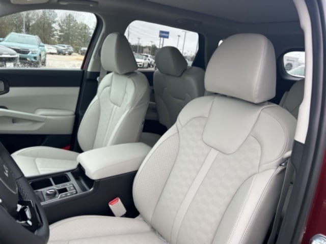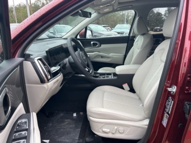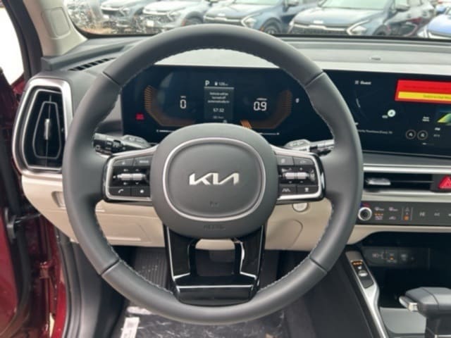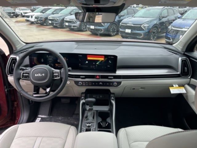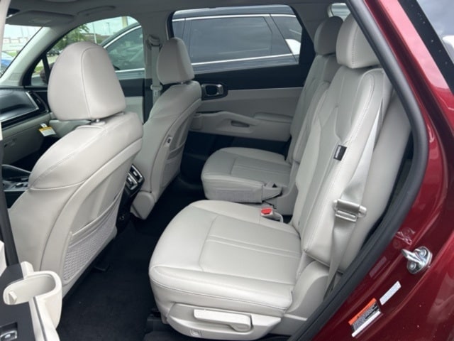 The 2025 Kia Sorento comes with the following features; Panoramic Sunroof Package (LED Interior Lighting and Panoramic Power Sunroof w/Power Sunshade), 3rd row seats: split-bench, 4-Wheel Disc Brakes, 6 Speakers, ABS brakes, Air Conditioning, Alloy wheels, AM/FM radio: SiriusXM, Apple CarPlay & Android Auto, Auto High-beam Headlights, Auto-dimming Rear-View mirror, Automatic temperature control, Brake assist, Bumpers: body-color, Cargo Cover, Carpeted Floor Mats, Chrome Wheel Locks, Cross Bars, Delay-off headlights, Driver door bin, Driver vanity mirror, Dual front impact airbags, Dual front side impact airbags, Electronic Stability Control, Emergency communication system: 911 Connect, Exterior Parking Camera Rear, Four wheel independent suspension, Front anti-roll bar, Front Bucket Seats, Front Center Armrest, Front dual zone A/C, Front fog lights, Front reading lights, Fully automatic headlights, Heated door mirrors, Heated Front Bucket Seats, Heated front seats, Illuminated entry, Illuminated Hatch Sill Plate, Knee airbag, Leather Shift Knob, Leather steering wheel, Low tire pressure warning, Mudguards, Navigation System, Occupant sensing airbag, Outside temperature display, Overhead airbag, Overhead console, Panic alarm, Passenger door bin, Passenger vanity mirror, Power door mirrors, Power driver seat, Power Liftgate, Power passenger seat, Power steering, Power windows, Radio data system, Radio: AM/FM Standard Sound System, Rear anti-roll bar, Rear reading lights, Rear side impact airbag, Rear window defroster, Rear window wiper, Remote keyless entry, Security system, Speed control, Speed-sensing steering, Split folding rear seat, Spoiler, Steering wheel mounted audio controls, SynTex Artificial Leather Seat Trim, Tachometer, Telescoping steering wheel, Tilt steering wheel, Traction control, Trip computer, Turn signal indicator mirrors, Variably intermittent wipers, and Wheels: 20" Machine-Finished Gloss Black Alloy.