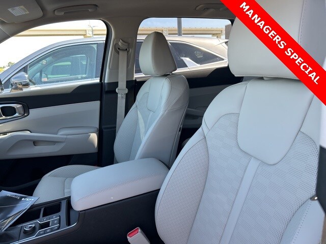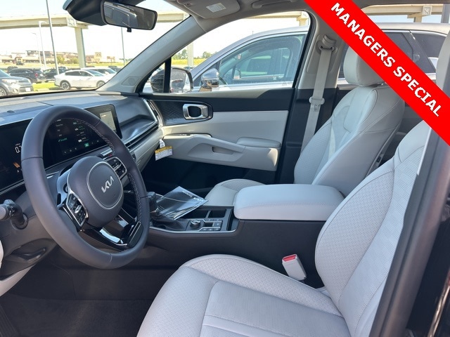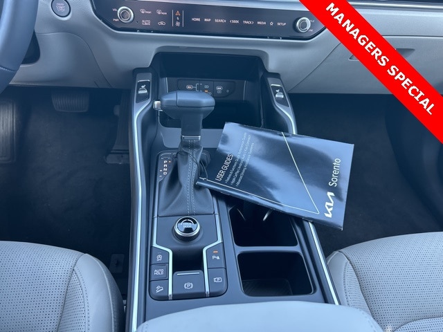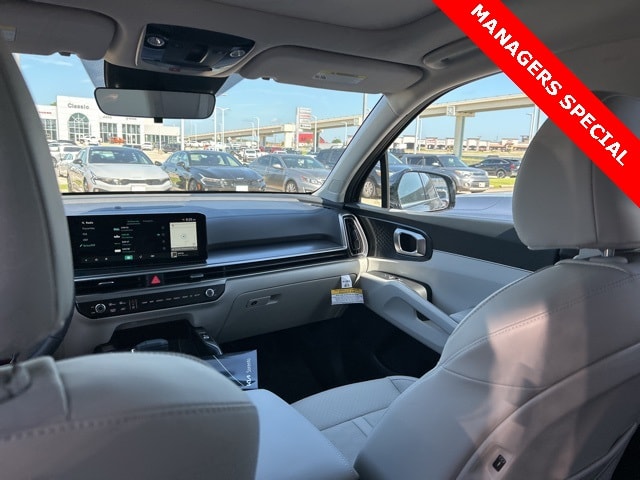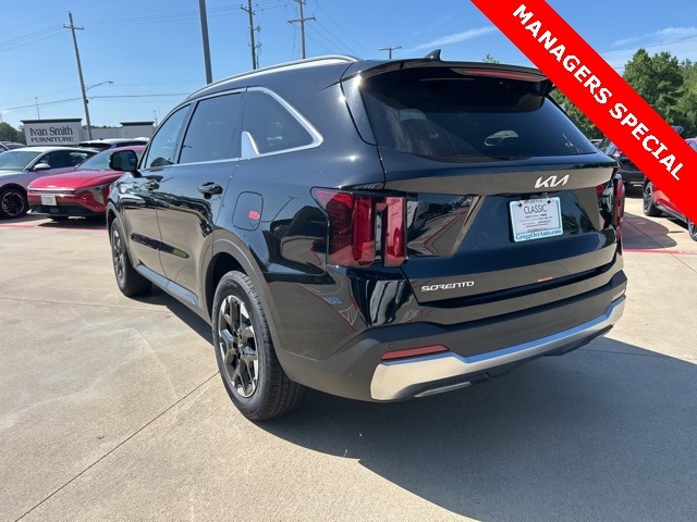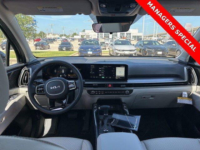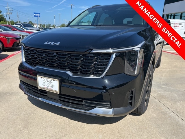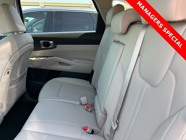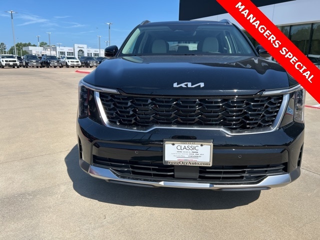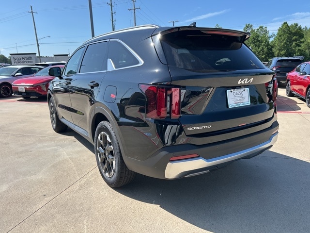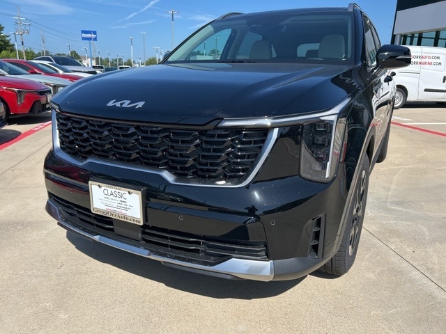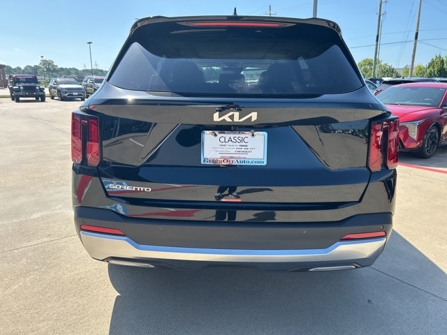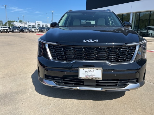 The 2025 Kia Sorento comes with the following features; Panoramic Sunroof Package (LED Interior Lighting and Panoramic Power Sunroof w/Power Sunshade), 3rd row seats: split-bench, 4-Wheel Disc Brakes, 6 Speakers, ABS brakes, Air Conditioning, Alloy wheels, AM/FM radio: SiriusXM, Apple CarPlay & Android Auto, Auto High-beam Headlights, Automatic temperature control, Brake assist, Bumpers: body-color, Cargo Net, Carpeted Floor Mats, Delay-off headlights, Driver door bin, Driver vanity mirror, Dual front impact airbags, Dual front side impact airbags, Electronic Stability Control, Emergency communication system: 911 Connect, Exterior Parking Camera Rear, Four wheel independent suspension, Front anti-roll bar, Front Bucket Seats, Front Center Armrest, Front dual zone A/C, Front reading lights, Fully automatic headlights, Heated door mirrors, Heated Front Bucket Seats, Heated front seats, Illuminated entry, Knee airbag, Leather Shift Knob, Leather steering wheel, Low tire pressure warning, Navigation System, Occupant sensing airbag, Outside temperature display, Overhead airbag, Overhead console, Panic alarm, Passenger door bin, Passenger vanity mirror, Power door mirrors, Power driver seat, Power steering, Power windows, Radio data system, Radio: AM/FM Standard Sound System, Rear anti-roll bar, Rear reading lights, Rear seat center armrest, Rear side impact airbag, Rear window defroster, Rear window wiper, Remote keyless entry, Security system, Speed control, Speed-sensing steering, Split folding rear seat, Spoiler, Steering wheel mounted audio controls, SynTex Artificial Leather Seat Trim, Tachometer, Telescoping steering wheel, Tilt steering wheel, Traction control, Trip computer, Turn signal indicator mirrors, Variably intermittent wipers, and Wheels: 18" Gloss Black Alloy.