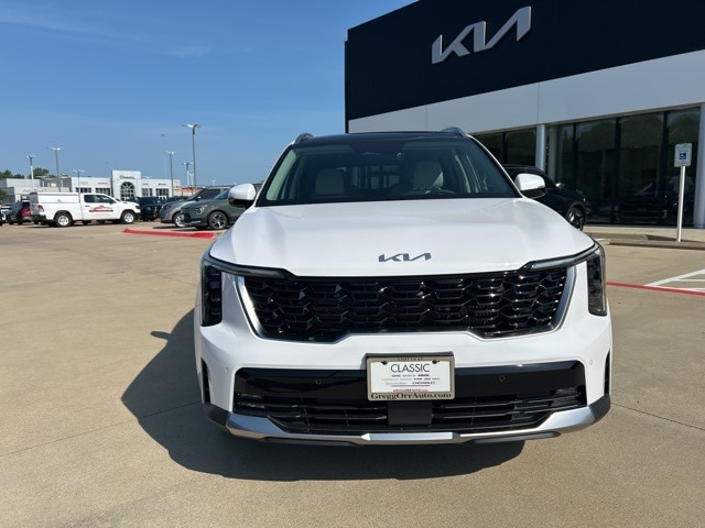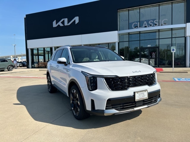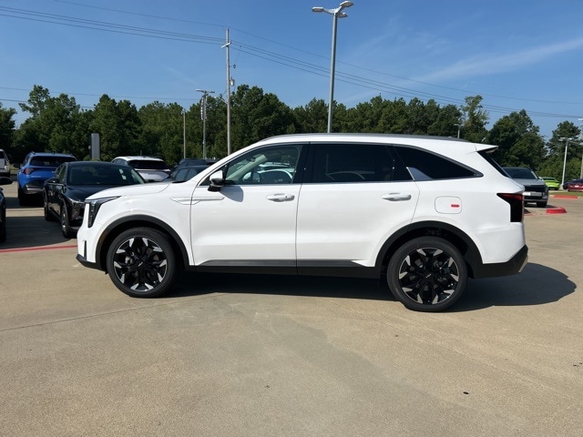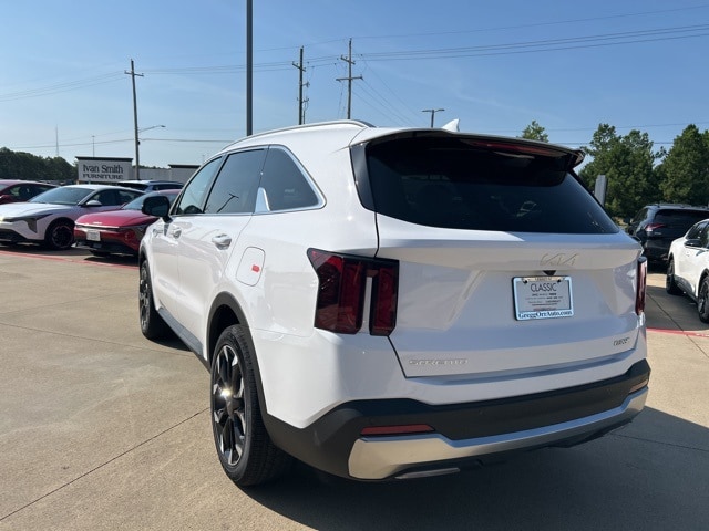 The 2025 Kia Sorento comes with the following features; Panoramic Sunroof Package (LED Interior Lighting and Panoramic Power Sunroof w/Power Sunshade), 3rd row seats: split-bench, 4-Wheel Disc Brakes, 6 Speakers, ABS brakes, Air Conditioning, Alloy wheels, AM/FM radio: SiriusXM, Apple CarPlay & Android Auto, Auto High-beam Headlights, Auto-dimming Rear-View mirror, Automatic temperature control, Brake assist, Bumpers: body-color, Carpeted Floor Mats, Delay-off headlights, Driver door bin, Driver vanity mirror, Dual front impact airbags, Dual front side impact airbags, Electronic Stability Control, Emergency communication system: 911 Connect, Exterior Parking Camera Rear, Four wheel independent suspension, Front anti-roll bar, Front Bucket Seats, Front Center Armrest, Front dual zone A/C, Front fog lights, Front reading lights, Fully automatic headlights, Heated door mirrors, Heated Front Bucket Seats, Heated front seats, Illuminated entry, Knee airbag, Leather Shift Knob, Leather steering wheel, Low tire pressure warning, Navigation System, Occupant sensing airbag, Outside temperature display, Overhead airbag, Overhead console, Panic alarm, Passenger door bin, Passenger vanity mirror, Power door mirrors, Power driver seat, Power Liftgate, Power passenger seat, Power steering, Power windows, Radio data system, Radio: AM/FM Standard Sound System, Rear anti-roll bar, Rear reading lights, Rear side impact airbag, Rear window defroster, Rear window wiper, Remote keyless entry, Security system, Speed control, Speed-sensing steering, Split folding rear seat, Spoiler, Steering wheel mounted audio controls, SynTex Artificial Leather Seat Trim, Tachometer, Telescoping steering wheel, Tilt steering wheel, Traction control, Trip computer, Turn signal indicator mirrors, Variably intermittent wipers, and Wheels: 20" Machine-Finished Gloss Black Alloy.