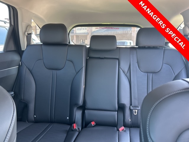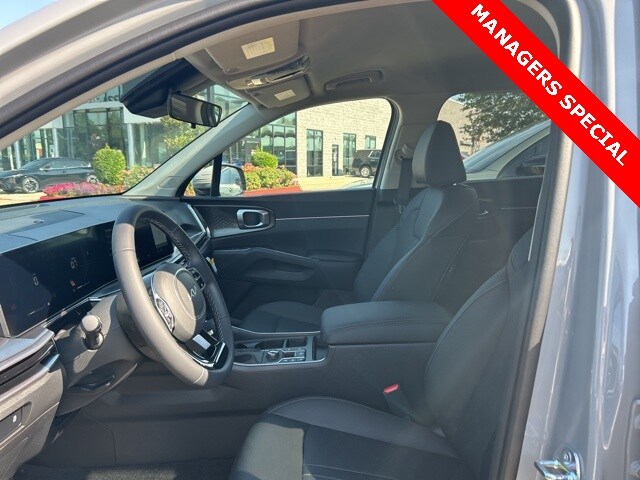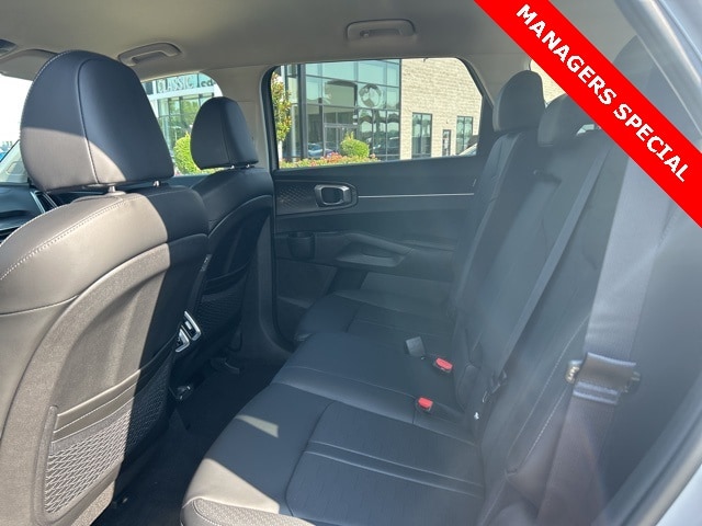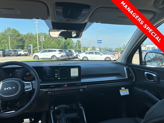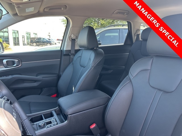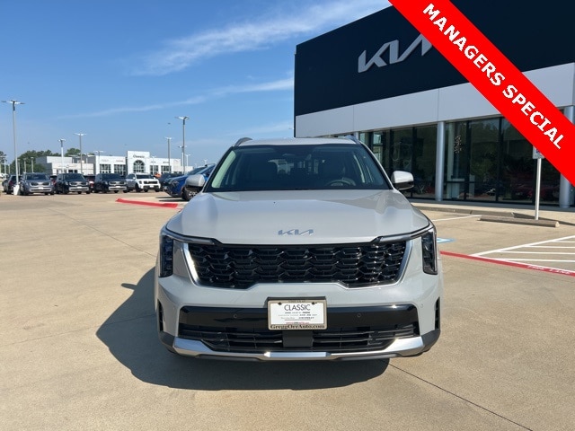 The 2025 Kia Sorento comes with the following features; 3rd row seats: split-bench, 4-Wheel Disc Brakes, 6 Speakers, ABS brakes, Air Conditioning, Alloy wheels, AM/FM radio: SiriusXM, Apple CarPlay & Android Auto, Auto High-beam Headlights, Automatic temperature control, Brake assist, Bumpers: body-color, Cargo Tray, Carpeted Floor Mats, Delay-off headlights, Driver door bin, Driver vanity mirror, Dual front impact airbags, Dual front side impact airbags, Electronic Stability Control, Emergency communication system: 911 Connect, Exterior Parking Camera Rear, Four wheel independent suspension, Front anti-roll bar, Front Bucket Seats, Front Center Armrest, Front dual zone A/C, Front reading lights, Fully automatic headlights, Heated door mirrors, Heated Front Bucket Seats, Heated front seats, Illuminated entry, Knee airbag, Leather Shift Knob, Leather steering wheel, Low tire pressure warning, Navigation System, Occupant sensing airbag, Outside temperature display, Overhead airbag, Overhead console, Panic alarm, Passenger door bin, Passenger vanity mirror, Power door mirrors, Power driver seat, Power steering, Power windows, Radio data system, Radio: AM/FM Standard Sound System, Rear anti-roll bar, Rear reading lights, Rear seat center armrest, Rear side impact airbag, Rear window defroster, Rear window wiper, Remote keyless entry, Security system, Speed control, Speed-sensing steering, Split folding rear seat, Spoiler, Steering wheel mounted audio controls, SynTex Artificial Leather Seat Trim, Tachometer, Telescoping steering wheel, Tilt steering wheel, Traction control, Trip computer, Turn signal indicator mirrors, Variably intermittent wipers, and Wheels: 18" Gloss Black Alloy.