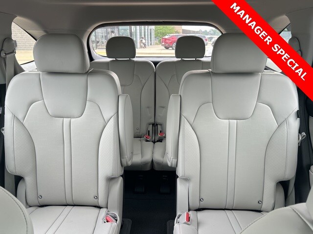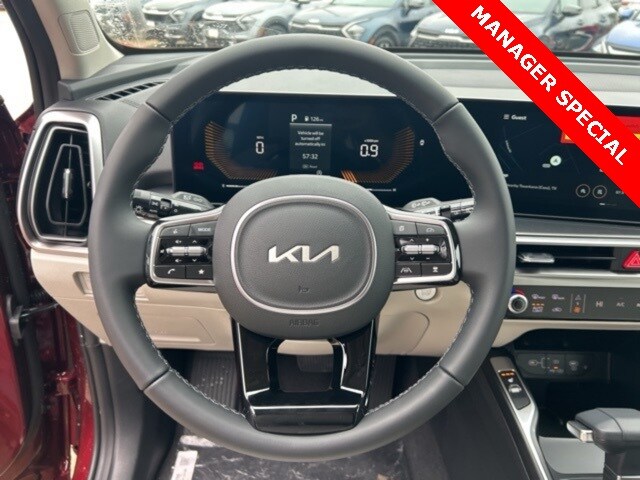 The 2025 Kia Sorento comes with the following features; Panoramic Sunroof Package (LED Interior Lighting and Panoramic Power Sunroof w/Power Sunshade), 3rd row seats: split-bench, 4-Wheel Disc Brakes, 6 Speakers, ABS brakes, Air Conditioning, Alloy wheels, AM/FM radio: SiriusXM, Apple CarPlay & Android Auto, Auto High-beam Headlights, Auto-dimming Rear-View mirror, Automatic temperature control, Black Side Step Bars, Brake assist, Bumpers: body-color, Cargo Net, Carpet Cargo Mat w/Seatback Protection, Carpeted Floor Mats, Chrome Wheel Locks, Delay-off headlights, Driver door bin, Driver vanity mirror, Dual front impact airbags, Dual front side impact airbags, Electronic Stability Control, Emergency communication system: 911 Connect, Exterior Parking Camera Rear, Four wheel independent suspension, Front anti-roll bar, Front Bucket Seats, Front Center Armrest, Front dual zone A/C, Front fog lights, Front reading lights, Front Skid Plate, Fully automatic headlights, Heated door mirrors, Heated Front Bucket Seats, Heated front seats, Illuminated entry, Illuminated Hatch Sill Plate, Knee airbag, Leather Shift Knob, Leather steering wheel, Low tire pressure warning, Mudguards, Navigation System, Occupant sensing airbag, Outside temperature display, Overhead airbag, Overhead console, Panic alarm, Passenger door bin, Passenger vanity mirror, Power door mirrors, Power driver seat, Power Liftgate, Power passenger seat, Power steering, Power windows, Radio data system, Radio: AM/FM Standard Sound System, Rear anti-roll bar, Rear reading lights, Rear side impact airbag, Rear window defroster, Rear window wiper, Remote keyless entry, Security system, Speed control, Speed-sensing steering, Split folding rear seat, Spoiler, Steering wheel mounted audio controls, SynTex Artificial Leather Seat Trim, Tachometer, Telescoping steering wheel, Tilt steering wheel, Traction control, Trip computer, Turn signal indicator mirrors, Variably intermittent wipers, and Wheels: 20" Machine-Finished Gloss Black Alloy.