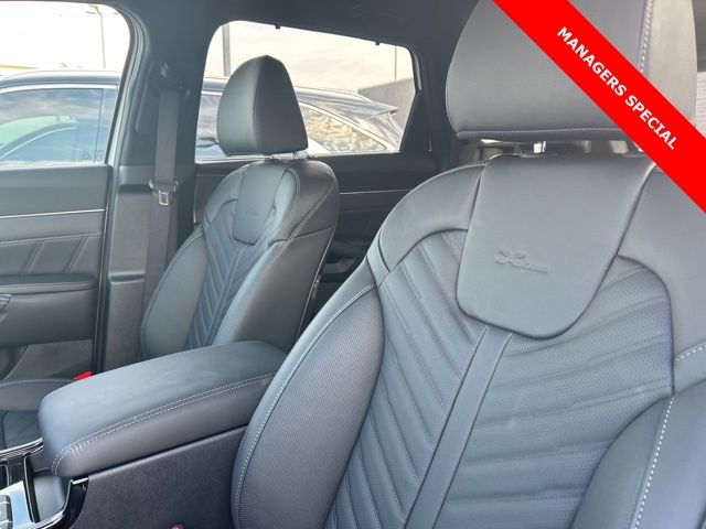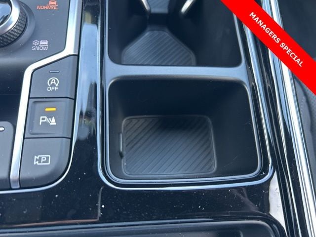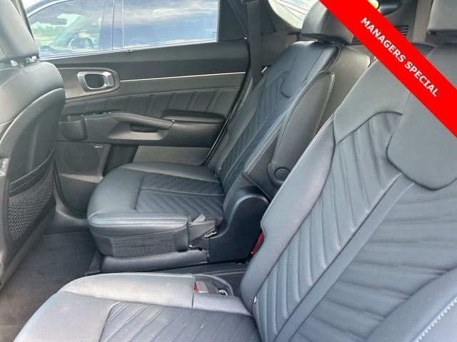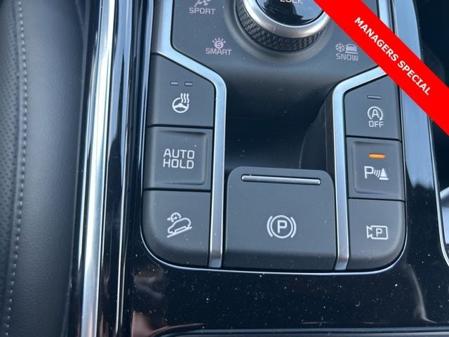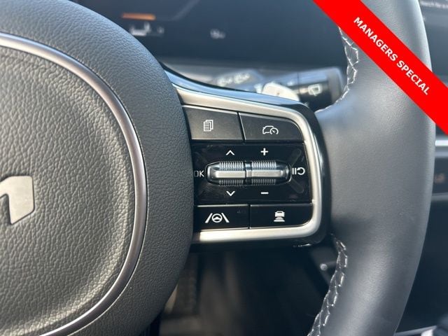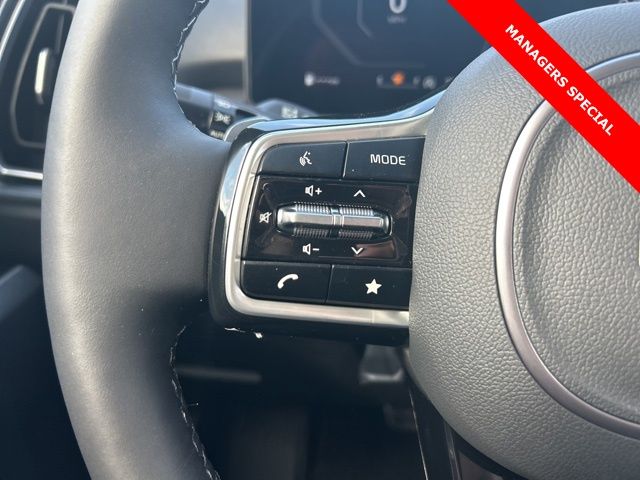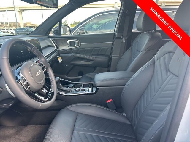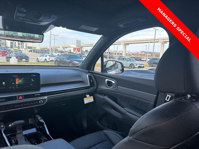 The 2025 Kia Sorento comes with the following features; AWD, 12 Speakers, 3rd row seats: split-bench, 4-Wheel Disc Brakes, ABS brakes, Air Conditioning, Alloy wheels, AM/FM radio: SiriusXM, Apple CarPlay & Android Auto, Auto High-beam Headlights, Auto-dimming Rear-View mirror, Automatic temperature control, Brake assist, Bumpers: body-color, Cargo Tray, Carpeted Floor Mats, Delay-off headlights, Driver door bin, Driver vanity mirror, Dual front impact airbags, Dual front side impact airbags, Electronic Stability Control, Emergency communication system: 911 Connect, Exterior Parking Camera Rear, Four wheel independent suspension, Front anti-roll bar, Front Bucket Seats, Front Center Armrest, Front dual zone A/C, Front fog lights, Front reading lights, Fully automatic headlights, Garage door transmitter: HomeLink, Heated & Ventilated Front Bucket Seats, Heated door mirrors, Heated front seats, Heated rear seats, Heated steering wheel, Illuminated entry, Knee airbag, Leather Shift Knob, Leather steering wheel, Low tire pressure warning, Memory seat, Navigation System, Occupant sensing airbag, Outside temperature display, Overhead airbag, Overhead console, Panic alarm, Passenger door bin, Passenger vanity mirror, Perforated Genuine Leather Seat Trim, Power door mirrors, Power driver seat, Power Liftgate, Power moonroof, Power passenger seat, Power steering, Power windows, Radio data system, Radio: AM/FM Bose Premium Audio System, Rain sensing wipers, Rear anti-roll bar, Rear reading lights, Rear side impact airbag, Rear window defroster, Rear window wiper, Remote keyless entry, Roadside Assistance Kit, Security system, Speed control, Speed-sensing steering, Split folding rear seat, Spoiler, Steering wheel mounted audio controls, Tachometer, Telescoping steering wheel, Tilt steering wheel, Traction control, Trip computer, Turn signal indicator mirrors, Variably intermittent wipers, Ventilated front seats, and Wheels: 20" Gloss Black X-Line Alloy. AWD.
