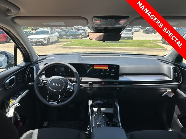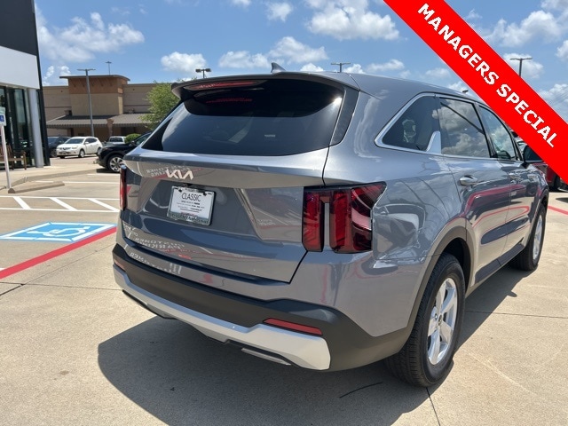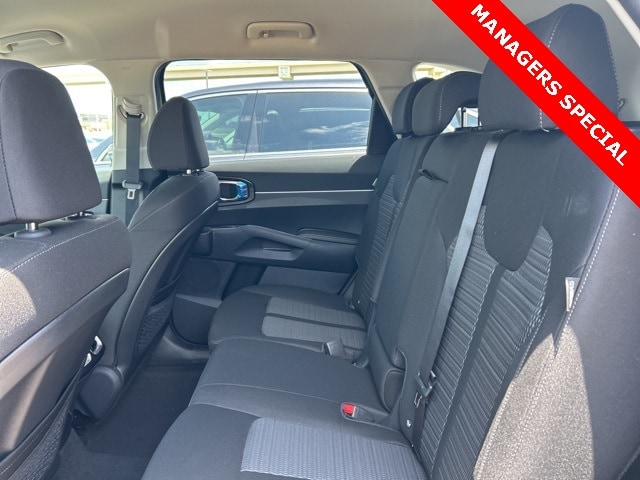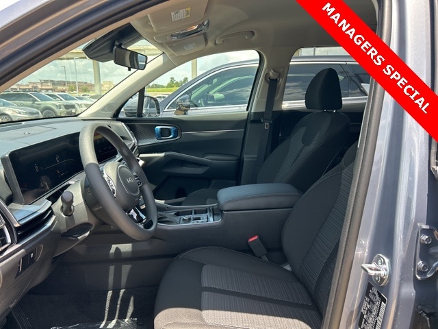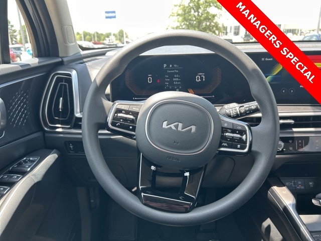 The 2025 Kia Sorento comes with the following features; 17" Alloy Wheels, 3rd row seats: split-bench, 4-Wheel Disc Brakes, 6 Speakers, ABS brakes, Air Conditioning, Alloy wheels, AM/FM radio: SiriusXM, Apple CarPlay & Android Auto, Auto High-beam Headlights, Brake assist, Bumpers: body-color, Cargo Net, Carpeted Floor Mats, Cloth Seat Trim, Delay-off headlights, Driver door bin, Driver vanity mirror, Dual front impact airbags, Dual front side impact airbags, Electronic Stability Control, Emergency communication system: 911 Connect, Exterior Parking Camera Rear, Four wheel independent suspension, Front anti-roll bar, Front Bucket Seats, Front Center Armrest, Front reading lights, Fully automatic headlights, Heated door mirrors, Illuminated entry, Knee airbag, Low tire pressure warning, Occupant sensing airbag, Outside temperature display, Overhead airbag, Overhead console, Panic alarm, Passenger door bin, Passenger vanity mirror, Power door mirrors, Power steering, Power windows, Radio data system, Radio: AM/FM Standard Sound System, Rear anti-roll bar, Rear reading lights, Rear seat center armrest, Rear side impact airbag, Rear window defroster, Rear window wiper, Remote keyless entry, Security system, Speed control, Speed-sensing steering, Split folding rear seat, Spoiler, Steering wheel mounted audio controls, Tachometer, Telescoping steering wheel, Tilt steering wheel, Traction control, Trip computer, Turn signal indicator mirrors, and Variably intermittent wipers.