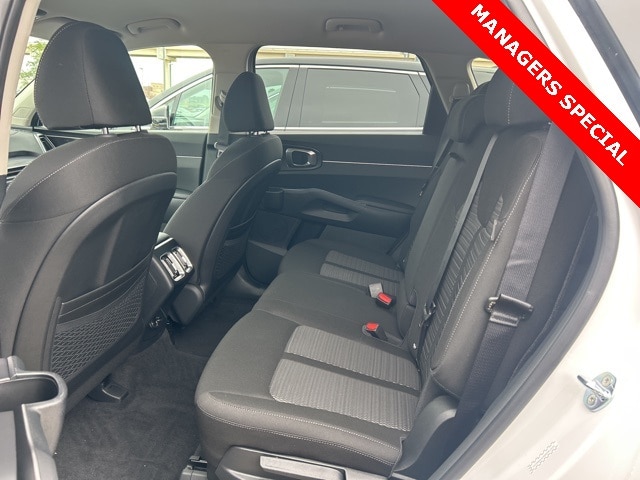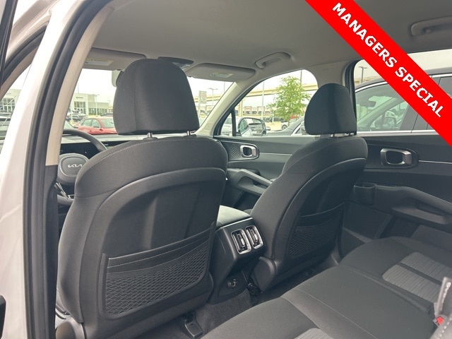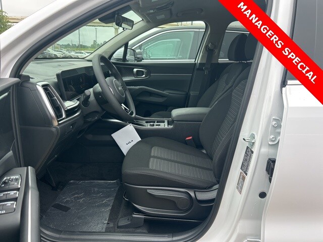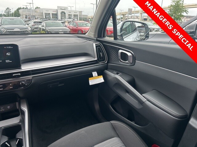 The 2025 Kia Sorento comes with the following features; 17" Alloy Wheels, 3rd row seats: split-bench, 4-Wheel Disc Brakes, 6 Speakers, ABS brakes, Air Conditioning, Alloy wheels, AM/FM radio: SiriusXM, Apple CarPlay & Android Auto, Auto High-beam Headlights, Brake assist, Bumpers: body-color, Cloth Seat Trim, Delay-off headlights, Driver door bin, Driver vanity mirror, Dual front impact airbags, Dual front side impact airbags, Electronic Stability Control, Emergency communication system: 911 Connect, Exterior Parking Camera Rear, Four wheel independent suspension, Front anti-roll bar, Front Bucket Seats, Front Center Armrest, Front reading lights, Fully automatic headlights, Heated door mirrors, Illuminated entry, Knee airbag, Low tire pressure warning, Occupant sensing airbag, Outside temperature display, Overhead airbag, Overhead console, Panic alarm, Passenger door bin, Passenger vanity mirror, Power door mirrors, Power steering, Power windows, Radio data system, Radio: AM/FM Standard Sound System, Rear anti-roll bar, Rear reading lights, Rear seat center armrest, Rear side impact airbag, Rear window defroster, Rear window wiper, Remote keyless entry, Security system, Speed control, Speed-sensing steering, Split folding rear seat, Spoiler, Steering wheel mounted audio controls, Tachometer, Telescoping steering wheel, Tilt steering wheel, Traction control, Trip computer, Turn signal indicator mirrors, and Variably intermittent wipers.