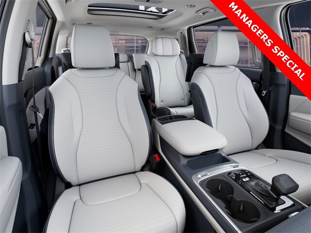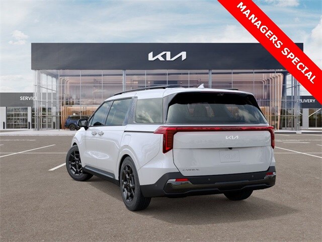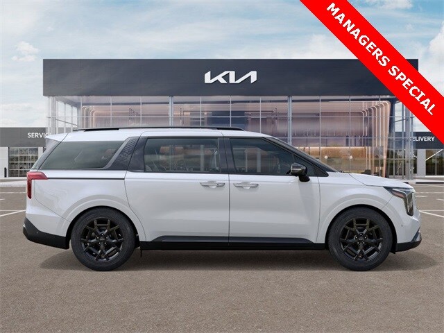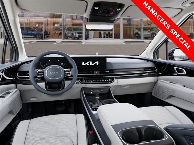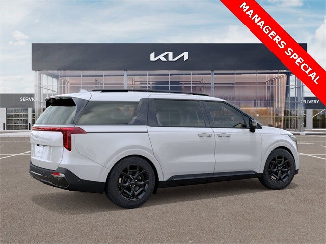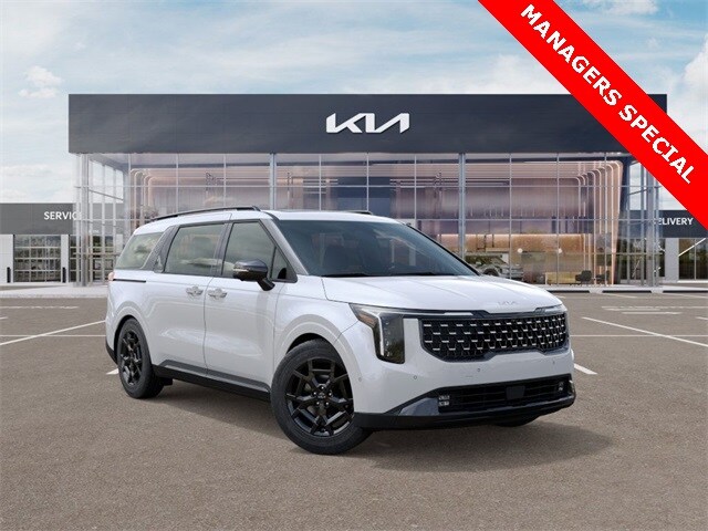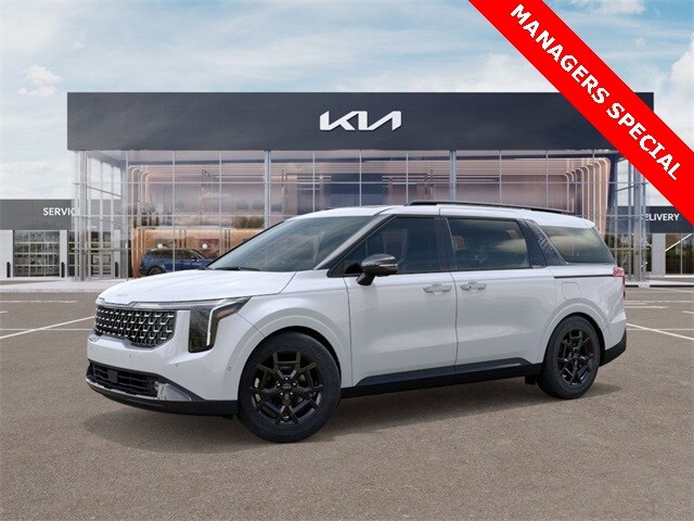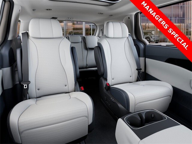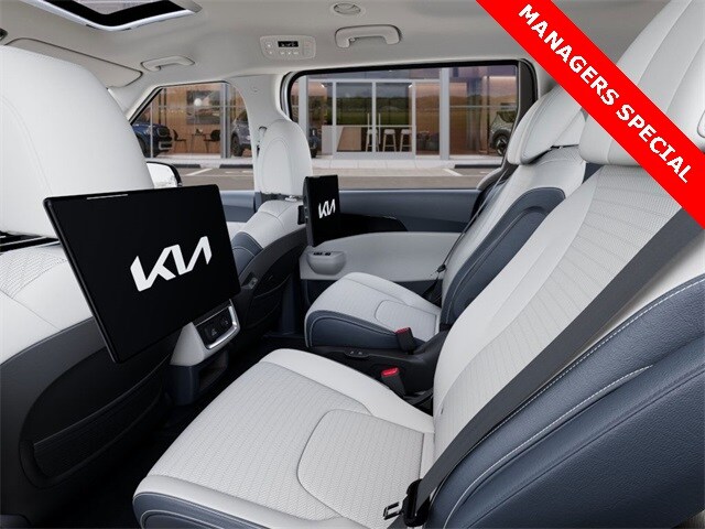 The 2026 Kia Carnival comes with the following features; Rear Seat Entertainment Package (Dual Screen Rear Seat Entertainment System), SX Prestige Seat Package (2nd Row Laminated Windows, Ambient Lighting, Heated/Ventilated 2nd Row Power Seats, and High Glossy Interior Trim), 12 Speakers, 3.51 Axle Ratio, 3rd row seats: split-bench, 4-Wheel Disc Brakes, ABS brakes, Air Conditioning, Alloy wheels, AM/FM radio: SiriusXM, Apple CarPlay & Android Auto, Auto High-beam Headlights, Auto-dimming Rear-View mirror, Automatic temperature control, Brake assist, Bumpers: body-color, Compass, Delay-off headlights, Driver door bin, Driver vanity mirror, Dual front impact airbags, Dual front side impact airbags, Electronic Stability Control, Emergency communication system, Exterior Parking Camera Rear, Four wheel independent suspension, Front anti-roll bar, Front Bucket Seats, Front Center Armrest, Front dual zone A/C, Front fog lights, Front reading lights, Fully automatic headlights, Garage door transmitter: HomeLink, Heads-Up Display, Heated & Ventilated Front Bucket Seats, Heated door mirrors, Heated front seats, Heated steering wheel, Illuminated entry, Knee airbag, Leather Shift Knob, Leather steering wheel, Low tire pressure warning, Memory seat, Navigation System, Occupant sensing airbag, Outside temperature display, Overhead airbag, Overhead console, Panic alarm, Passenger door bin, Passenger vanity mirror, Power 2nd-Row Moonroof, Power door mirrors, Power driver seat, Power Liftgate, Power moonroof, Power passenger seat, Power steering, Power windows, Pure Leather Seat Trim, Radio: AM/FM/HD Audio System, Rain sensing wipers, Rear air conditioning, Rear anti-roll bar, Rear reading lights, Rear window defroster, Rear window wiper, Reclining 3rd row seat, Remote keyless entry, Security system, Speed control, Speed-sensing steering, Split folding rear seat, Spoiler, Steering wheel mounted audio controls, Tachometer, Telescoping steering wheel, Tilt steering wheel, Traction control, Trip computer, Turn signal indicator mirrors, Variably intermittent wipers, Ventilated front seats, and Wheels: 7.5J x 19" Alloy Dark Edition.