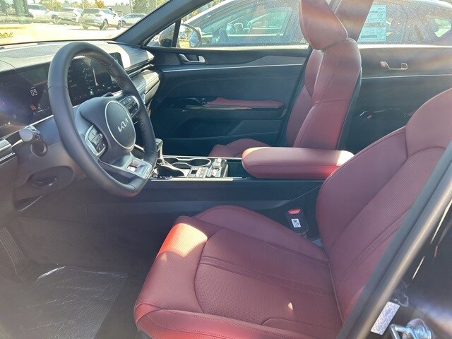 The 2026 Kia K5 comes with the following features; GT-Line Premium Package (Active Sound Design, Bose Premium Audio, LED Interior Lighting, Panoramic Sunroof, and Wheels: 18" x 7.5J Unique Gloss Black Alloy), GT-Line Red Interior Package (SynTex Seat Trim), 4-Wheel Disc Brakes, 6 Speakers, ABS brakes, Air Conditioning, Alloy wheels, AM/FM radio: SiriusXM, Auto High-beam Headlights, Automatic temperature control, Brake assist, Bumpers: body-color, Delay-off headlights, Driver door bin, Driver vanity mirror, Dual front impact airbags, Dual front side impact airbags, Electronic Stability Control, Emergency communication system: Kia Connect (includes 1 year free trial), Four wheel independent suspension, Front anti-roll bar, Front Bucket Seats, Front Center Armrest, Front dual zone A/C, Front fog lights, Front reading lights, Fully automatic headlights, Heated door mirrors, Heated Front Bucket Seats, Heated front seats, Heated steering wheel, Illuminated entry, Knee airbag, Leather Shift Knob, Leather steering wheel, Low tire pressure warning, Navigation System, Occupant sensing airbag, Outside temperature display, Overhead airbag, Overhead console, Panic alarm, Passenger door bin, Passenger vanity mirror, Power door mirrors, Power driver seat, Power steering, Power windows, Radio data system, Radio: AM/FM Audio System, Rear anti-roll bar, Rear seat center armrest, Rear side impact airbag, Rear window defroster, Remote keyless entry, Security system, Speed control, Speed-sensing steering, Split folding rear seat, Sport steering wheel, Steering wheel mounted audio controls, Tachometer, Telescoping steering wheel, Tilt steering wheel, Traction control, Trip computer, Turn signal indicator mirrors, Variably intermittent wipers, and Wheels: 18" x 7.5J Gloss Black Machined Finish Alloy.