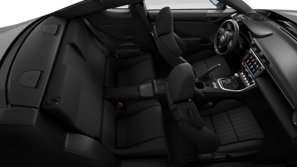 - 7-in. Thin-Film Transistor (TFT) GR digital gauge cluster with LCD Multi-Information Display (MID) GR logo and boxer engine animations on start-up and the following vehicle data: central tachometer with Sport and Track Modes, GR86 Active Safety information, odometer, twin tripmeters, outside ambient temperature, engine coolant/oil temperatures, average trip speed, driving time and miles covered, stopwatch/lap timer, current/average fuel consumption, rpm and hp/torque curves, instantaneous and historical G-force friction circle with digital readout