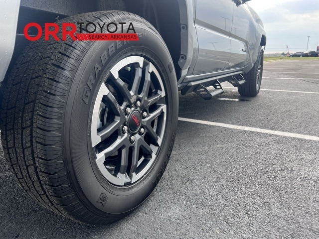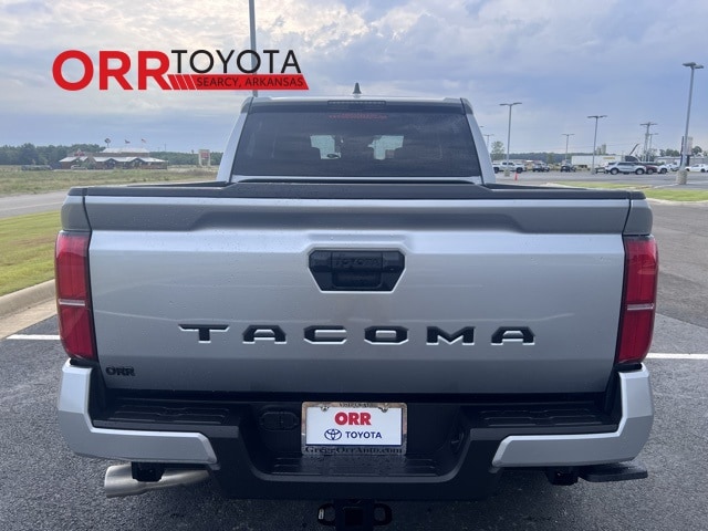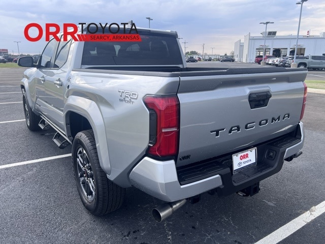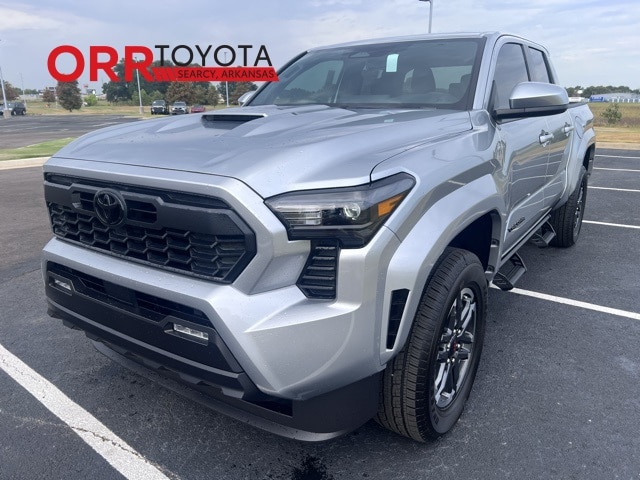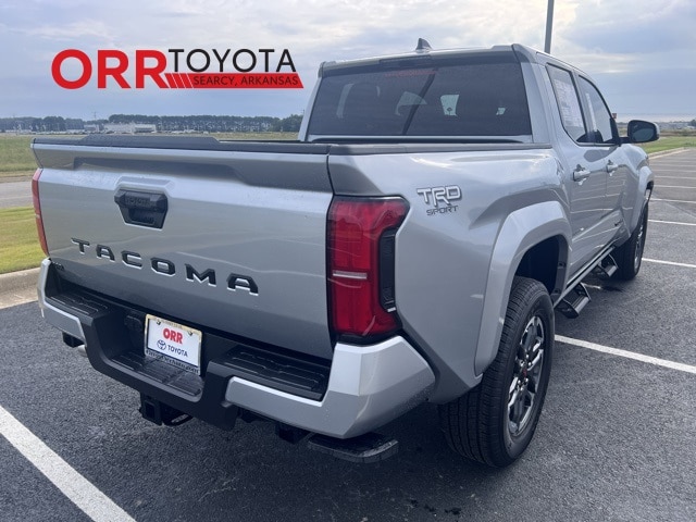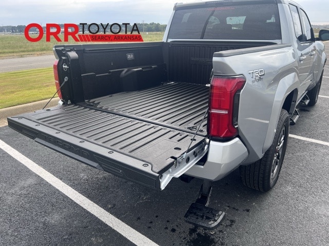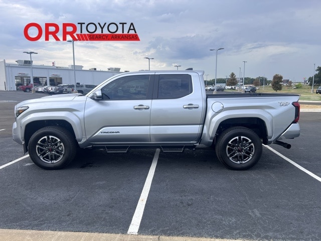 Silver 2025 Toyota Tacoma TRD Sport RWD 8-Speed Automatic 2.4L 4-Cylinder This Tacoma TRD Sport is nicely equipped with TRD Sport Package, 3.583 Axle Ratio, 4-Wheel Disc Brakes, 6 Speakers, ABS brakes, Air Conditioning, Alloy wheels, AM/FM radio: SiriusXM, Anti-whiplash front head restraints, Apple CarPlay/Android Auto, Auto High-beam Headlights, Auto-dimming Rear-View mirror, Automatic temperature control, Bed Step (TMS), Brake assist, Bumpers: body-color, Driver door bin, Driver vanity mirror, Dual front impact airbags, Dual front side impact airbags, Electronic Stability Control, Emergency communication system: Safety Connect (1-year trial), Exterior Parking Camera Rear, Fabric Seat Trim, Four wheel independent suspension, Front anti-roll bar, Front Bucket Seats, Front Center Armrest, Front fog lights, Front reading lights, Fully automatic headlights, Heated door mirrors, Illuminated entry, Knee airbag, Leather Shift Knob, Leather steering wheel, Low tire pressure warning, Occupant sensing airbag, Outside temperature display, Overhead airbag, Overhead console, Panic alarm, Passenger door bin, Passenger vanity mirror, Power door mirrors, Power steering, Power windows, Predator Step (TMS), Radio: 8" Toyota Audio Multimedia, Radio: Premium Audio w/14" Display, Rear step bumper, Rear window defroster, Remote keyless entry, Security system, Speed control, Speed-sensing steering, Split folding rear seat, Spray-On Bed Liner (TMS), Steering wheel mounted audio controls, Tachometer, Telescoping steering wheel, Tilt steering wheel, Traction control, Trip computer, Turn signal indicator mirrors, Variably intermittent wipers, and Wheels: 18" TRD Sport Alloy.