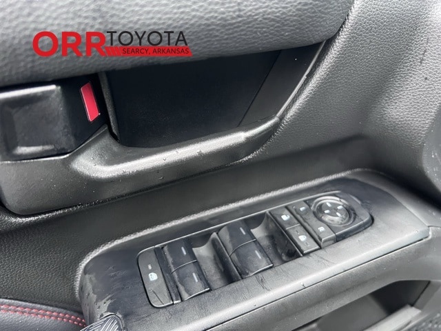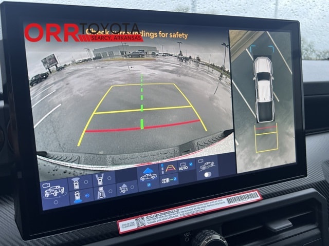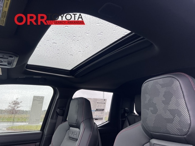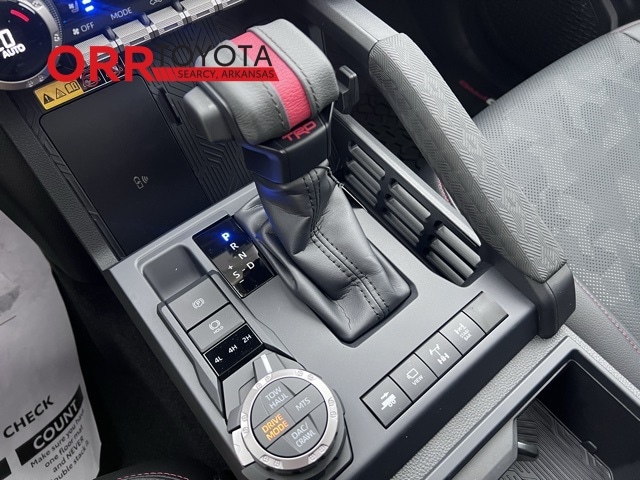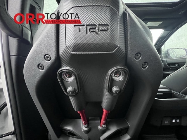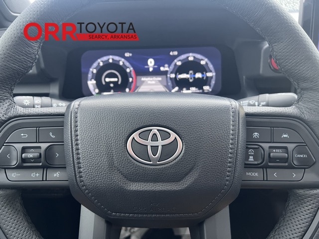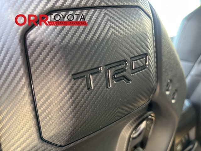 - TRD Pro leather-trimmed manual tilt/telescopic steering wheel with TRD badge, red center stripe, and phone, audio, display/infotainment, and Driver Assist controls