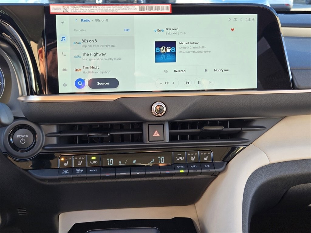 Included Features: Advanced Technology Package (Digital Key Capability, Front Cross-Traffic Alert, Lane Change Assist, Panoramic View Monitor, Traffic Jam Assist, and Wheels: 21" 10-Spoke Dark Metallic Alloy), Limited Package, 11 Speakers, 4-Wheel Disc Brakes, 8-Way Adjustable Heated/Ventilated Front Seats, ABS brakes, Air Conditioning, Alloy wheels, AM/FM radio: SiriusXM, Apple CarPlay/Android Auto, Auto High-beam Headlights, Auto-dimming Rear-View mirror, Automatic temperature control, Bodyside moldings, Brake assist, Bumpers: body-color, Compass, Delay-off headlights, Driver door bin, Driver vanity mirror, Dual front impact airbags, Dual front side impact airbags, Electronic Stability Control, Emergency communication system: Safety Connect (5-year minimum), Exterior Parking Camera Rear, Four wheel independent suspension, Front anti-roll bar, Front Bucket Seats, Front Center Armrest, Front dual zone A/C, Front reading lights, Fully automatic headlights, Garage door transmitter: HomeLink, Heated door mirrors, Heated front seats, Heated rear seats, Heated steering wheel, Illuminated entry, Knee airbag, Leather Seat Trim, Leather Shift Knob, Leather steering wheel, Low tire pressure warning, Memory seat, Navigation system: Dynamic Navigation (3-year trial), Occupant sensing airbag, Outside temperature display, Overhead airbag, Overhead console, Panic alarm, Passenger door bin, Passenger vanity mirror, Power door mirrors, Power driver seat, Power passenger seat, Power steering, Power windows, Radio data system, Radio: 12.3" Toyota Audio Multimedia, Rain sensing wipers, Rear anti-roll bar, Rear reading lights, Rear seat center armrest, Rear window defroster, Remote keyless entry, Security system, Speed control, Speed-sensing steering, Split folding rear seat, Steering wheel mounted audio controls, Tachometer, Telesc