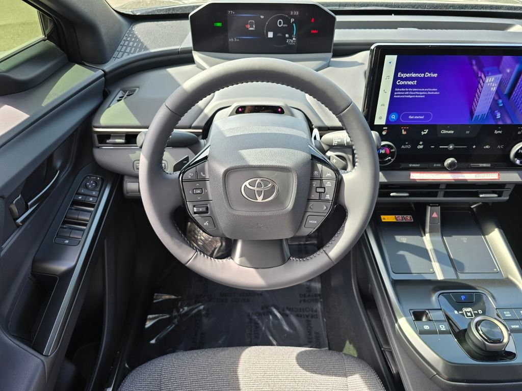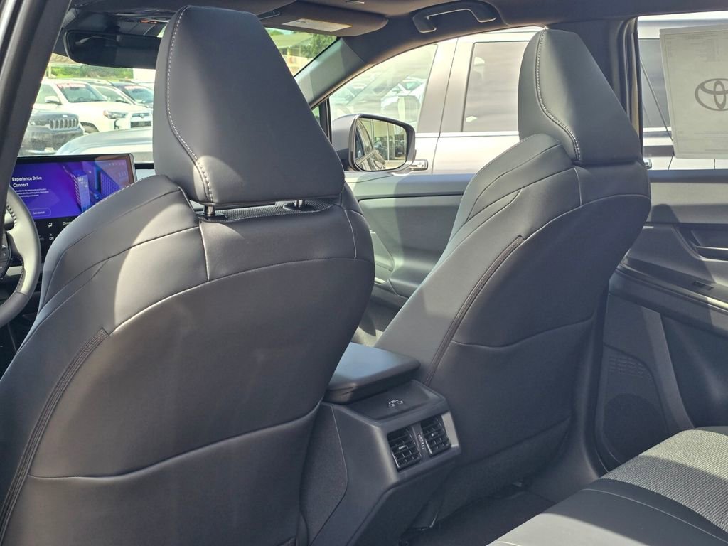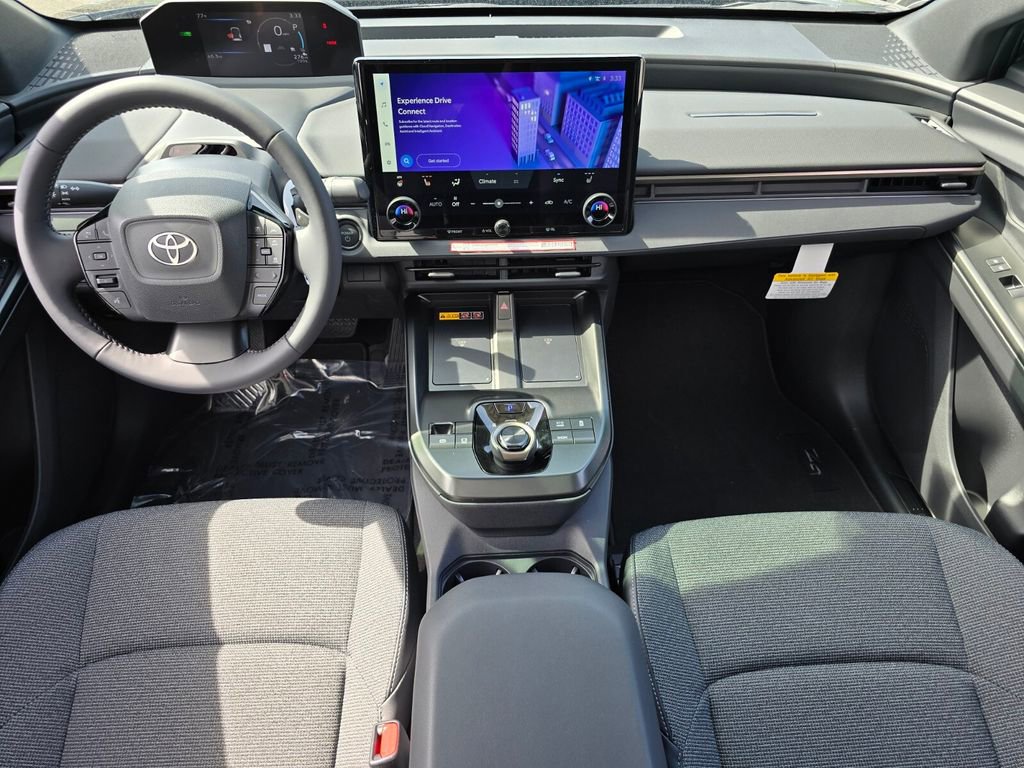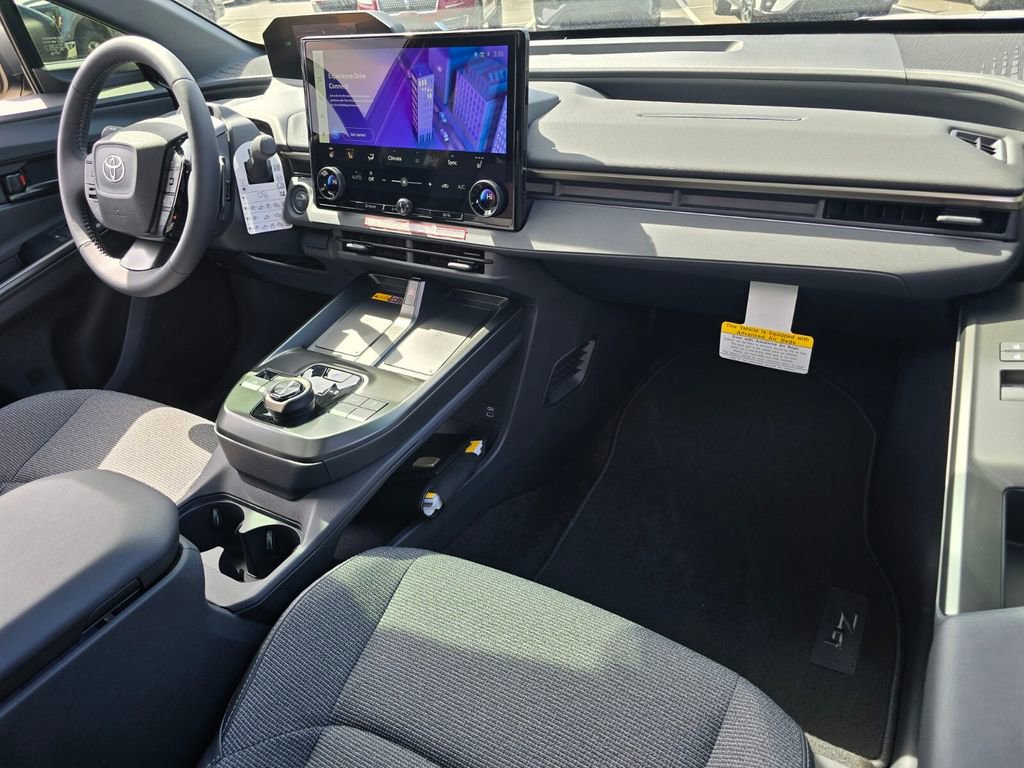 Midnight Black This 2026 Toyota bZ comes equipped with, 4-Wheel Disc Brakes, 6 Speakers, ABS brakes, Air Conditioning, Alloy wheels, AM/FM radio: SiriusXM, Apple CarPlay/Android Auto, Auto High-beam Headlights, Auto-dimming Rear-View mirror, Automatic temperature control, Brake assist, Bumpers: body-color, Delay-off headlights, Driver door bin, Driver vanity mirror, Dual front impact airbags, Dual front side impact airbags, Electronic Stability Control, Emergency communication system: Safety Connect (10-year trial), Exterior Parking Camera Rear, Fabric/SofTex Seat Trim, Four wheel independent suspension, Front anti-roll bar, Front Bucket Seats, Front Center Armrest, Front dual zone A/C, Front reading lights, Fully automatic headlights, Garage door transmitter: HomeLink, Heated door mirrors, Heated Front Seats, Heated front seats, Heated steering wheel, Illuminated entry, Knee airbag, Leather steering wheel, Low tire pressure warning, Navigation system: Drive Connect (3 year trial) includes Cloud Navigation with real time traffic and Google POI, Occupant sensing airbag, Outside temperature display, Overhead airbag, Overhead console, Panic alarm, Passenger door bin, Passenger vanity mirror, Power door mirrors, Power driver seat, Power Liftgate, Power steering, Power windows, Radio data system, Radio: 14" Toyota Audio Multimedia, Rain sensing wipers, Rear anti-roll bar, Rear seat center armrest, Rear window defroster, Remote keyless entry, Security system, Speed control, Speed-sensing steering, Split folding rear seat, Spoiler, Steering wheel mounted audio controls, Telescoping steering wheel, Tilt steering wheel, Traction control, Trip computer, Turn signal indicator mirrors, Variably intermittent wipers, Wheels: 18" Alloy with Covers. 143/119 City/Highway MPG