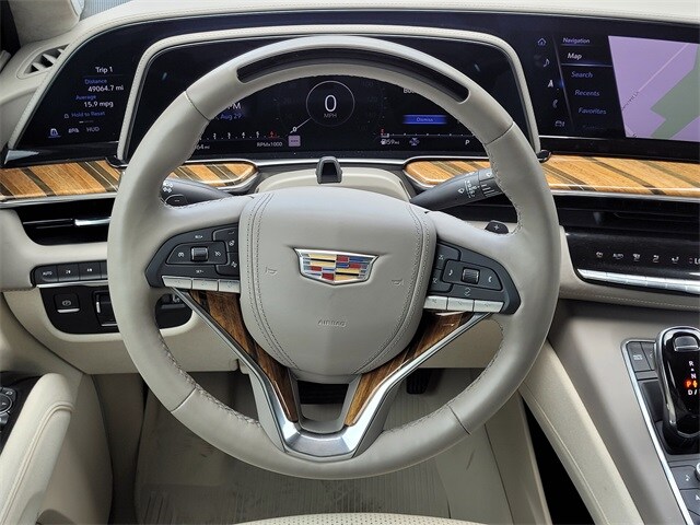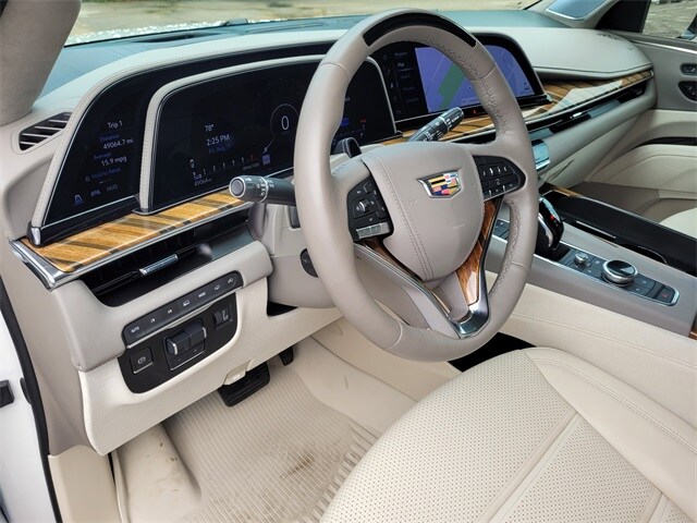 This 2023 Cadillac Escalade ESV comes equipped with All-Weather Floor Liner Package (LPO), Floor Liner Package (LPO) (All-Weather Integrated Cargo Liner (LPO)), Preferred Equipment Group 1SH (Adaptive Cruise Control, AKG Studio Reference 36-Speaker Audio System, Automatic Seat Belt Tightening, Body-Color Door Handles, Door Lock & Latch Shields, Electronic Limited-Slip Differential, Enhanced Automatic Emergency Braking, Enhanced Automatic Parking Assist, Floor Console w/Covered Storage, Glass Breakage Sensor, Heated & Ventilated Driver & Front Passenger Seats, Hitch Guidance w/Hitch View, Integrated Trailer Brake Controller, Platinum Interior Trim, Power Lumbar Massage Driver Seat, Power Lumbar Massage Front Passenger Seat, Power Panoramic Tilt-Sliding Sunroof, Rear Camera Mirror, Rear Camera Mirror Washer, Rear Cross Traffic Alert, Rear Seat Entertainment System, Reconfigurable Full-Color Head-Up Display, Reverse Automatic Braking, Running Board Assist Steps, Smart Trailer Integration Indicator, Theft-Deterrent Alarm System, Trailer Side Blind Zone Alert, Vehicle Inclination Sensor, Vehicle Interior Movement Sensor, and Front Auxiliary 12-volt Power Outlet), Touring Package (Air Ride Adaptive Suspension, Illuminating Front & Rear Sill Plates, and Soft Closing Front & Rear Doors), AWD, Navigation System, 16.9" Diagonal OLED Infotainment Screen, 2-Presets Memory For Driver Seat Adjuster, 3 Years of OnStar & Connected Services Plan, 3.23 Axle Ratio, 3rd row seats: split-bench, 4-Way Power Driver Lumbar Seat Adjuster, 4-Way Power Front Passenger Lumbar Seat Adjuster, 4-Wheel Disc Brakes, 8-Way Power Driver Seat Adjuster, 8-Way Power Front Passenger Seat Adjuster, A/V remote, ABS brakes, Adaptive suspension, Air Conditioning, Alloy wheels, AM/FM radio: SiriusXM with 360L, Apple CarPlay/Android Auto, Audio memory, Auto High-beam Headlights, Auto tilt-away steering wheel, Auto-dimming door mirrors, Automatic temperature control, Brake assist, Bumpers: body-color, Compass, Cooled Console w/Covered Storage, Delay-off headlights, Door auto-latch, Driver door bin, Driver vanity mirror, Dual front impact airbags, Dual front side impact airbags, Electronic Stability Control, Emergency communication system: OnStar and Cadillac connected services capable, Exterior Parking Camera Rear, Four wheel independent suspension, Front anti-roll bar, Front Bucket Seats, Front Center Armrest w/Storage, Front dual zone A/C, Front License Plate Bracket, Front reading lights, Full Semi-Aniline Leather Seat Trim, Fully automatic headlights, Garage door transmitter, Genuine wood console insert, Genuine wood dashboard insert, Genuine wood door panel insert, HD Radio, Headphones, Heads-Up Display, Heated door mirrors, Heated Driver & Front Passenger Seats, Heated front seats, Heated rear seats, Heated steering wheel, Illuminated entry, Leather steering wheel, Low tire pressure warning, Magnetic Ride Control Suspension, Memory seat, Not Equipped w/2nd Row Express-Up Window Control, Occupant sensing airbag, Outside temperature display, Overhead airbag, Overhead console, Panic alarm, Passenger door bin, Passenger vanity mirror, Power door mirrors, Power driver seat, Power Liftgate, Power moonroof, Power passenger seat, Power steering, Power windows, Power-Retractable Assist Steps, Radio data system, Radio: AM/FM w/Navigation, Rain sensing wipers, Rear air conditioning, Rear anti-roll bar, Rear audio controls, Rear reading lights, Rear window defroster, Rear window wiper, Remote keyless entry, Security system, SiriusXM w/360L, Speed control, Split folding rear seat, Spoiler, Steering wheel memory, Steering wheel mounted audio controls, Super Cruise, Tachometer, Teen Driver, Telescoping steering wheel, Tilt steering wheel, Traction control, Trip computer, Turn signal indicator mirrors, Variably intermittent wipers, Ventilated front seats, Voltmeter, Wheels: 22" 12-Spoke Polished Alloy, and Wireless Apple CarPlay/Wireless Android Auto. CARFAX One-Owner. Carfax no ac