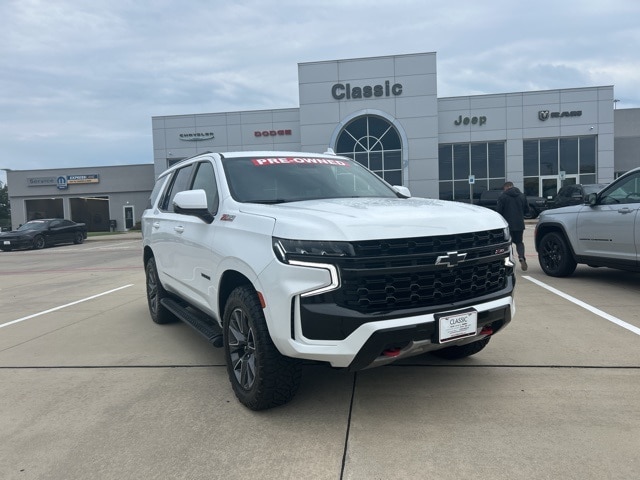 CARFAX One-Owner. Clean CARFAX. Classic CDJR in Texarkana is proud to offer this terrific-looking 2023 Chevrolet Tahoe in Summit White. This 2023 Chevrolet Tahoe comes with the following features; Driver Alert Package (Lane Change Alert w/Side Blind Zone Alert and Rear Cross Traffic Alert), License Plate Front Mounting Package, Luxury Package (2nd Row Pwr Release 60/40 Split-Folding Bench Seat, 3rd Row 60/40 Power-Folding Split-Bench Seat, HD Surround Vision, Heated 2nd Row Outboard Seats, Heated Steering Wheel, Memory Settings, Outside Heated Power-Adjustable Mirrors, Power Tilt & Telescopic Steering Column, and Rear Pedestrian Alert), Preferred Equipment Group 2Z7 (1st & 2nd Row Color-Keyed Carpeted Floor Mats, 2-Speed Active Electronic AutoTrac Transfer Case, Auto-Dimming Inside Rear-View Mirror, Black Tubular Assist Steps, Bose 9-Speaker Stereo Audio System Feature, Bright Front & Rear Door Sill Plates, Color-Keyed Carpeting Floor Covering, Driver & Front Outboard Passenger Airbags, Enhanced Driver Information Center, Floor Console w/Storage Area, Front High-Approach Angle Fascia, Hands-Free Rear Power Programmable Liftgate, Hill Descent Control, Infotainment Display, LED Daytime Running Lamps, Memory Settings for Driver, Red Horizontal-Mounted Recovery Hooks, Remote Start, SiriusXM Radio w/360L, Universal Home Remote, Wireless Charging, and Wrapped Steering Wheel), 4WD, Black Leather, 10-Way Power Driver & Passenger Seat Adjusters, 3.23 Rear Axle Ratio, 3rd row seats: split-bench, 4-Wheel Disc Brakes, 9 Speakers, ABS brakes, Air Conditioning, Alloy wheels, AM/FM radio: SiriusXM with 360L, Apple CarPlay/Android Auto, Auto High-beam Headlights, Auto-dimming Rear-View mirror, Automatic temperature control, Brake assist, Bumpers: body-color, Compass, Delay-off headlights, Driver door bin, Driver vanity mirror, Dual front impact airbags, Dual front side impact airbags, Electronic Stability Control, Emergency communication system: OnStar and Chevrolet connected services capable, Four wheel independent suspension, Front anti-roll bar, Front Bucket Seats, Front Center Armrest, Front dual zone A/C, Front High-Back Reclining Bucket Seats, Front reading lights, Fully automatic headlights, Garage door transmitter, Heated door mirrors, Heated Driver & Front Passenger Seats, Heated front seats, Illuminated entry, Leather-Appointed Seat Trim, Low tire pressure warning, Memory seat, Navigation System, Occupant sensing airbag, Outside temperature display, Overhead airbag, Overhead console, Panic alarm, Passenger door bin, Passenger vanity mirror, Power door mirrors, Power driver seat, Power Liftgate, Power passenger seat, Power Release 2nd Row Bucket Seats, Power steering, Power windows, Premium audio system: Chevrolet Infotainment 3 Premium, Premium Smooth Ride Suspension, Radio: Chevrolet Infotainment 3 Premium System, Rain sensing wipers, Rear air conditioning, Rear anti-roll bar, Rear reading lights, Rear seat center armrest, Rear window defroster, Rear window wiper, Remote keyless entry, Roof rack: rails only, Security system, Speed control, Speed-sensing steering, Split folding rear seat, Spoiler, Steering wheel mounted audio controls, Tachometer, Telescoping steering wheel, Tilt steering wheel, Traction control, Trip computer, Variably intermittent wipers, Voltmeter, and Wheels: 20" x 9" Machined Aluminum. 4WD, Black Leather.