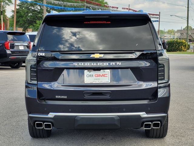 This 2025 Chevrolet Suburban comes equipped with Advanced Security Package (Glass Breakage Sensor, Self-Powered Horn Theft-Deterrent Alarm System, Vehicle Inclination Sensor, and Vehicle Interior Movement Sensor), Advanced Trailering Package (Blind Zone Steering Assist with Trailering, Hitch View with Pan/Zoom Image Adjustment, and Smart Trailer Integration Indicator), High Country Deluxe (Air Ride Adaptive Suspension, Dual-Pane Power Panoramic Sunroof, and Power-Retractable Assist Steps), License Plate Front Mounting Package, Max Trailering Package (2-Speed Active Electronic AutoTrac Transfer Case, Extra Capacity Cooling System, Hill Descent Control, and Integrated Trailer Brake Controller), Preferred Equipment Group 3LZ (15" Diagonal Multi-Color Head-Up Display, 3rd Row 60/40 Power-Folding Split-Bench, 4-Way Power Driver Lumbar Seat Adjuster, 4-Way Power Front Passenger Lumbar Seat Adjuster, 8-Way Power Front Passenger Seat Adjuster, Bose 10-Speaker Surround with CenterPoint, Bright Front and Rear Door Sill Plates, Chrome Door Handles with Body-Color Strip, Dual Exhaust System, Front LED Fog Lamps, Heated 2nd Row Outboard Seats, Heated Driver and Front Passenger Seats, Heated Power-Adjustable Outside Mirrors, Heated Steering Wheel, Inside Rearview Auo-Dimming Rear Camera Mirror, LED Headlamps with LED Daytime Running Lamps, LED Tail Lamps, Magnetic Ride Control Suspension, Memory Settings, Perforated Heated and Ventilated Seats, Power Release 2nd Row Bucket Seats, Power Tilt and Telescopic Steering Column, Power-Sliding Center Floor Console, Rear Power Liftgate, Universal Home Remote, Wheels: 22" x 9" Bright Machined Aluminum, Wireless Phone Charging, and Wheel Locks (set of 4)), Premium Liner Protection Package (3rd Row All-Weather Floor Liners, All-Weather Cargo Mat, and First and Second Rows Premium Floor Liners), Technology & Entertainment Package (Rear Seat Media System), Technology Package (AutoSense Hands-Free Power Liftgate), Navigation system: Google built-in compatibility (select service plan required, terms and limitations apply), 1.5 KW Heater/Defrost Air System, 10 Speakers, 250 Amps Alternator, 3.23 Rear Axle Ratio, 3rd row seats: split-bench, 4-Wheel Disc Brakes, 8-Way Power Driver Seat Adjuster, 850 Cold-Cranking Amps Battery, ABS brakes, Adaptive suspension, Air Conditioning, Alloy wheels, AM/FM radio: SiriusXM with 360L, Apple CarPlay/Android Auto, Auto High-beam Headlights, Auto-dimming door mirrors, Auto-dimming Rear-View mirror, Auto-leveling suspension, Automatic temperature control, Brake assist, Bumpers: body-color, Compass, Delay-off headlights, Diesel B20 Fuel, Driver door bin, Driver vanity mirror, Dual front impact airbags, Dual front side impact airbags, Electronic Stability Control, Emergency communication system: OnStar Services capable, Engine Block Heater, Exterior Parking Camera Rear, Four wheel independent suspension, Front anti-roll bar, Front Bucket Seats, Front Center Armrest, Front dual zone A/C, Front fog lights, Front reading lights, Fully automatic headlights, Garage door transmitter, Heads-Up Display, Heated door mirrors, Heated front seats, Heated rear seats, Heated steering wheel, Illuminated entry, Low tire pressure warning, Memory seat, Occupant sensing airbag, Outside temperature display, Overhead airbag, Overhead console, Panic alarm, Passenger door bin, Passenger vanity mirror, Perforated Leather Seating Surfaces, Power door mirrors, Power driver seat, Power Liftgate, Power passenger seat, Power steering, Power windows, Radio data system, Radio: 17.7" Diagonal Advanced Color LCD Display, Rain sensing wipers, Rear air conditioning, Rear anti-roll bar, Rear reading lights, Rear window defroster, Rear window wiper, Remote keyless entry, Security system, SiriusXM with 360L Trial Subscription, Speed control, Speed-sensing steering, Split folding rear seat, Spoiler, Steering wheel memory, Steering wheel mounted audio controls, Tachometer, Telescoping steering wheel, Tilt steering w