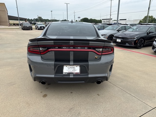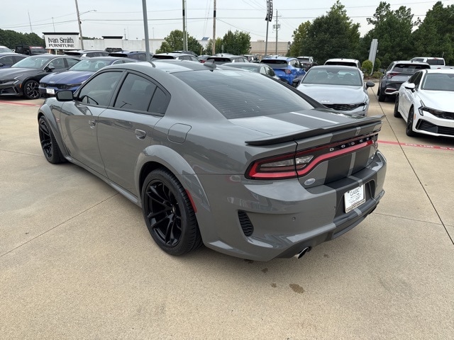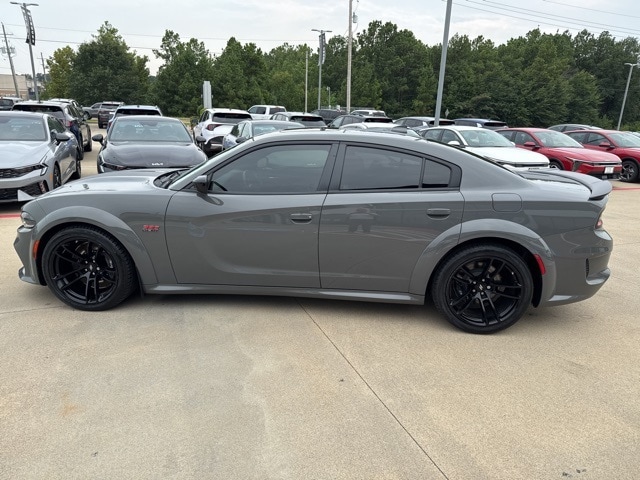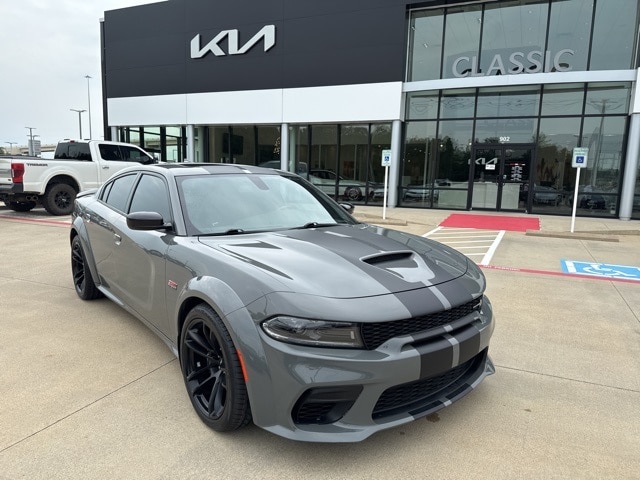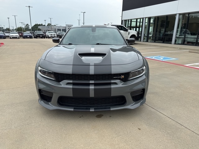 The 2023 Dodge Charger comes with the following features; harman/kardon Audio Group (19 harman/kardon GreenEdge Speakers, harman/kardon GreenEdge Amp, and Surround Sound), Quick Order Package 21V Scat Pack Widebody (All Speed Traction Control, Body Color Fender Flares, Brembo 6-Pot Fixed Front Caliper Brakes, Flat-Bottom Steering Wheel, Performance Shift Indicator, Wheels: 20" x 11" Carbon Black Aluminum, and Widebody Competition Suspension), Widebody Package, Black Cloth, 1-Yr SiriusXM Guardian Trial, 2-Piece Shark Fin Antenna, 4-Wheel Disc Brakes, 4G LTE Wi-Fi Hot Spot, 6 Speakers, 8.4" Touchscreen Display, ABS brakes, Adaptive Damping Suspension (DISC), Air Conditioning, Alloy wheels, AM/FM radio: SiriusXM, Anti-whiplash front head restraints, Apple CarPlay, Apple CarPlay/Android Auto, Auto-dimming Rear-View mirror, Automatic temperature control, Brake assist, Bumpers: body-color, Cloth Performance Seats w/Heat, Compass, Delay-off headlights, Driver door bin, Driver vanity mirror, Dual front impact airbags, Dual front side impact airbags, Dual Stripe - Carbon, Electronic Stability Control, Emergency communication system: SiriusXM Guardian, For Details, Visit DriveUconnect.com, Four wheel independent suspension, Front anti-roll bar, Front Bucket Seats, Front Center Armrest, Front dual zone A/C, Front fog lights, Front reading lights, Fully automatic headlights, Garage door transmitter: HomeLink, Google Android Auto, GPS Antenna Input, HD Radio, Heated door mirrors, Heated Front Seats, Heated front seats, Heated steering wheel, Illuminated entry, Integrated Center Stack Radio, Integrated Voice Command w/Bluetooth, Knee airbag, Leather Shift Knob, Low tire pressure warning, Manufacturer's Statement of Origin, Media Hub (2 USB, AUX), Occupant sensing airbag, Outside temperature display, Overhead airbag, Overhead console, Panic alarm, ParkView Rear Back-Up Camera, Passenger door bin, Passenger vanity mirror, Power 2-Way Driver Lumbar Adjust, Power door mirrors, Power driver seat, Power steering, Power Sunroof, Power windows, Radio: Uconnect 4C w/8.4" Display, Rear anti-roll bar, Rear Armrest w/Cupholder Seat, Rear reading lights, Rear seat center armrest, Rear window defroster, Remote keyless entry, Security system, Speed control, Speed-Sensitive Wipers, Split folding rear seat, Spoiler, Sport steering wheel, Steering wheel mounted audio controls, Tachometer, Telescoping steering wheel, Tilt steering wheel, Traction control, Trip computer, USB Host Flip, Variably intermittent wipers, and Wheels: 20" x 9" Lo Gloss Granite CrystaL. Black Cloth.