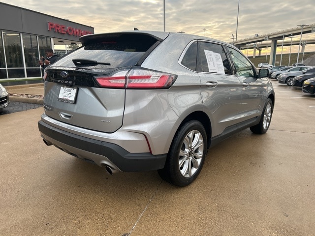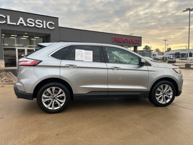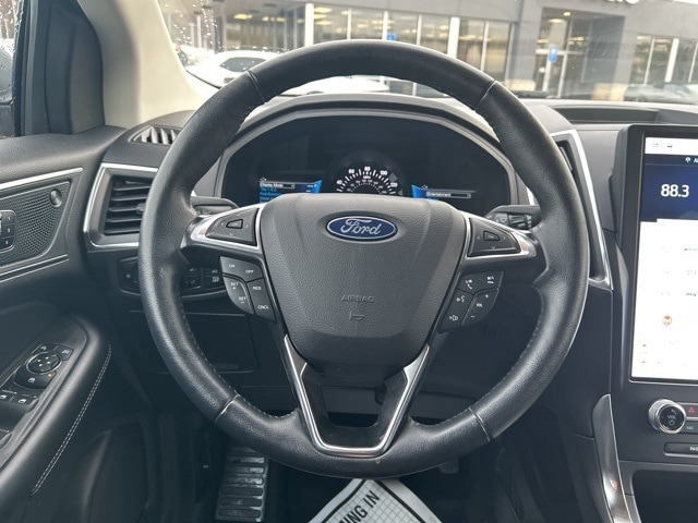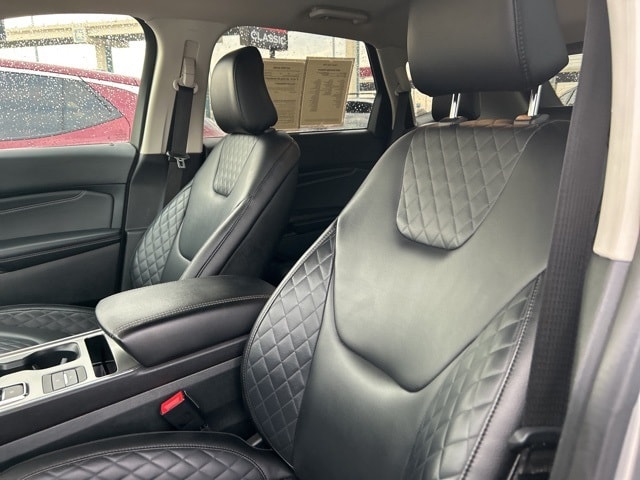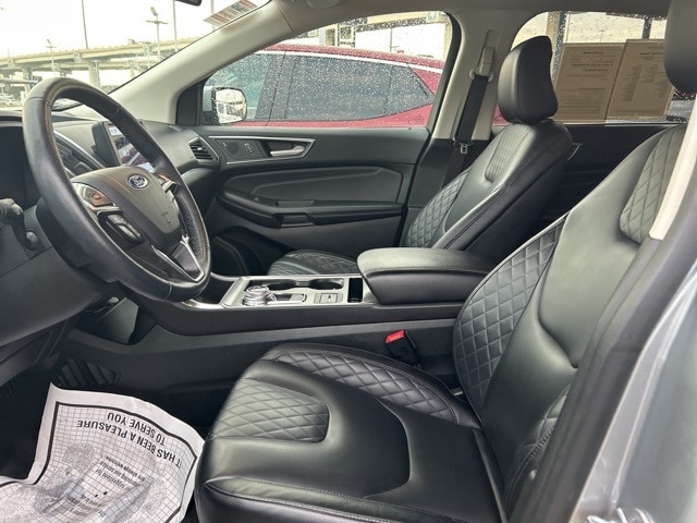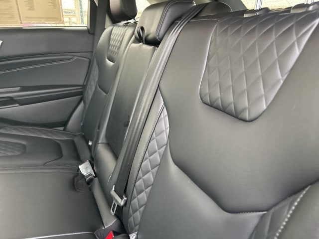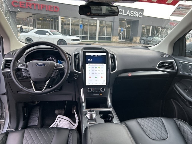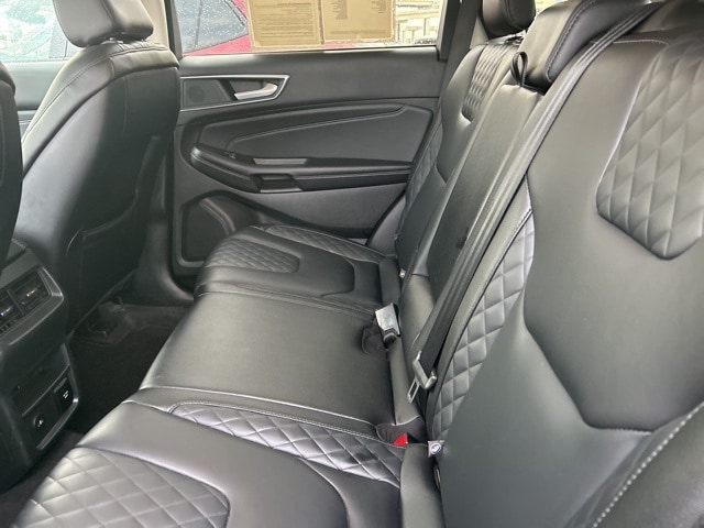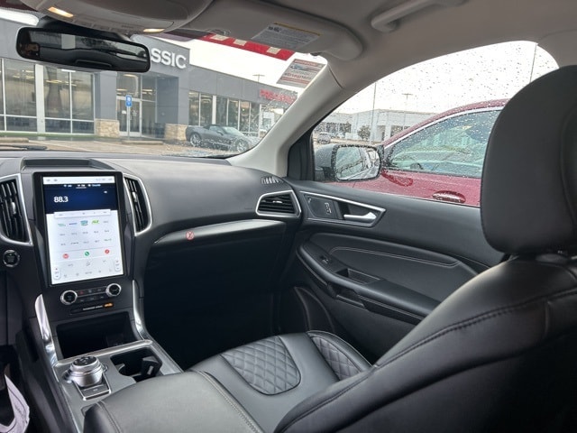 This 2024 Ford Edge comes equipped with the following features Equipment Group 300A, AWD, 12 Speakers, 3.80 Axle Ratio, 4-Wheel Disc Brakes, ABS brakes, ActiveX-Trimmed Heated Sport Bucket Seats, Air Conditioning, Alloy wheels, AM/FM radio: SiriusXM with 360L, Auto High-beam Headlights, Auto-dimming Rear-View mirror, Automatic temperature control, Brake assist, Bumpers: body-color, Compass, Delay-off headlights, Driver door bin, Driver vanity mirror, Dual front impact airbags, Dual front side impact airbags, Electronic Stability Control, Emergency communication system: SYNC 4 911 Assist, FordPass Connect, Four wheel independent suspension, Front anti-roll bar, Front Bucket Seats, Front Center Armrest w/Storage, Front dual zone A/C, Front fog lights, Front reading lights, Fully automatic headlights, Garage door transmitter, Heated door mirrors, Heated front seats, Heated steering wheel, Illuminated entry, Knee airbag, Leather steering wheel, Low tire pressure warning, Memory seat, Occupant sensing airbag, Outside temperature display, Overhead airbag, Overhead console, Panic alarm, Passenger door bin, Passenger vanity mirror, Power door mirrors, Power driver seat, Power Liftgate, Power passenger seat, Power steering, Power windows, Radio: B&O Sound System by Bang & Olufsen, Rain sensing wipers, Rear anti-roll bar, Rear reading lights, Rear seat center armrest, Rear window defroster, Rear window wiper, Remote keyless entry, Security system, SiriusXM w/360L, Speed control, Speed-Sensitive Wipers, Split folding rear seat, Spoiler, Steering wheel mounted audio controls, SYNC 4A w/Enhanced Voice Recognition, Tachometer, Telescoping steering wheel, Tilt steering wheel, Traction control, Trip computer, Turn signal indicator mirrors, Variably intermittent wipers, and Wheels: 19" Luster Nickel-Painted Aluminum. AWD. CARFAX One-Owner. 2024 Ford Edge Titanium AWD EcoBoost 2.0L I4 GTDi DOHC Turbocharged VCT
