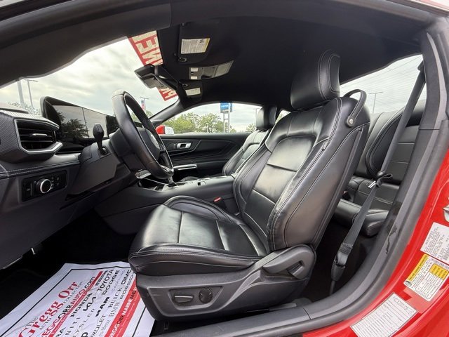 CARFAX One-Owner. 22/33 City/Highway MPG Race Red 2024 Ford Mustang EcoBoost Premium EcoBoost 2.3L I4 GTDi DOHC Turbocharged VCT RWD 10-Speed Automatic The 2024 Ford Mustang comes with the following features; Equipment Group 200A Standard Package, 4-Wheel Disc Brakes, 9 Speakers, ABS brakes, ActiveX Bucket Seats, Air Conditioning, Alloy wheels, AM/FM radio: SiriusXM with 360L, AM/FM Stereo, Auto High-beam Headlights, Auto-dimming Rear-View mirror, Automatic temperature control, Brake assist, Bumpers: body-color, Climate Controlled Heated/Cooled Front Seats, Compass, Delay-off headlights, Driver door bin, Driver vanity mirror, Dual front impact airbags, Dual front side impact airbags, Electronic Stability Control, Emergency communication system: 911 Assist, Exterior Parking Camera Rear, Four wheel independent suspension, Front anti-roll bar, Front Bucket Seats, Front Center Armrest, Front dual zone A/C, Front reading lights, Fully automatic headlights, HD Radio, Heated door mirrors, Heated front seats, Heated steering wheel, Illuminated entry, Knee airbag, Leather Shift Knob, Leather steering wheel, Low tire pressure warning, Occupant sensing airbag, Outside temperature display, Overhead airbag, Overhead console, Panic alarm, Passenger door bin, Passenger vanity mirror, Power door mirrors, Power driver seat, Power passenger seat, Power steering, Power windows, Radio data system, Rain sensing wipers, Rear anti-roll bar, Rear Parking Sensors, Rear window defroster, Remote keyless entry, SiriusXM w/360L, Speed control, Speed-sensing steering, Speed-Sensitive Wipers, Split folding rear seat, Spoiler, Sport steering wheel, Steering wheel mounted audio controls, SYNC 4.0 QNX, Tachometer, Telescoping steering wheel, Tilt steering wheel, Traction control, Trip computer, Turn signal indicator mirrors, Variably intermittent wipers, Ventilated front seats, Voltmeter, and Wheels: 18 x 8 Machined-Face Aluminum.