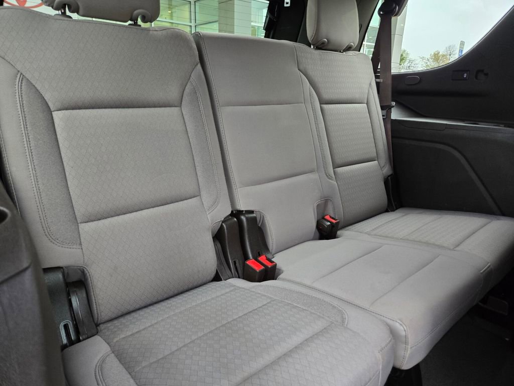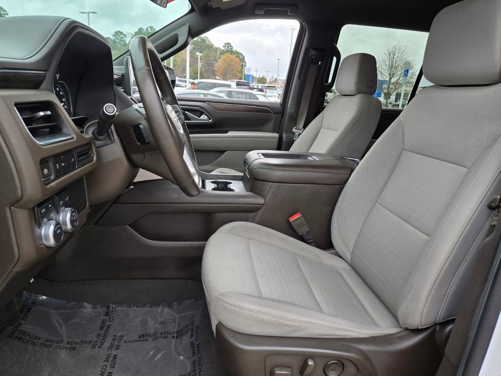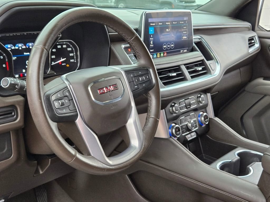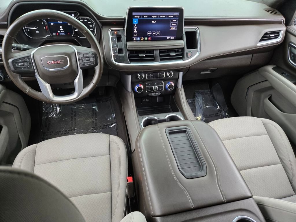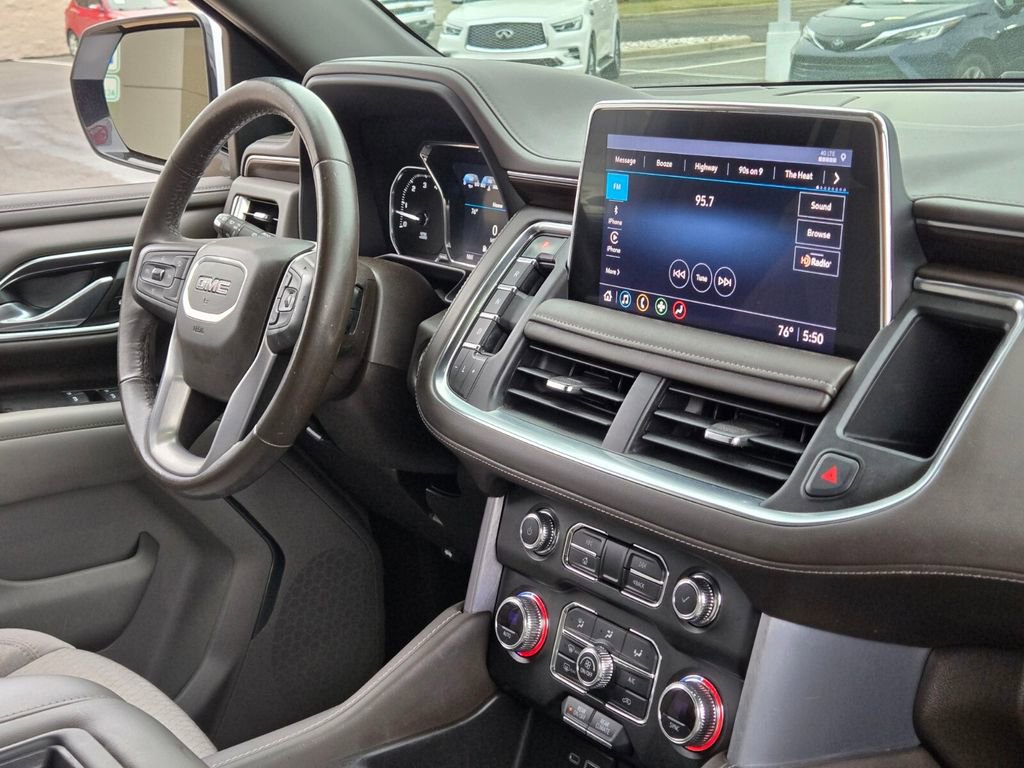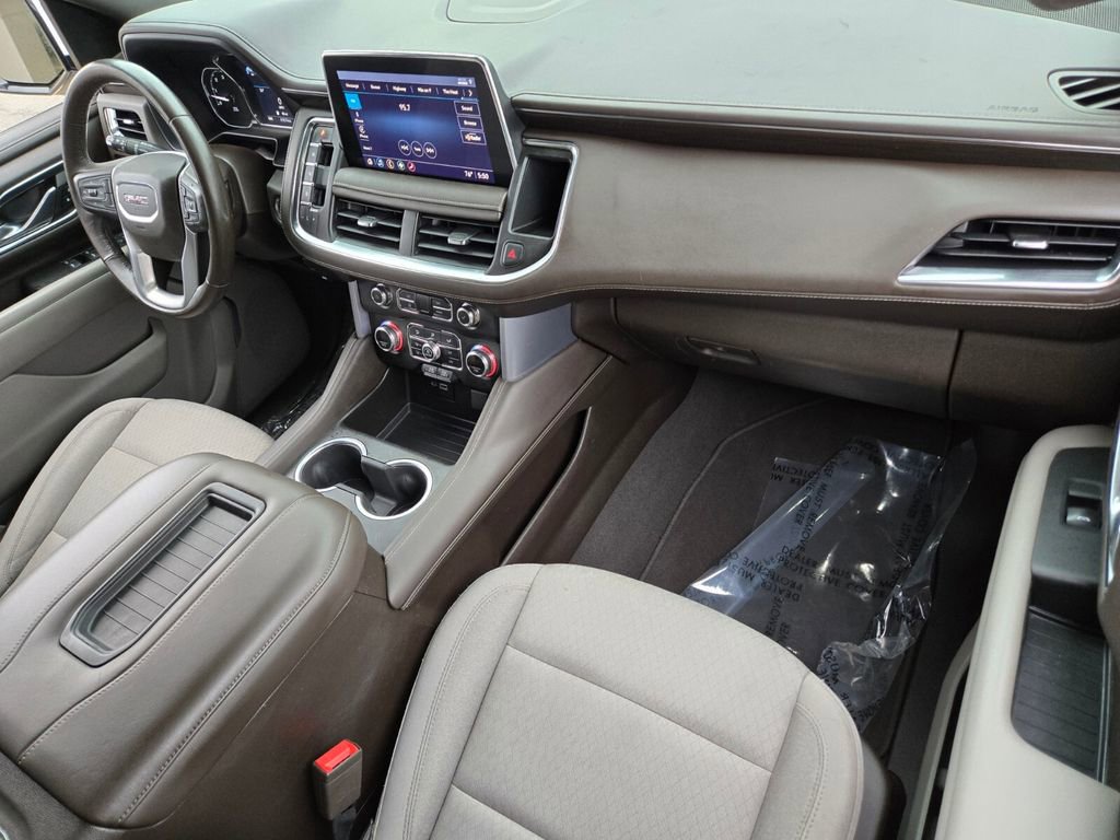 This 2021 GMC Yukon comes equipped with, 4WD, 3.23 Rear Axle Ratio, 3rd row seats: split-bench, 4-Wheel Disc Brakes, 6 Speakers, 6-Speaker Audio System Feature, ABS brakes, Air Conditioning, Alloy wheels, AM/FM radio: SiriusXM with 360L, Apple CarPlay/Android Auto, Auto High-beam Headlights, Automatic temperature control, Brake assist, Bumpers: body-color, Cloth Seat Trim, Compass, Delay-off headlights, Driver door bin, Driver vanity mirror, Dual front impact airbags, Dual front side impact airbags, Electronic Stability Control, Emergency communication system: OnStar and GMC connected services capable, Four wheel independent suspension, Front anti-roll bar, Front Bucket Seats, Front Center Armrest, Front dual zone A/C, Front fog lights, Front reading lights, Fully automatic headlights, HD Radio, Heated door mirrors, Illuminated entry, Leather steering wheel, License Plate Front Mounting Package, Low tire pressure warning, Not Equipped w/Automatic Stop/Start, Occupant sensing airbag, Outside temperature display, Overhead airbag, Overhead console, Panic alarm, Passenger door bin, Passenger vanity mirror, Power door mirrors, Power driver seat, Power passenger seat, Power steering, Power windows, Preferred Equipment Group 3SA, Premium Smooth Ride Suspension, Radio: AM/FM/SiriusXM, Rain sensing wipers, Rear air conditioning, Rear anti-roll bar, Rear reading lights, Rear seat center armrest, Rear window defroster, Rear window wiper, Remote keyless entry, Roof rack: rails only, Security system, SiriusXM w/360L, Speed control, Speed-sensing steering, Split folding rear seat, Spoiler, Steering wheel mounted audio controls, Tachometer, Telescoping steering wheel, Tilt steering wheel, Traction control, Trip computer, Variably intermittent wipers, Voltmeter, Wheels: 18" x 8.5" 6-Spoke Machined Aluminum, 4WD.