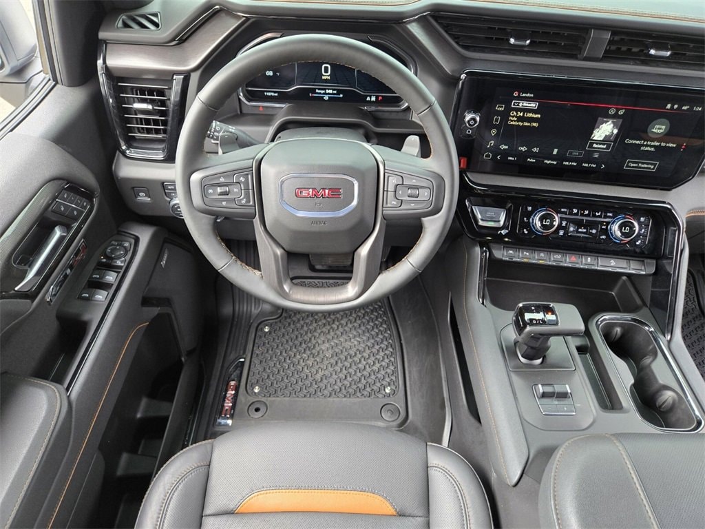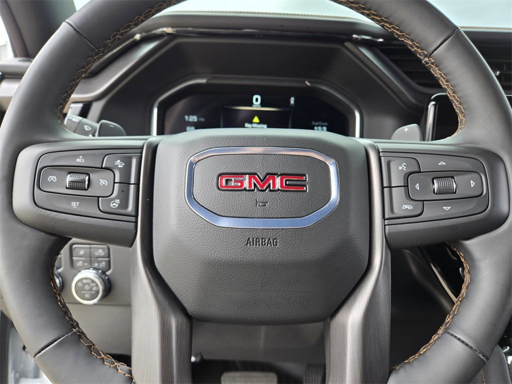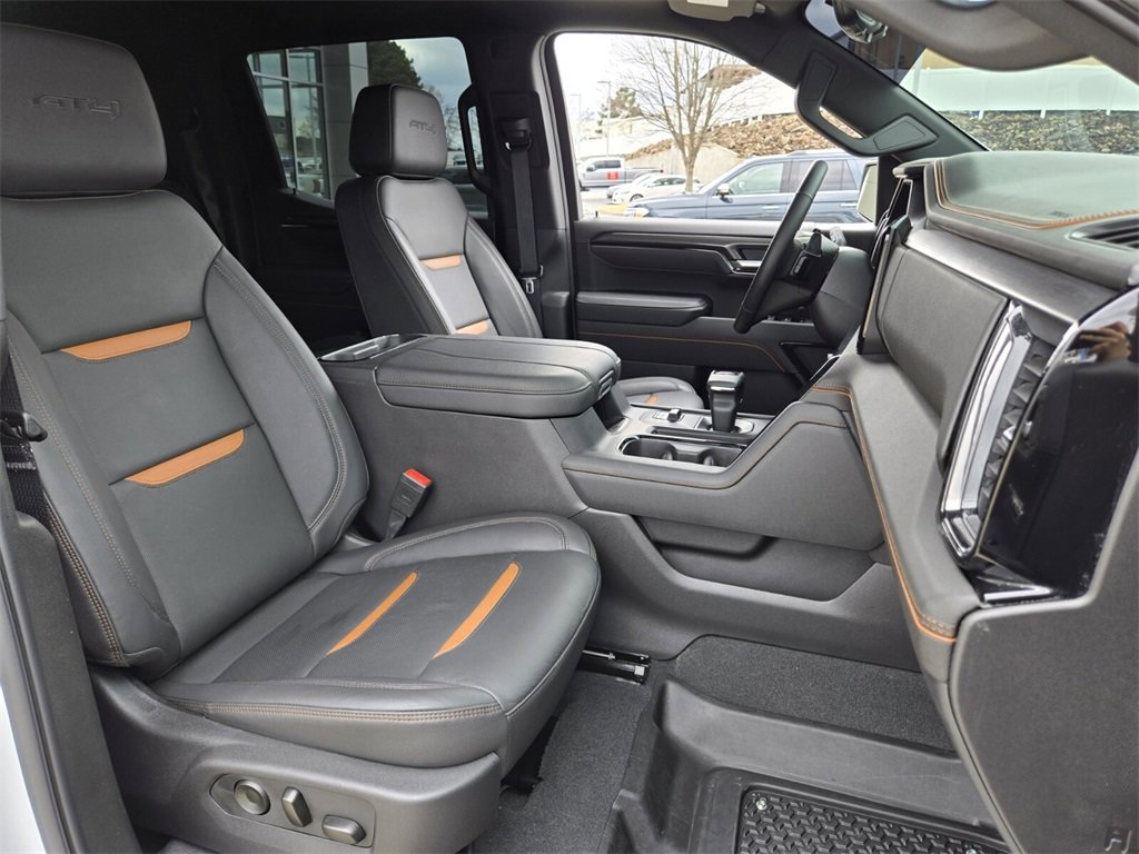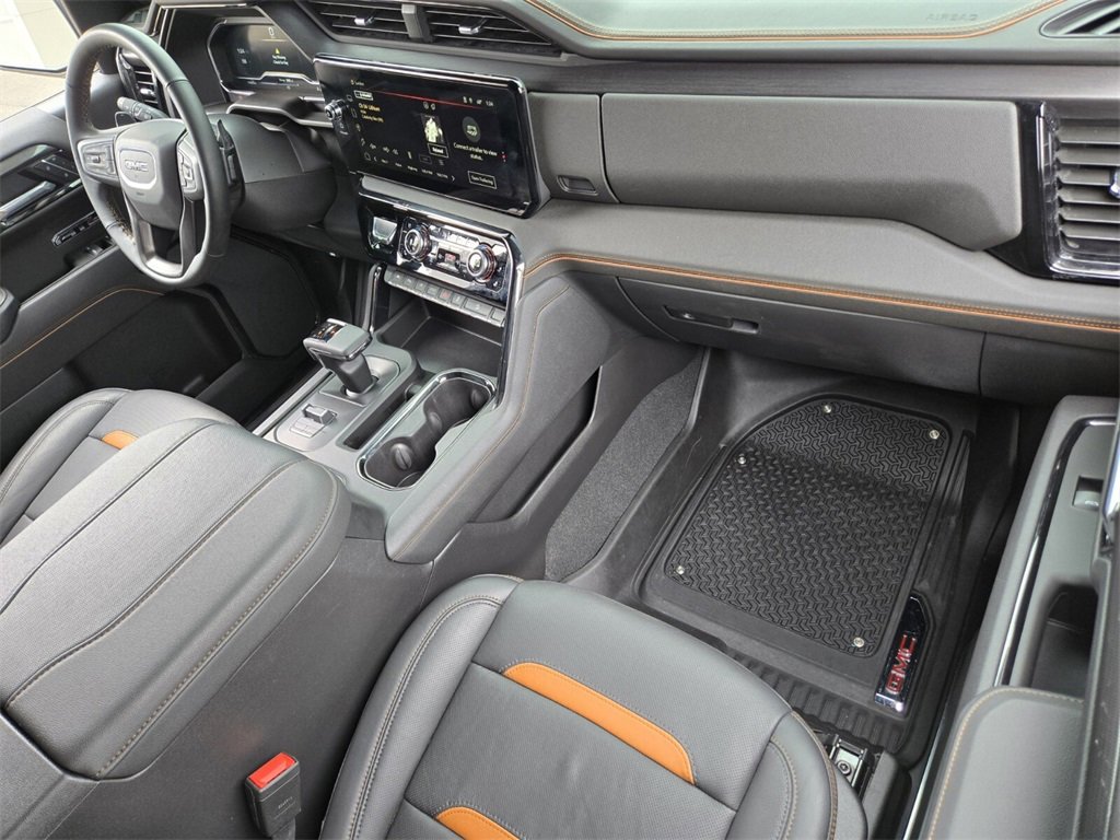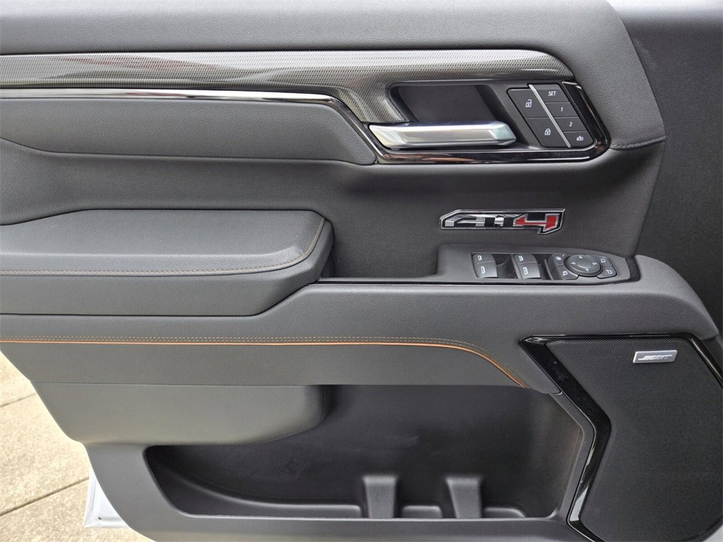 This 2025 GMC Sierra 1500 comes equipped with, 10-Speed Automatic, 4WD, Jet Black With Kalahari Accents Leather, 10-Way Power Driver Seat Adjuster w/Lumbar, 10-Way Power Passenger Seat Adjuster w/Lumbar, 120-Volt Bed Mounted Power Outlet, 120-Volt Interior Power Outlet, 170 Amp Alternator, 2 Charge/Data USB Ports Inside Center Console, 2 Type-C Charge-Only Rear USB Ports, 2 USB Ports, 220 Amp Alternator, 3.23 Rear Axle Ratio, 4-Wheel Disc Brakes, 7 Speakers, ABS brakes, Air Conditioning, Alloy wheels, AM/FM radio: SiriusXM with 360L, Apple CarPlay/Android Auto, AT4 Preferred Package, AT4 Premium Package, Auto High-beam Headlights, Auto-dimming door mirrors, Auto-dimming Rear-View mirror, Auto-Locking Rear Differential, Automatic Emergency Braking, Automatic temperature control, Auxiliary External Transmission Oil Cooler, Bed View Camera, Black Chrome Grille Insert Bars, Block heater, Brake assist, Buckle to Drive, Bumpers: body-color, Color-Keyed Carpeting Floor Covering, Compass, Deep-Tinted Glass, Delay-off headlights, Driver door bin, Driver Memory, Driver vanity mirror, Dual Active Exhaust, Dual front impact airbags, Dual front side impact airbags, Electric Rear-Window Defogger, Electronic Stability Control, Emergency communication system: OnStar, Engine Block Heater, External Engine Oil Cooling, Floor-Mounted Center Console, Following Distance Indicator, Forward Collision Alert, Front anti-roll bar, Front Bucket Seats, Front Center Armrest, Front dual zone A/C, Front fog lights, Front License Plate Kit, Front Pedestrian Braking, Front Prem Floor Liners w/Removable Carpet Insert, Front Rain-Sensing Wipers, Front reading lights, Front wheel independent suspension, Fully automatic headlights, HD Surround Vision, Heated 2nd Row Outboard Seats, Heated door mirrors, Heated Driver & Front Outboard Passenger Seating, Heated front seats, Heated rear seats, Heated steering wheel, Heavy-Duty Air Filter, Hill Descent Control, Hitch Guidance, Hitch View, Illuminated entry, In-Vehicle Trailering System App, Integrated Trailer Brake Controller, IntelliBeam Automatic High Beam On/Off, Keyless Open & Start, Lane Keep Assist w/Lane Departure Warning, LED Cargo Area Lighting, Low tire pressure warning, Memory seat, Multicolor 15" Diagonal Head-Up Display, Navigation System, Occupant sensing airbag, Off-Road High Clearance Step (LPO), Off-Road Suspension, OnStar Services Capable, Outside temperature display, Overhead airbag, Overhead console, Panic alarm, Passenger door bin, Passenger vanity mirror, Perforated Front Leather Seat Trim, Perimeter Lighting, Power Door Locks, Power door mirrors, Power driver seat, Power Front Passenger Windows w/Express Up/Down, Power Front Windows w/Driver Express Up/Down, Power passenger seat, Power Rake & Telescoping Steering Column, Power Rear Windows w/Express Down, Power Sliding Rear Window w/Rear Defogger, Power steering, Power Sunroof, Power windows, Preferred Equipment Group 4SB, Premium Bose 7-Speaker Sound System, Push Button Start, Radio data system, Radio: Premium GMC Infotainment Audio System, Rain sensing wipers, Rear Camera Mirror, Rear Cross Traffic Braking, Rear Pedestrian Detection, Rear Prem Floor Liners w/Removable Carpet Insert, Rear reading lights, Rear seat center armrest, Rear step bumper, Rear Wheelhouse Liners, Rear window defroster, Red Recovery Hooks, Remote keyless entry, Remote Vehicle Starter System, Safety Alert Seat, Security system, SiriusXM w/360L Trial Subscription, Speed control, Speed-sensing steering, Split folding rear seat, Spray-On Pickup Bedliner w/GMC Logo, Steering Wheel Audio Controls, Steering wheel mounted audio controls, Tachometer, Technology Package, Telescoping steering wheel, Theft Deterrent System (Unauthorized Entry), Tilt steering wheel, Traction control, Trailer Camera Provisions, Trailer Side Blind Zone Alert, Trailering Package, Trip computer, Ultrasonic Front & Rear Park Assist, Universal Home Remote, Variably intermittent wipers, Ventilated Driver & F
