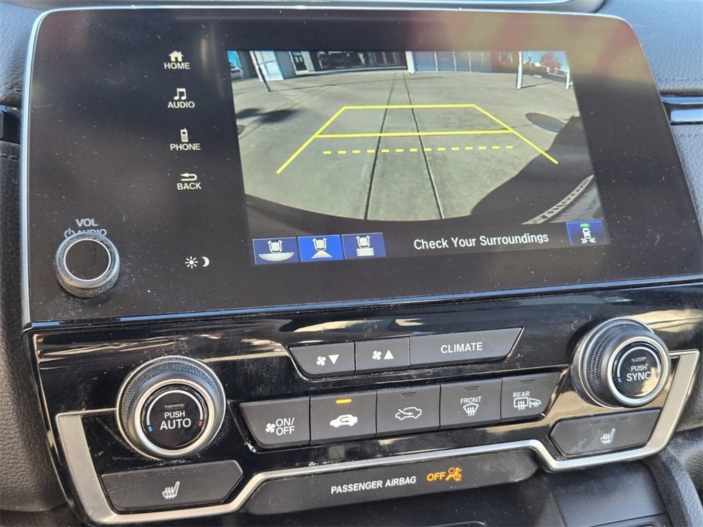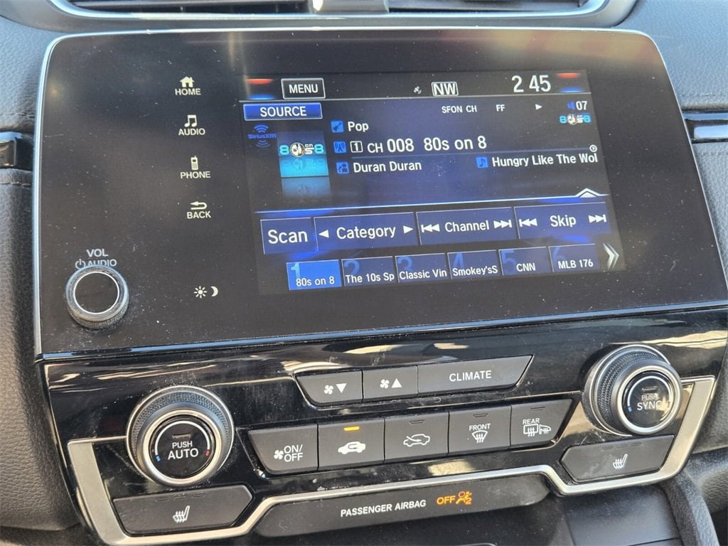 This 2022 Honda CR-V Hybrid comes equipped with, 2.0L I4 DOHC 16V, 18" Alloy Wheels, 3.89 Axle Ratio, 4-Wheel Disc Brakes, 8 Speakers, ABS brakes, Adaptive Cruise Control: Adaptive Cruise Control (ACC) with Low-Speed Follow, Air Conditioning, Alloy wheels, AM/FM radio: SiriusXM, Apple CarPlay/Android Auto, Auto High-beam Headlights, Auto-dimming Rear-View mirror, Automatic temperature control, Blind Spot Information (BSI) System warning, Brake assist, Bumpers: body-color, Compass, Delay-off headlights, Driver door bin, Driver vanity mirror, Dual front impact airbags, Dual front side impact airbags, Electronic Stability Control, Exterior Parking Camera Rear, Forward collision: Collision Mitigation Braking System (CMBS) + FCW mitigation, Four wheel independent suspension, Front anti-roll bar, Front Bucket Seats, Front Center Armrest, Front dual zone A/C, Front fog lights, Front reading lights, Garage door transmitter: HomeLink, Heated door mirrors, Heated Front Bucket Seats, Heated front seats, Heated steering wheel, Illuminated entry, Leather Seat Trim, Low tire pressure warning, Memory seat, Occupant sensing airbag, Outside temperature display, Overhead airbag, Overhead console, Panic alarm, Passenger door bin, Passenger vanity mirror, Power door mirrors, Power driver seat, Power Liftgate, Power moonroof, Power passenger seat, Power steering, Power windows, Radio data system, Radio: 180-Watt AM/FM/HD/SiriusXM Audio System, Rear anti-roll bar, Rear seat center armrest, Rear window defroster, Rear window wiper, Remote keyless entry, Security system, Speed control, Speed-sensing steering, Speed-Sensitive Wipers, Split folding rear seat, Spoiler, Steering wheel mounted audio controls, Telescoping steering wheel, Tilt steering wheel, Traction control, Trip computer, Turn signal indicator mirrors, Variably intermittent wipers, 2.0L I4 DOHC 16V.