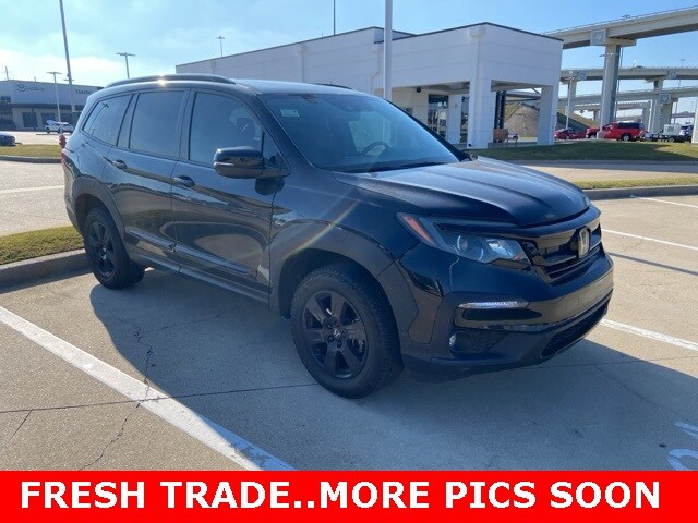 This 2022 Honda Pilot comes equipped with the following features AWD, 3rd row seats: split-bench, 4-Wheel Disc Brakes, 4.33 Axle Ratio, 7 Speakers, A/V remote: CabinControl, ABS brakes, Air Conditioning, Alloy wheels, AM/FM radio: SiriusXM, Apple CarPlay/Android Auto, Auto High-beam Headlights, Auto-dimming Rear-View mirror, Automatic temperature control, Blind Spot Information (BSI) System warning, Brake assist, Bumpers: body-color, Delay-off headlights, Driver door bin, Driver vanity mirror, Dual front impact airbags, Dual front side impact airbags, Electronic Stability Control, Emergency communication system: HondaLink Assist, Exterior Parking Camera Rear, Forward collision: Collision Mitigation Braking System (CMBS) + FCW mitigation, Four wheel independent suspension, Front anti-roll bar, Front Bucket Seats, Front Center Armrest, Front dual zone A/C, Front fog lights, Front reading lights, Fully automatic headlights, Garage door transmitter: HomeLink, Heated door mirrors, Heated Front Bucket Seats, Heated front seats, Illuminated entry, Lane departure: Lane Keeping Assist System (LKAS) active, Leather Seat Trim, Low tire pressure warning, Memory seat, Navigation system: Honda Satellite-Linked Navigation System, Occupant sensing airbag, Outside temperature display, Overhead airbag, Overhead console, Panic alarm, Passenger door bin, Passenger vanity mirror, Power door mirrors, Power driver seat, Power Liftgate, Power moonroof, Power passenger seat, Power steering, Power windows, Radio data system, Radio: 215-Watt Audio System, Rear air conditioning, Rear anti-roll bar, Rear reading lights, Rear seat center armrest, Rear window defroster, Rear window wiper, Reclining 3rd row seat, Remote keyless entry, Roof rack: rails only, Security system, Speed control, Speed-sensing steering, Speed-Sensitive Wipers, Split folding rear seat, Spoiler, Steering wheel mounted audio controls, Tachometer, Telescoping steering wheel, Tilt steering wheel, Traction control, Trip computer, Turn signal indicator mirrors, Variably intermittent wipers, and Wheels: 18" Exclusive Gloss Black Alloy. AWD. CARFAX One-Owner. 2022 Honda Pilot TrailSport AWD 3.5L V6 24V SOHC i-VTEC