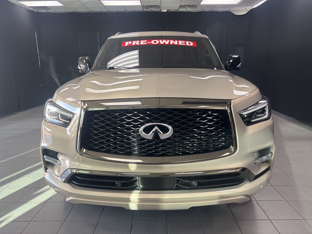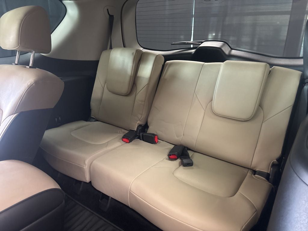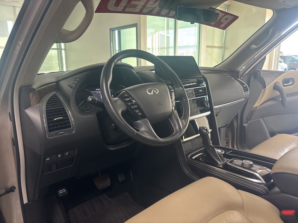 Clean CARFAX. Champagne Premium Select RWD 7-Speed Automatic 5.6L V8 **NAVIGATION**, **MOONROOF**, **LOCAL TRADE**, **NON SMOKER**, **LEATHER INTERIOR**, **KEYLESS ENTRY**, **REMOTE START**, **HEATED / COOLED SEATS**, **ADAPTIVE CRUISE CONTROL**, **RUNNING BOARDS**, **WE DELIVER ANYWHERE**, **REAR VIEW CAMERA**, **BLUETOOTH HANDES FREE CALLING**, 13 Speakers, 2.937 Axle Ratio, 3rd row seats: split-bench, 4-Wheel Disc Brakes, ABS brakes, Air Conditioning, All-Season Floor Mats, All-Season Package, Alloy wheels, AM/FM radio: SiriusXM, Anti-whiplash front head restraints, Auto High-beam Headlights, Auto tilt-away steering wheel, Auto-dimming door mirrors, Auto-dimming Rear-View mirror, Auto-leveling suspension, Automatic temperature control, Brake assist, Bumpers: body-color, Cargo Area Mat, Cargo Net, Cargo Package, Carpeted Cargo Mat, Center Console Tray, Compass, Console Net, Delay-off headlights, Driver door bin, Driver vanity mirror, Dual front impact airbags, Dual front side impact airbags, Electronic Stability Control, Emergency communication system: INFINITI InTouch, First-Aid Kit, Four wheel independent suspension, Front anti-roll bar, Front Bucket Seats, Front Center Armrest, Front dual zone A/C, Front fog lights, Front reading lights, Fully automatic headlights, Garage door transmitter: HomeLink, Heated door mirrors, Heated Front Bucket Seats, Heated front seats, Heated steering wheel, Illuminated entry, INFINITI Radiant Illuminated Kick Plates, Leather Shift Knob, Leather steering wheel, Leather-Appointed Seats, Literature Kit, Low tire pressure warning, Memory seat, Navigation system: INFINITI InTouch Navigation, Occupant sensing airbag, Outside temperature display, Overhead airbag, Overhead console, Panic alarm, Passenger door bin, Passenger vanity mirror, Power door mirrors, Power driver seat, Power Liftgate, Power moonroof, Power passenger seat, Power steering, Power windows, Premium audio system: Bose, Premium Select Sahara Stone Interior, Radio data system, Radio: Bose Premium Audio System w/13 Speakers, Rain sensing wipers, Rear air conditioning, Rear anti-roll bar, Rear reading lights, Rear seat center armrest, Rear window defroster, Rear window wiper, Reclining 3rd row seat, Remote keyless entry, Security system, Speed control, Speed-sensing steering, Split folding rear seat, Spoiler, Steering wheel memory, Steering wheel mounted audio controls, Tachometer, Telescoping steering wheel, Tilt steering wheel, Traction control, Trip computer, Turn signal indicator mirrors, Variably intermittent wipers, Voltmeter, Wheels: 22" x 8.0" Dark Chrome Cast Aluminum-Alloy.