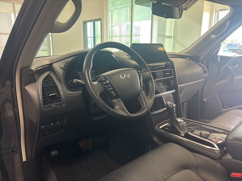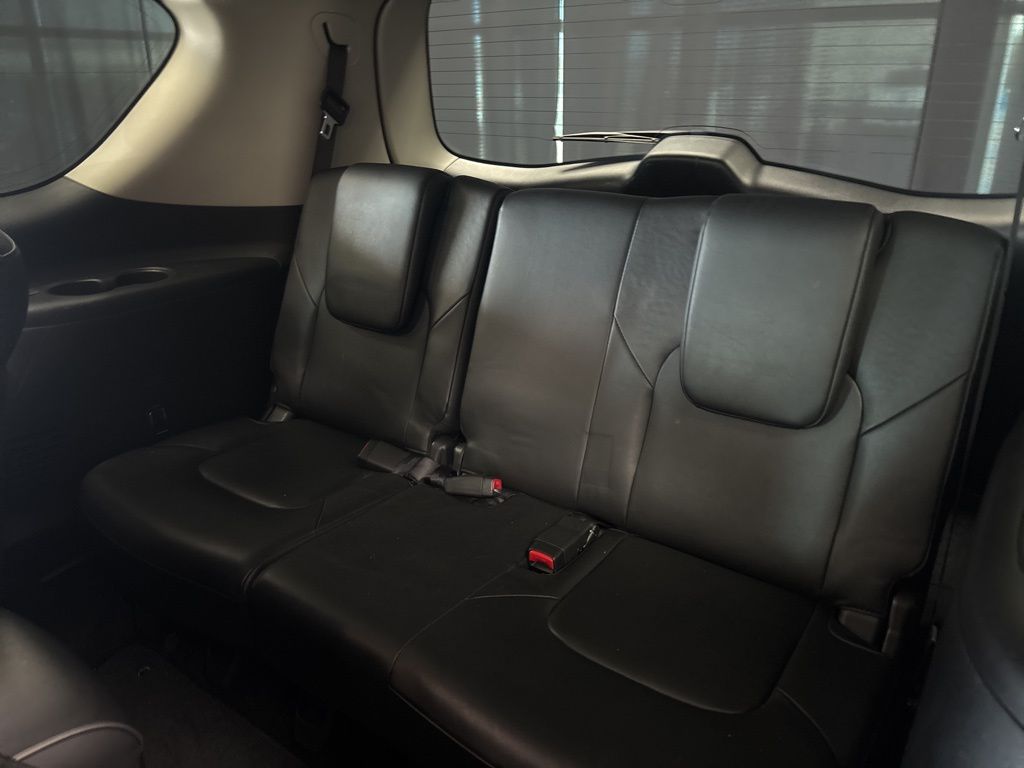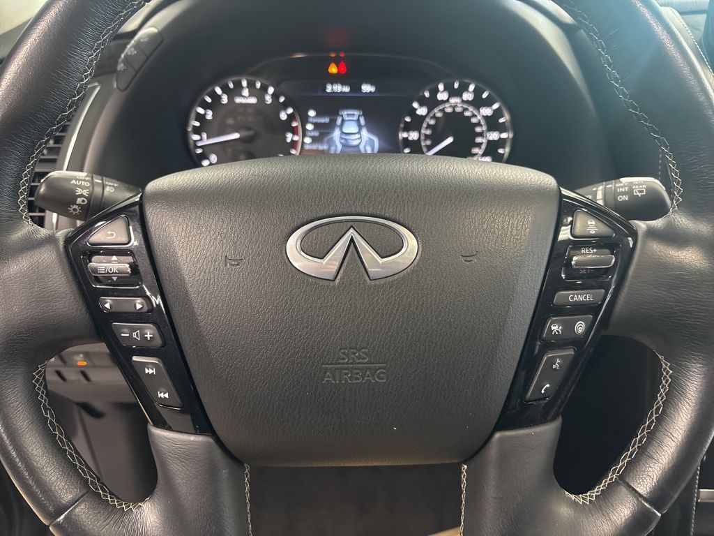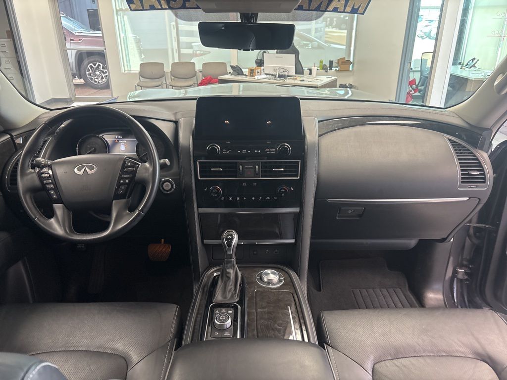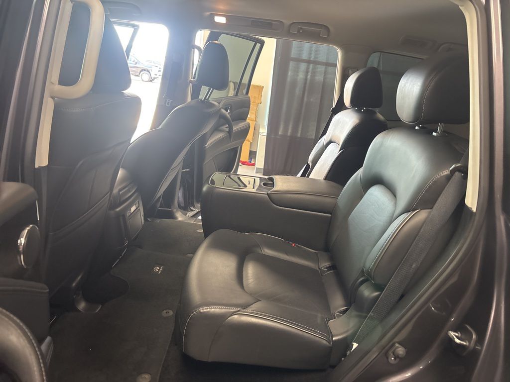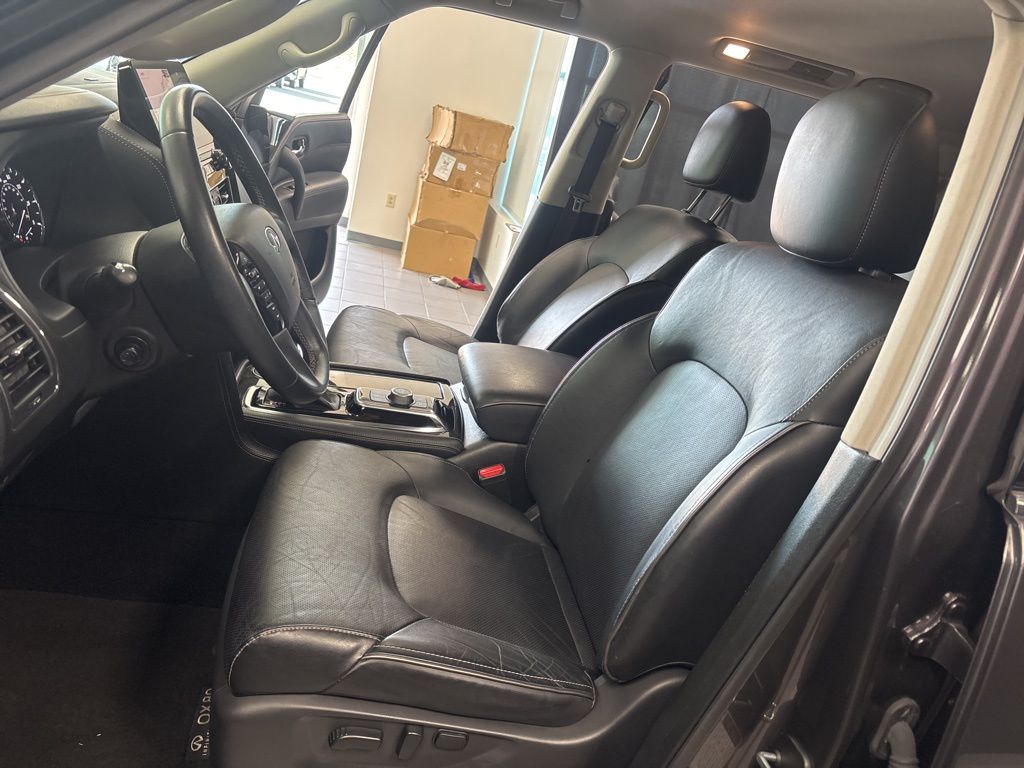 CARFAX One-Owner. Anthracite Gray LUXE 4WD 7-Speed Automatic 5.6L V8 **NAVIGATION**, **4WD**, **MOONROOF**, **LEATHER INTERIOR**, **KEYLESS ENTRY**, **REMOTE START**, **ADAPTIVE CRUISE CONTROL**, **WE DELIVER ANYWHERE**, **REAR VIEW CAMERA**, **BLUETOOTH HANDES FREE CALLING**, 13 Speakers, 2.937 Axle Ratio, 20" Aluminum Alloy Wheels, 3rd row seats: bench, 4-Wheel Disc Brakes, ABS brakes, Air Conditioning, Alloy wheels, AM/FM radio: SiriusXM, Anti-whiplash front head restraints, Apple CarPlay/Android Auto, Auto High-beam Headlights, Auto tilt-away steering wheel, Auto-dimming door mirrors, Auto-dimming Rear-View mirror, Auto-leveling suspension, Automatic temperature control, Brake assist, Bumpers: body-color, Compass, Delay-off headlights, Driver door bin, Driver vanity mirror, Dual front impact airbags, Dual front side impact airbags, Electronic Stability Control, Emergency communication system: INFINITI InTouch, Four wheel independent suspension, Front anti-roll bar, Front Bucket Seats, Front Center Armrest, Front dual zone A/C, Front fog lights, Front reading lights, Fully automatic headlights, Garage door transmitter: HomeLink, Heated door mirrors, Heated Front Bucket Seats, Heated front seats, Heated steering wheel, Illuminated entry, Leather Shift Knob, Leather steering wheel, Leather-Appointed Seats, Literature Kit, Low tire pressure warning, Memory seat, Navigation system: INFINITI InTouch Navigation, Occupant sensing airbag, Outside temperature display, Overhead airbag, Overhead console, Panic alarm, Passenger door bin, Passenger vanity mirror, Power door mirrors, Power driver seat, Power Liftgate, Power moonroof, Power passenger seat, Power steering, Power windows, Radio data system, Radio: Bose Premium Audio System w/13 Speakers, Rain sensing wipers, Rear air conditioning, Rear anti-roll bar, Rear reading lights, Rear seat center armrest, Rear window defroster, Rear window wiper, Reclining 3rd row seat, Remote keyless entry, Security system, Speed control, Speed-sensing steering, Split folding rear seat, Spoiler, Steering wheel memory, Steering wheel mounted audio controls, Tachometer, Telescoping steering wheel, Tilt steering wheel, Traction control, Trip computer, Turn signal indicator mirrors, Variably intermittent wipers, Voltmeter.