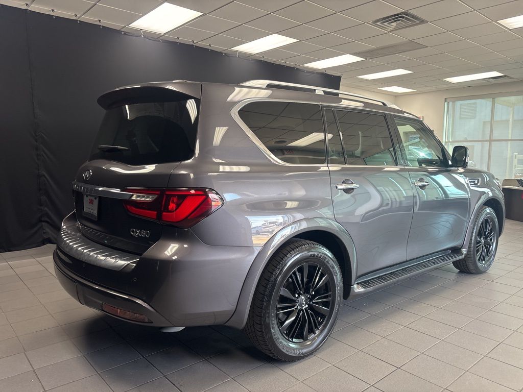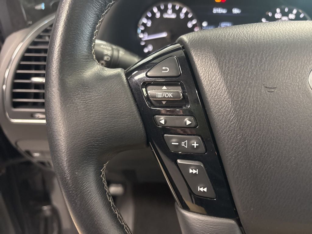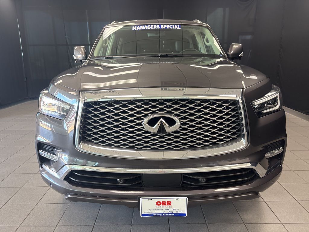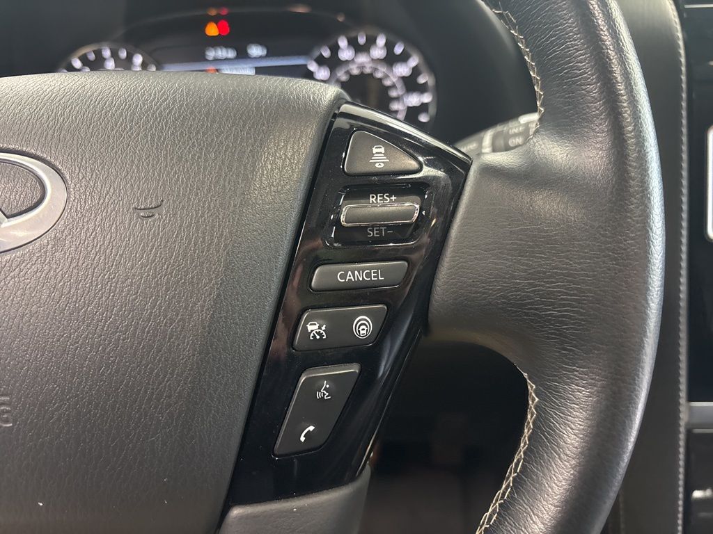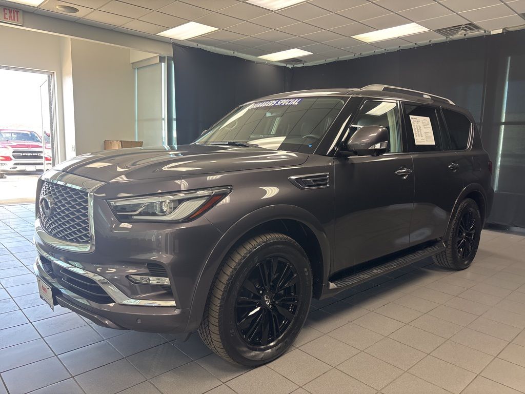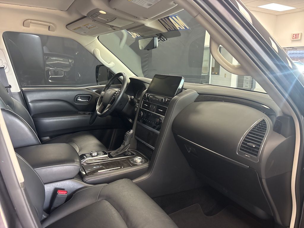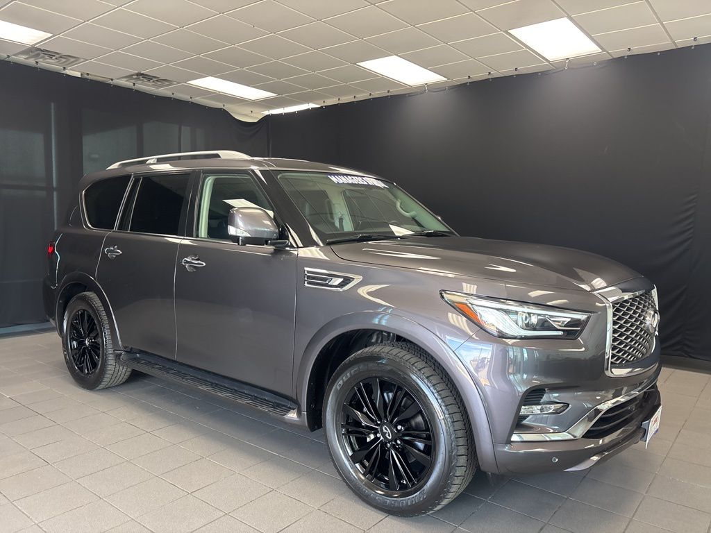 CARFAX One-Owner. Anthracite Gray LUXE 4WD 7-Speed Automatic 5.6L V8 **NAVIGATION**, **4WD**, **MOONROOF**, **LEATHER INTERIOR**, **KEYLESS ENTRY**, **REMOTE START**, **ADAPTIVE CRUISE CONTROL**, **WE DELIVER ANYWHERE**, **REAR VIEW CAMERA**, **BLUETOOTH HANDES FREE CALLING**, 13 Speakers, 2.937 Axle Ratio, 20" Aluminum Alloy Wheels, 3rd row seats: bench, 4-Wheel Disc Brakes, ABS brakes, Air Conditioning, Alloy wheels, AM/FM radio: SiriusXM, Anti-whiplash front head restraints, Apple CarPlay/Android Auto, Auto High-beam Headlights, Auto tilt-away steering wheel, Auto-dimming door mirrors, Auto-dimming Rear-View mirror, Auto-leveling suspension, Automatic temperature control, Brake assist, Bumpers: body-color, Compass, Delay-off headlights, Driver door bin, Driver vanity mirror, Dual front impact airbags, Dual front side impact airbags, Electronic Stability Control, Emergency communication system: INFINITI InTouch, Four wheel independent suspension, Front anti-roll bar, Front Bucket Seats, Front Center Armrest, Front dual zone A/C, Front fog lights, Front reading lights, Fully automatic headlights, Garage door transmitter: HomeLink, Heated door mirrors, Heated Front Bucket Seats, Heated front seats, Heated steering wheel, Illuminated entry, Leather Shift Knob, Leather steering wheel, Leather-Appointed Seats, Literature Kit, Low tire pressure warning, Memory seat, Navigation system: INFINITI InTouch Navigation, Occupant sensing airbag, Outside temperature display, Overhead airbag, Overhead console, Panic alarm, Passenger door bin, Passenger vanity mirror, Power door mirrors, Power driver seat, Power Liftgate, Power moonroof, Power passenger seat, Power steering, Power windows, Radio data system, Radio: Bose Premium Audio System w/13 Speakers, Rain sensing wipers, Rear air conditioning, Rear anti-roll bar, Rear reading lights, Rear seat center armrest, Rear window defroster, Rear window wiper, Reclining 3rd row seat, Remote keyless entry, Security system, Speed control, Speed-sensing steering, Split folding rear seat, Spoiler, Steering wheel memory, Steering wheel mounted audio controls, Tachometer, Telescoping steering wheel, Tilt steering wheel, Traction control, Trip computer, Turn signal indicator mirrors, Variably intermittent wipers, Voltmeter.