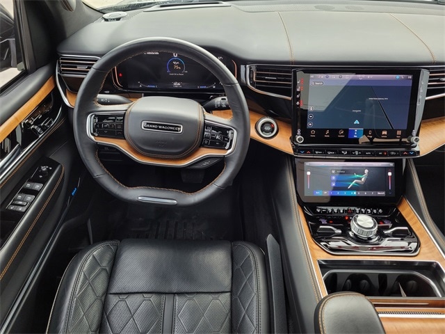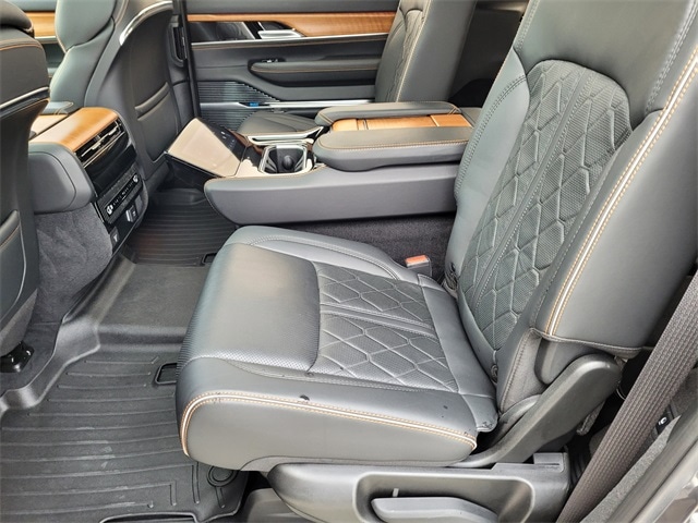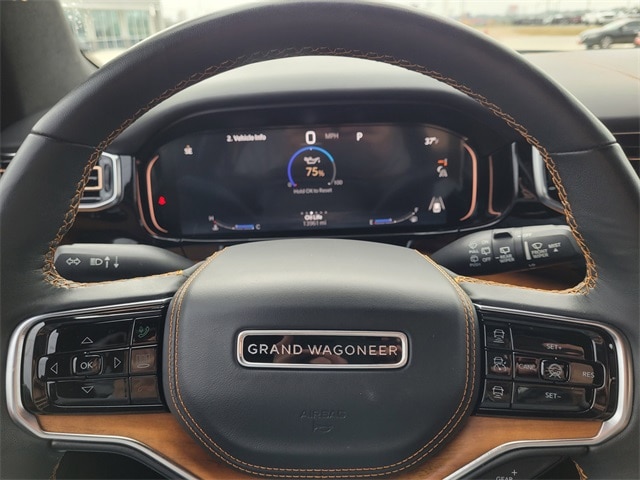 This 2023 Jeep Grand Wagoneer comes equipped with Quick Order Package 28W, Two Tone Paint Group, Navigation System, 3.92 Rear Axle Ratio, 3rd row seats: bench, 4-Wheel Disc Brakes, ABS brakes, Adjustable pedals, Air Conditioning, Alloy wheels, AM/FM radio: SiriusXM with 360L, Anti-whiplash front head restraints, Audio memory, Auto High-beam Headlights, Auto-dimming door mirrors, Auto-dimming Rear-View mirror, Auto-leveling suspension, Automatic temperature control, Brake assist, Bumpers: body-color, Compass, Delay-off headlights, Driver door bin, Driver vanity mirror, Driver's Seat Mounted Armrest, Dual front impact airbags, Dual front side impact airbags, Electronic Stability Control, Emergency communication system: Automatic SOS Call, Four wheel independent suspension, Front anti-roll bar, Front Bucket Seats, Front Center Armrest w/Storage, Front dual zone A/C, Front fog lights, Front reading lights, Fully automatic headlights, Garage door transmitter, Genuine wood console insert, Genuine wood dashboard insert, Genuine wood door panel insert, Heads-Up Display, Heated door mirrors, Heated front seats, Heated rear seats, Heated steering wheel, Illuminated entry, Knee airbag, Leather steering wheel, Low tire pressure warning, Memory seat, Night vision lights, Normal Duty Suspension, Occupant sensing airbag, Outside temperature display, Overhead airbag, Overhead console, Panic alarm, Passenger door bin, Passenger seat mounted armrest, Passenger vanity mirror, Pedal memory, Power adjustable front head restraints, Power door mirrors, Power driver seat, Power Liftgate, Power moonroof, Power passenger seat, Power steering, Power windows, Premium Leather Trimmed Bucket Seats, Radio data system, Radio: Uconnect 5 Nav w/12.0" Display, Rain sensing wipers, Rear air conditioning, Rear anti-roll bar, Rear dual zone A/C, Rear reading lights, Rear seat center armrest, Rear window defroster, Rear window wiper, Reclining 3rd row seat, Remote keyless entry, Roof rack, Security system, Speed control, Speed-sensing steering, Speed-Sensitive Wipers, Split folding rear seat, Steering wheel memory, Steering wheel mounted audio controls, Tachometer, Telescoping steering wheel, Tilt steering wheel, Traction control, Trip computer, Turn signal indicator mirrors, Variably intermittent wipers, Ventilated front seats, Ventilated rear seats, Voltmeter, and Wheels: 22" x 9.0" Premium 4 Aluminum. CARFAX One-Owner. Priced below KBB Fair Purchase Price! Carfax no accidents, Navigation System, Quick Order Package 28W, Two Tone Paint Group.