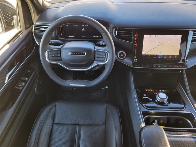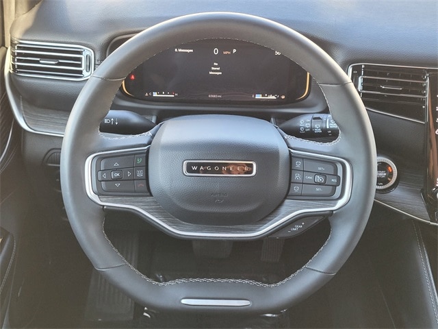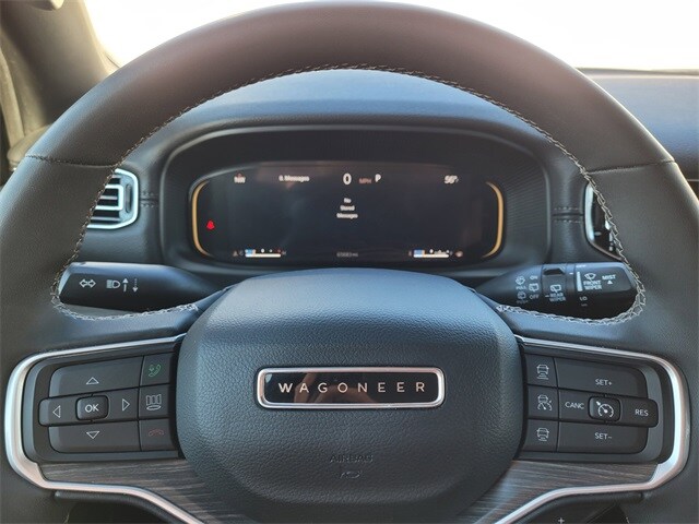 This 2024 Jeep Wagoneer L comes equipped with Quick Order Package 25J, Navigation System, 10 Speakers, 3.55 Rear Axle Ratio, 3rd row seats: bench, 4-Wheel Disc Brakes, ABS brakes, Adjustable pedals, Air Conditioning, Alloy wheels, AM/FM radio: SiriusXM with 360L, Anti-whiplash front head restraints, Apple CarPlay/Android Auto, Audio memory, Auto-dimming door mirrors, Auto-dimming Rear-View mirror, Auto-leveling suspension, Automatic temperature control, Brake assist, Bumpers: body-color, Compass, Delay-off headlights, Driver door bin, Driver vanity mirror, Driver's Seat Mounted Armrest, Dual front impact airbags, Dual front side impact airbags, Electronic Stability Control, Emergency communication system: Wagoneer Connect, Exterior Parking Camera Rear, Four wheel independent suspension, Front anti-roll bar, Front Bucket Seats, Front Center Armrest w/Storage, Front dual zone A/C, Front fog lights, Front reading lights, Full Length Floor Console, Fully automatic headlights, Garage door transmitter, Genuine wood console insert, Genuine wood dashboard insert, Genuine wood door panel insert, Heated door mirrors, Heated front seats, Heated steering wheel, Illuminated entry, Knee airbag, Leather Trimmed Bucket Seats, Low tire pressure warning, Memory seat, Normal Duty Suspension, Occupant sensing airbag, Outside temperature display, Overhead airbag, Overhead console, Panic alarm, Passenger door bin, Passenger seat mounted armrest, Passenger vanity mirror, Pedal memory, Power adjustable front head restraints, Power door mirrors, Power driver seat, Power Liftgate, Power passenger seat, Power steering, Power windows, Radio data system, Radio: Uconnect 5 Nav w/10.1" Display, Rain sensing wipers, Rear air conditioning, Rear anti-roll bar, Rear reading lights, Rear seat center armrest, Rear window defroster, Rear window wiper, Reclining 3rd row seat, Remote keyless entry, Security system, Speed control, Speed-sensing steering, Speed-Sensitive Wipers, Split folding rear seat, Steering wheel memory, Steering wheel mounted audio controls, Tachometer, Telescoping steering wheel, Tilt steering wheel, Traction control, Trip computer, Turn signal indicator mirrors, Variably intermittent wipers, Ventilated front seats, Voltmeter, and Wheels: 20" x 9.0" Premium 2 Aluminum. CARFAX One-Owner. Carfax no accidents, Navigation System, Quick Order Package 25J.