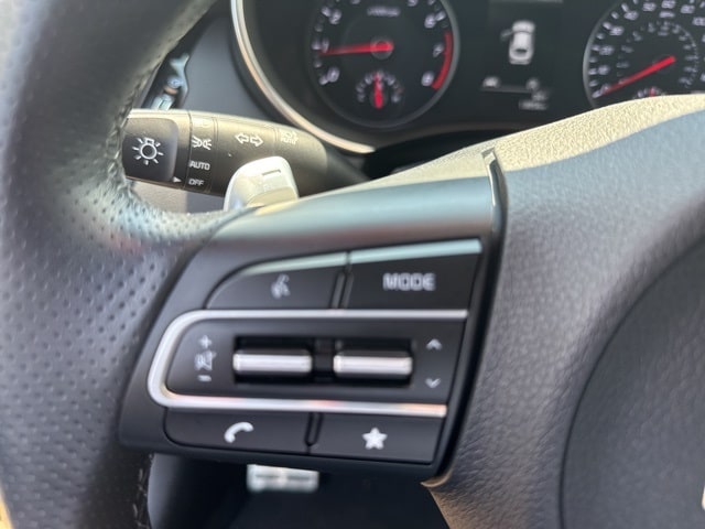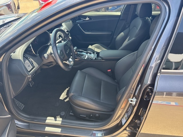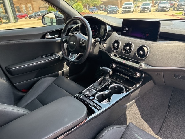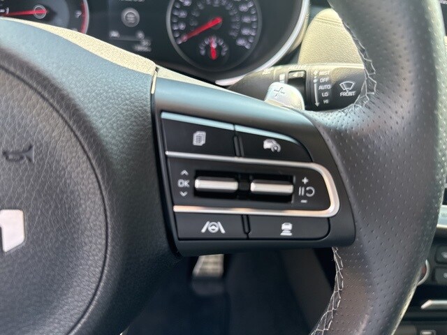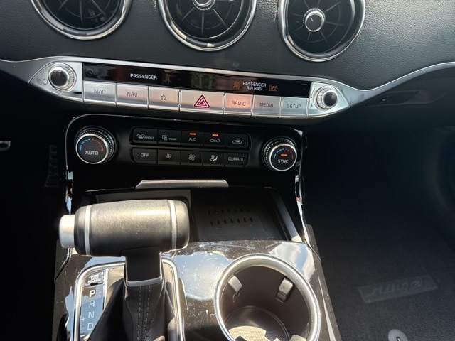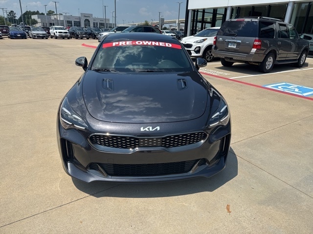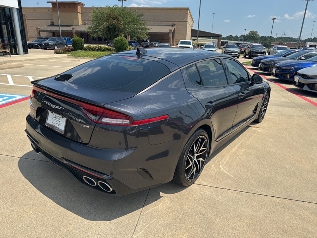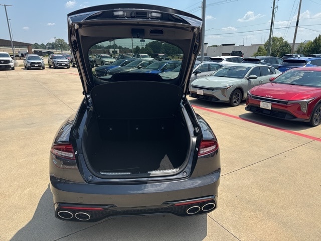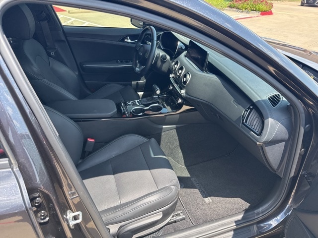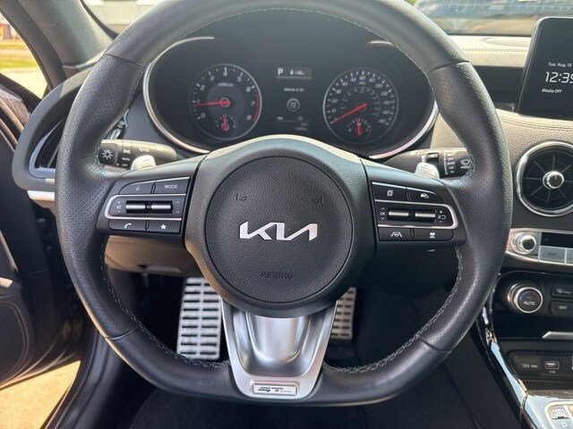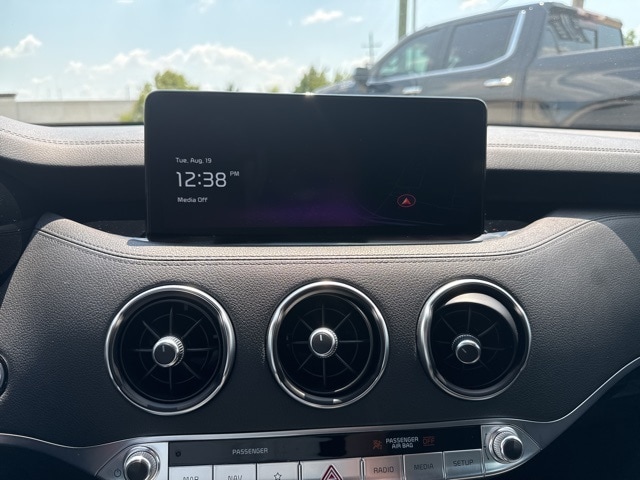 The 2023 Kia Stinger comes with the following features; 4-Wheel Disc Brakes, 9 Speakers, ABS brakes, Air Conditioning, Alloy wheels, AM/FM radio: SiriusXM, Anti-whiplash front head restraints, Apple CarPlay & Android Auto, Auto High-beam Headlights, Auto-dimming Rear-View mirror, Automatic temperature control, Brake assist, Bumpers: body-color, Carpeted Floor Mat, Delay-off headlights, Driver door bin, Driver vanity mirror, Dual front impact airbags, Dual front side impact airbags, Electronic Stability Control, Emergency communication system, Exterior Parking Camera Rear, Four wheel independent suspension, Front anti-roll bar, Front Bucket Seats, Front Center Armrest, Front dual zone A/C, Front reading lights, Fully automatic headlights, Heated door mirrors, Heated Front Bucket Seats, Heated front seats, Illuminated entry, Knee airbag, Leather Seat Trim, Low tire pressure warning, Navigation System, Occupant sensing airbag, Outside temperature display, Overhead airbag, Overhead console, Panic alarm, Passenger door bin, Passenger vanity mirror, Power door mirrors, Power driver seat, Power steering, Power windows, Radio: AM/FM/MP3/HD Audio System, Rain sensing wipers, Rear air conditioning, Rear anti-roll bar, Rear seat center armrest, Rear window defroster, Remote keyless entry, Security system, Smart Key w/ Push Button and Remote Start, Speed control, Speed-Sensitive Wipers, Split folding rear seat, Sport steering wheel, Steering wheel mounted audio controls, Tachometer, Telescoping steering wheel, Tilt steering wheel, Traction control, Trip computer, Turn signal indicator mirrors, Variably intermittent wipers, and Wheels: 8.0J x 18 Vertex Alloy.