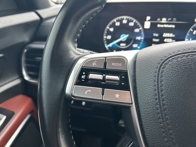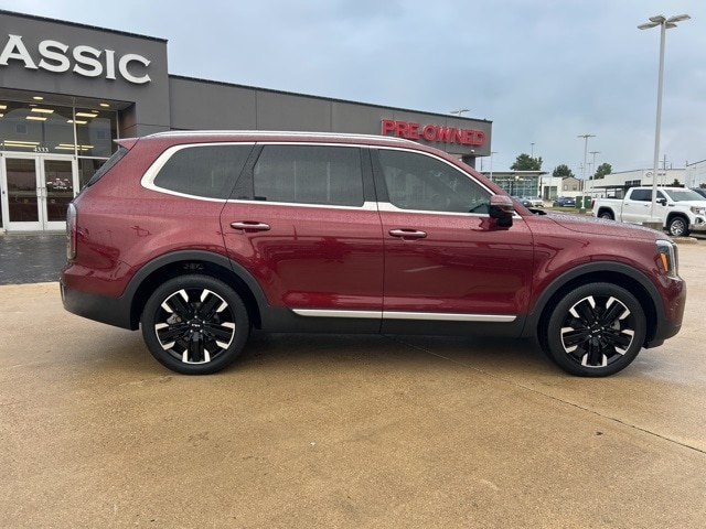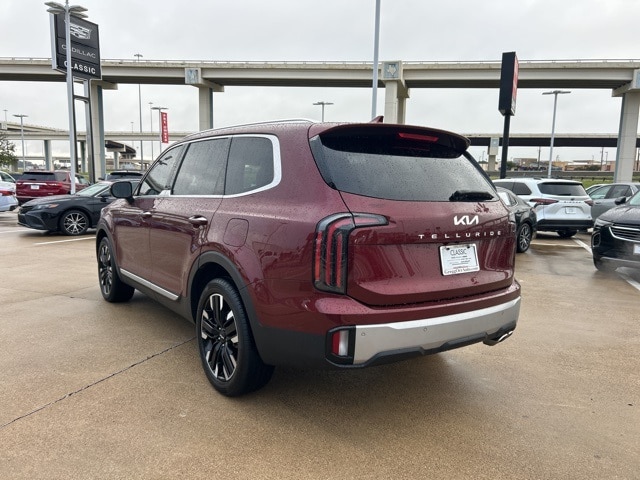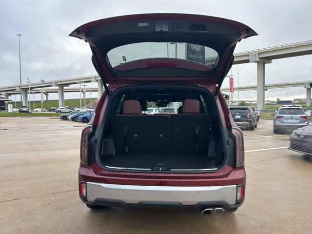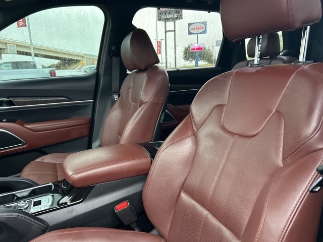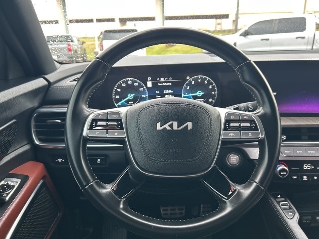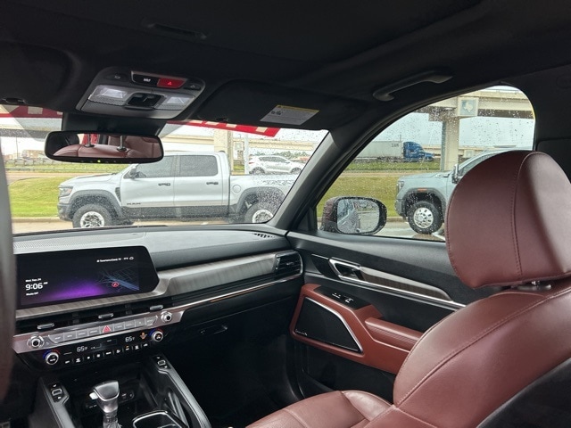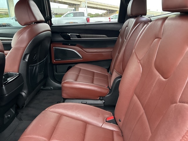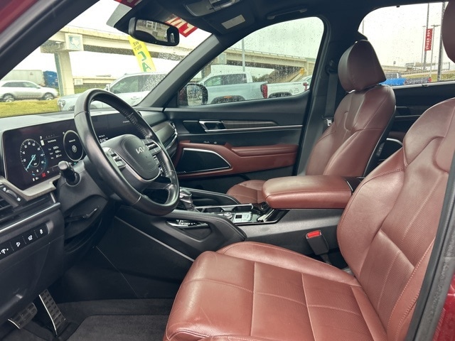 This 2023 Kia Telluride comes equipped with the following features 10 Speakers, 3.510 Axle Ratio, 3rd row seats: split-bench, 4-Wheel Disc Brakes, ABS brakes, Air Conditioning, Alloy wheels, AM/FM radio: SiriusXM, Apple CarPlay & Android Auto, Auto High-beam Headlights, Auto-dimming Rear-View mirror, Automatic temperature control, Brake assist, Bumpers: body-color, Carpet Floor Mats, Compass, Delay-off headlights, Driver door bin, Driver vanity mirror, Dual front impact airbags, Dual front side impact airbags, Electronic Stability Control, Emergency communication system: 911 Connect, Exterior Parking Camera Rear, Four wheel independent suspension, Front anti-roll bar, Front Bucket Seats, Front Center Armrest, Front dual zone A/C, Front fog lights, Front reading lights, Fully automatic headlights, Garage door transmitter: HomeLink, harman/kardon® Speakers, Heated & Ventilated Front Bucket Seats, Heated door mirrors, Heated front seats, Illuminated entry, Knee airbag, Leather Seat Trim, Leather Shift Knob, Leather steering wheel, Low tire pressure warning, Memory seat, Navigation System, Occupant sensing airbag, Outside temperature display, Overhead airbag, Overhead console, Panic alarm, Passenger door bin, Passenger vanity mirror, Power door mirrors, Power driver seat, Power Liftgate, Power moonroof, Power passenger seat, Power steering, Power windows, Radio data system, Radio: AM/FM harman/kardon Premium Audio System, Rear air conditioning, Rear anti-roll bar, Rear audio controls, Rear reading lights, Rear side impact airbag, Rear window defroster, Rear window wiper, Reclining 3rd row seat, Remote keyless entry, Roof rack: rails only, Security system, Smart Key w/ Push Button and Remote Start, Speed control, Speed-sensing steering, Split folding rear seat, Spoiler, Steering wheel mounted audio controls, Tachometer, Telescoping steering wheel, Tilt steering wheel, Traction control, Trip computer, Turn signal indicator mirrors, Variably intermittent wipers, Ventilated front seats, and Wheels: 20" x 7.5" Black Finish. CARFAX One-Owner. 2023 Kia Telluride SX FWD 3.8L V6 DGI DOHC Dual CVVT