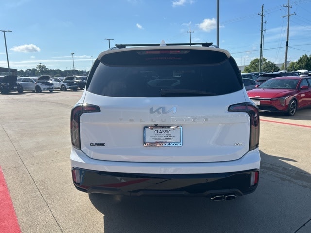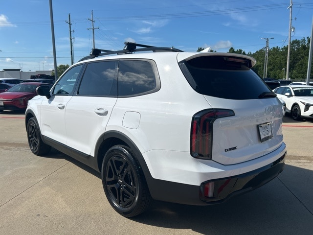 The 2024 Kia Telluride comes with the following features; Sage Green Interior Color Package, 10 Speakers, 3.648 Axle Ratio, 3rd row seats: split-bench, 4-Wheel Disc Brakes, ABS brakes, Air Conditioning, Alloy wheels, AM/FM radio: SiriusXM, Apple CarPlay & Android Auto, Auto High-beam Headlights, Auto-dimming Rear-View mirror, Auto-leveling suspension, Automatic temperature control, Brake assist, Bumpers: body-color, Cargo Cover, Cargo Tray Seat Back, Carpet Floor Mats, Compass, Cross Bars X-Line, Delay-off headlights, Driver door bin, Driver vanity mirror, Dual front impact airbags, Dual front side impact airbags, Electronic Stability Control, Emergency communication system: 911 Connect, Exterior Parking Camera Rear, Four wheel independent suspension, Front anti-roll bar, Front Bucket Seats, Front Center Armrest, Front dual zone A/C, Front fog lights, Front reading lights, Fully automatic headlights, Garage door transmitter: HomeLink, harman/kardon® Speakers, Heads-Up Display, Heated & Ventilated Front Bucket Seats, Heated door mirrors, Heated front seats, Heated rear seats, Heated steering wheel, Hybrid Cargo Net, Illuminated entry, Knee airbag, Leather Shift Knob, Leather steering wheel, Low tire pressure warning, Memory seat, Navigation System, Occupant sensing airbag, Outside temperature display, Overhead airbag, Overhead console, Panic alarm, Passenger door bin, Passenger vanity mirror, Power door mirrors, Power driver seat, Power Liftgate, Power moonroof, Power passenger seat, Power steering, Power windows, Premium Nappa Leather Seat Trim, Radio data system, Radio: AM/FM Harman Kardon Audio System, Rain sensing wipers, Rear air conditioning, Rear anti-roll bar, Rear audio controls, Rear reading lights, Rear side impact airbag, Rear window defroster, Rear window wiper, Reclining 3rd row seat, Remote keyless entry, Roof rack: rails only, Security system, Smart Key w/ Push Button and Remote Start, Speed control, Speed-sensing steering, Split folding rear seat, Spoiler, Steering wheel mounted audio controls, Tachometer, Telescoping steering wheel, Tilt steering wheel, Traction control, Trip computer, Turn signal indicator mirrors, Variably intermittent wipers, Ventilated front seats, Ventilated rear seats, and Wheels: 20" x 7.5" Black Finish X-LINE Exclusive.