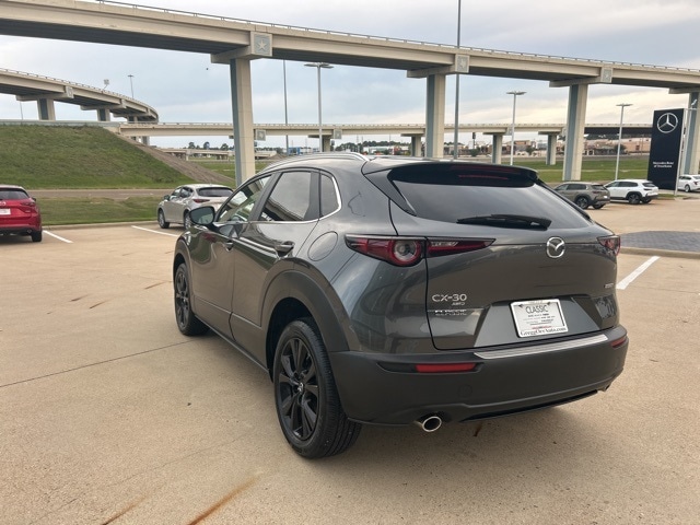 This 2025 Mazda CX-30 comes equipped with the following features 4-Wheel Disc Brakes, 6 Speakers, ABS brakes, Air Conditioning, Alloy wheels, AM/FM radio, AppLink/Apple CarPlay and Android Auto, Auto High-beam Headlights, Automatic temperature control, Black Lug Nuts & Black Wheel Locks, Brake assist, Bumpers: body-color, Compass, Delay-off headlights, Driver door bin, Driver vanity mirror, Dual front impact airbags, Dual front side impact airbags, Electronic Stability Control, Emergency communication system: Mazda Connected Services (3-year trial subscription included), Exterior Parking Camera Rear, Front anti-roll bar, Front Bucket Seats, Front Center Armrest, Front dual zone A/C, Front reading lights, Front wheel independent suspension, Fully automatic headlights, Heated door mirrors, Illuminated entry, Knee airbag, Leather Shift Knob, Leather steering wheel, Leatherette Seat Trim, Low tire pressure warning, Machine Gray Metallic Paint Charge, MAZDA CONNECT Infotainment System, Occupant sensing airbag, Outside temperature display, Overhead airbag, Overhead console, Panic alarm, Passenger door bin, Passenger vanity mirror, Power door mirrors, Power steering, Power windows, Radio data system, Radio: AM/FM Audio System, Rain sensing wipers, Rear seat center armrest, Rear side impact airbag, Rear window defroster, Rear window wiper, Remote keyless entry, Speed control, Speed-sensing steering, Split folding rear seat, Spoiler, Stainless Steel Rear Bumper Guard, Steering wheel mounted audio controls, Tachometer, Telescoping steering wheel, Tilt steering wheel, Traction control, Trip computer, Turn signal indicator mirrors, Variably intermittent wipers, and Wheels: 18" x 7J Aluminum Alloy. Clean CARFAX. 2025 Mazda CX-30 2.5 S Select Sport AWD SKYACTIV® 2.5L 4-Cylinder DOHC 16V