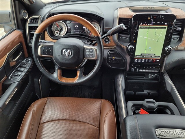 This 2021 Ram 2500 comes equipped with Body Color Bumper Group (Painted Front Bumper and Painted Rear Bumper), Longhorn Level 1 Equipment Group (17 Speaker harman kardon Premium Sound, Blind Spot & Cross Path Detection, GPS Navigation, Power Deployable Running Boards, Radio: Uconnect 12.0 w/Navigation, Ramcharger Wireless Charging Pad, 1-Year SiriusXM Guardian Trial, 12" Touchscreen Display, 4G LTE Wi-Fi Hot Spot, Apple CarPlay, Disassociated Touchscreen Display, Google Android Auto, GPS Antenna Input, HD Radio, Integrated Voice Command w/Bluetooth, SiriusXM Satellite Radio, SiriusXM Traffic Plus, SiriusXM Travel Link, and SiriusXM w/360L), Off Road Package (Front Performance Tuned Shock Absorbers, Hill Descent Control, Off Road Decal, Off-Road Information Pages, Rear Performance Tuned Shock Absorbers, and Tow Hooks), Quick Order Package 2HK Longhorn, Safety Group (Adaptive Cruise Control w/Stop, Adaptive Steering System, Digital Rearview Mirror, Full Speed Forward Collision Warning Plus, and Lane Keep Assist), Towing Technology Group (CTR Stop Lamp w/Cargo View Camera, Surround View Camera System, and Trailer Reverse Guidance), Navigation System, 10 Speakers, 115V Auxiliary Rear Power Outlet, 2 Way Rear Headrest Seat, 20" x 8.0" Polished Aluminum Wheels, 220 Amp Alternator, 3.73 Axle Ratio, 4 Way Front Headrests, 4-Wheel Disc Brakes, 8.4" Touchscreen Display, ABS brakes, Active Noise Control System, Adjustable pedals, Air Conditioning, Alloy wheels, AM/FM radio: SiriusXM, Anti-Spin Differential Rear Axle, Apple CarPlay/Android Auto, Audio memory, Auto High-beam Headlights, Auto-dimming Rear-View mirror, Automatic temperature control, Blind Spot & Cross Path Detection (DISC), Brake assist, Bucket Seats, Bumpers: chrome, Center Hub, Clearance Lamps, Compass, Dash Pass Thru Wire Circuits, Delay-off headlights, Driver door bin, Driver vanity mirror, Dual front impact airbags, Dual front side impact airbags, Electronic Stability Control, Electronically Controlled Throttle, Emergency communication system: SiriusXM Guardian, Engine Block Heater, Folding Flat Load Floor Storage, Front anti-roll bar, Front Bucket Seats, Front Center Armrest w/Storage, Front dual zone A/C, Front fog lights, Front License Plate Bracket, Front reading lights, Front Seat Back Map Pockets, Full Length Premium Upgraded Floor Console, Fully automatic headlights, Garage door transmitter, Genuine wood console insert, Genuine wood dashboard insert, Genuine wood door panel insert, Heated door mirrors, Heated Front Seats, Heated front seats, Heated rear seats, Heated Second Row Seats, Heated Steering Wheel, Heated steering wheel, High Back Seats, I/P Mounted Auxiliary Switches, Illuminated entry, Integrated Center Stack Radio, Leather steering wheel, Low tire pressure warning, Memory seat, Occupant sensing airbag, Outside temperature display, Overhead airbag, Overhead console, Panic alarm, ParkView Rear Back-Up Camera, Passenger door bin, Passenger vanity mirror, Pedal memory, Power 2-Way Driver Lumbar Adjust, Power 2-Way Passenger Lumbar Adjust, Power Adjust 8-Way Driver Seat, Power Adjust 8-Way Front Passenger Seat, Power door mirrors, Power driver seat, Power passenger seat, Power steering, Power Sunroof, Power windows, Premium Filigree Leather Seats, Radio data system, Radio: Uconnect 4C Nav w/8.4" Display, Radio/Driver Seat/Mirrors/Pedals Memory, Rain sensing wipers, Rear 60/40 Folding Seat, Rear anti-roll bar, Rear reading lights, Rear seat center armrest, Rear step bumper, Rear window defroster, Remote keyless entry, Security system, Speed control, Split folding rear seat, Steering wheel mounted audio controls, Tachometer, Tilt steering wheel, Tip Start, Traction control, Trip computer, Turn signal indicator mirrors, Variably intermittent wipers, Vendor Painted Cargo Box Tracking, Ventilated Front Seats, Ventilated front seats, Voltmeter, and Wheels: 18" x 8.0" Polished Aluminum. 17 Speaker harman kardon Premium Sound, Adaptive Cruise Control w/Stop, Adapt