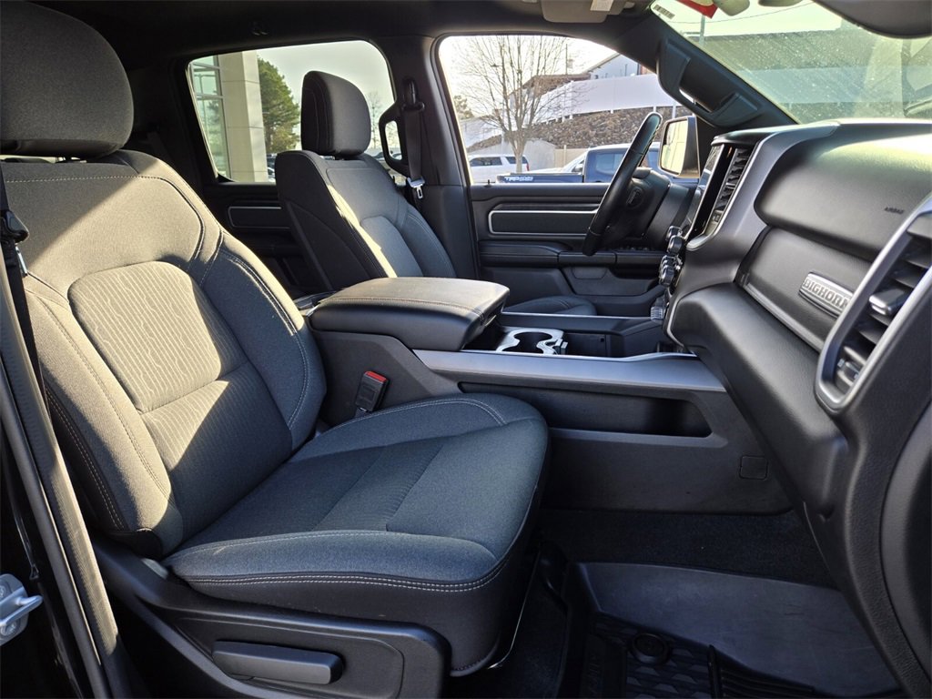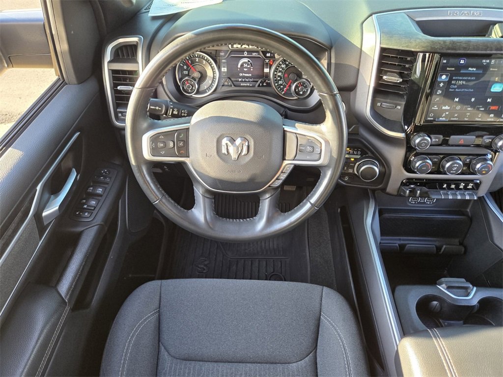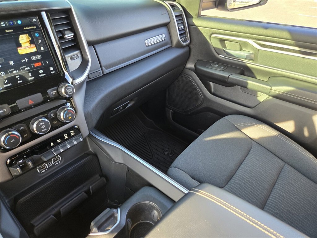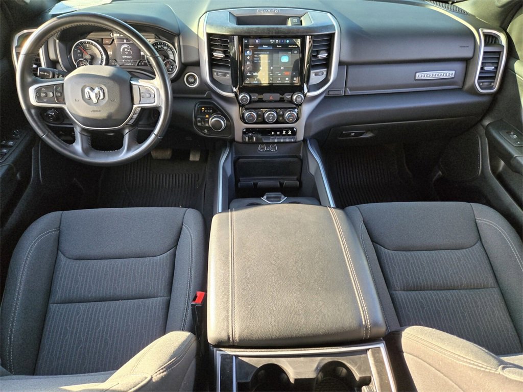 This 2022 Ram 1500 comes equipped with, 2nd Row In Floor Storage Bins, 3 Rear Seat Head Restraints, 3.21 Rear Axle Ratio, 33 Gallon Fuel Tank, 4 Way Front Headrests, 4-Wheel Disc Brakes, 48V Belt Starter Generator, 4G LTE Wi-Fi Hot Spot, 6 Speakers, 8.4" Touchscreen Display, 9 Amplified Speakers w/Subwoofer, ABS brakes, Air Conditioning, Air Conditioning ATC w/Dual Zone Control, All Plant-Installed Decals, All R1 High Radios, All Radio Equipped Vehicles, Alloy wheels, AM/FM radio, Anti-Spin Differential Rear Axle, Apple CarPlay, Auto-Dimming Exterior Driver Mirror, Auto-Dimming Rear-View Mirror, Bed Utility Group, Big Horn Badge, Big Horn Level 1 Equipment Group, Black Exterior Mirrors, Black Interior Accents, Black Premium Power Mirrors, Bluetooth Handsfree Phone & Audio, Body Color Exterior Mirrors, Body Color Front Bumper, Body Color Premium Power Mirrors, Body Color Rear Bumper w/Step Pads, Brake assist, Bridgestone Brand Tires, Bucket Seats, Bumpers: chrome, Class IV Receiver Hitch, Cloth Bench Seat, Cluster 3.5" TFT Color Display, Cluster 7.0" TFT Color Display, Compass, Connected Travel & Traffic Services, Connectivity - US/Canada, Convex Wide-Angle Mirror Insert, Delay-off headlights, Delete LED Lamp - Floor Console Bin, Deluxe Cloth Bucket Seats, Disassociated Touchscreen Display, Driver door bin, Dual front impact airbags, Dual front side impact airbags, Electronic Stability Control, Emergency communication system: SiriusXM Guardian, Exterior Mirrors Courtesy Lamps, Exterior Mirrors w/Heating Element, Exterior Mirrors w/Supplemental Signals, For Details, Visit DriveUconnect.com, Front anti-roll bar, Front Center Armrest w/Storage, Front fog lights, Front License Plate Bracket, Front reading lights, Front Seat Back Map Pockets, Front wheel independent suspension, Full Length Floor Console, Fully automatic headlights, Global Telematics Box Module (TBM), Glove Box Lamp, Google Android Auto, GPS Antenna Input, GPS Navigation, HD Radio, Heated door mirrors, Illuminated entry, Integrated Center Stack Radio, Integrated Voice Command w/Bluetooth, Leather steering wheel, Low tire pressure warning, Manual Adjust 4-Way Front Passenger Seat, Manufacturer's Statement of Origin, MOPAR 4 Adjustable Cargo Tie-Down Hooks, MOPAR Deployable Bed Step, MOPAR Spray In Bedliner, Occupant sensing airbag, Outside temperature display, Overhead airbag, Overhead console, Panic alarm, ParkSense Front/Rear Park Assist w/Stop, ParkView Rear Back-Up Camera, Passenger door bin, Passenger vanity mirror, Pick-Up Box Lighting, Power 2-Way Driver Lumbar Adjust, Power 8-Way Driver Seat, Power Adjustable Pedals, Power door mirrors, Power steering, Power windows, Power-Folding Mirrors, Quick Order Package 23Z Big Horn, Quick Order Package 27Z Big Horn, Radio data system, Radio: Uconnect 3 w/5" Display, Radio: Uconnect 5 Nav w/8.4" Display, Radio: Uconnect 5 W w/8.4" Display, Rear 60/40 Folding Seat, Rear anti-roll bar, Rear Center Armrest, Rear Dome w/On/Off Switch Lamp, Rear Power Sliding Window, Rear seat center armrest, Rear step bumper, Rear Window Defroster, Remote keyless entry, Remote Start System, SiriusXM Radio Service, SiriusXM Satellite Radio, SiriusXM w/360L, Speed control, Split folding rear seat, Sport Appearance Package, Sport Decal, Steering wheel mounted audio controls, Sun Visors w/Illuminated Vanity Mirrors, Tachometer, Telescoping steering wheel, Tilt steering wheel, Traction control, Trailer Brake Control, Trip computer, Universal Garage Door Opener, USB Host Flip, Variably intermittent wipers, Voltmeter, Wheels: 18" x 8" Cast-Aluminum Painted, Wheels: 20" x 9" Aluminum Chrome Clad (WRK). Odometer is 40279 miles below market average!