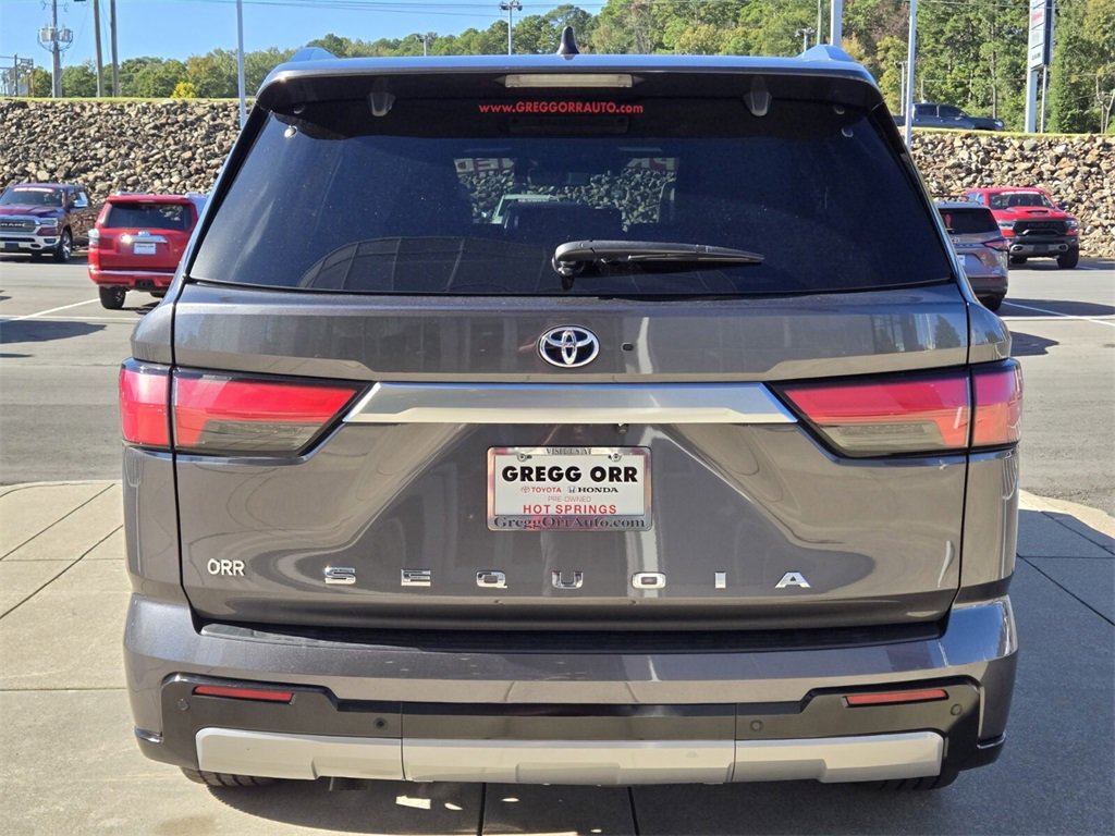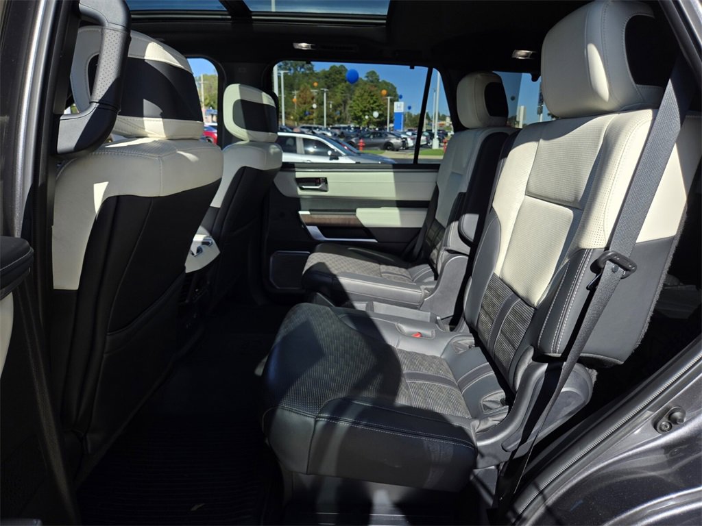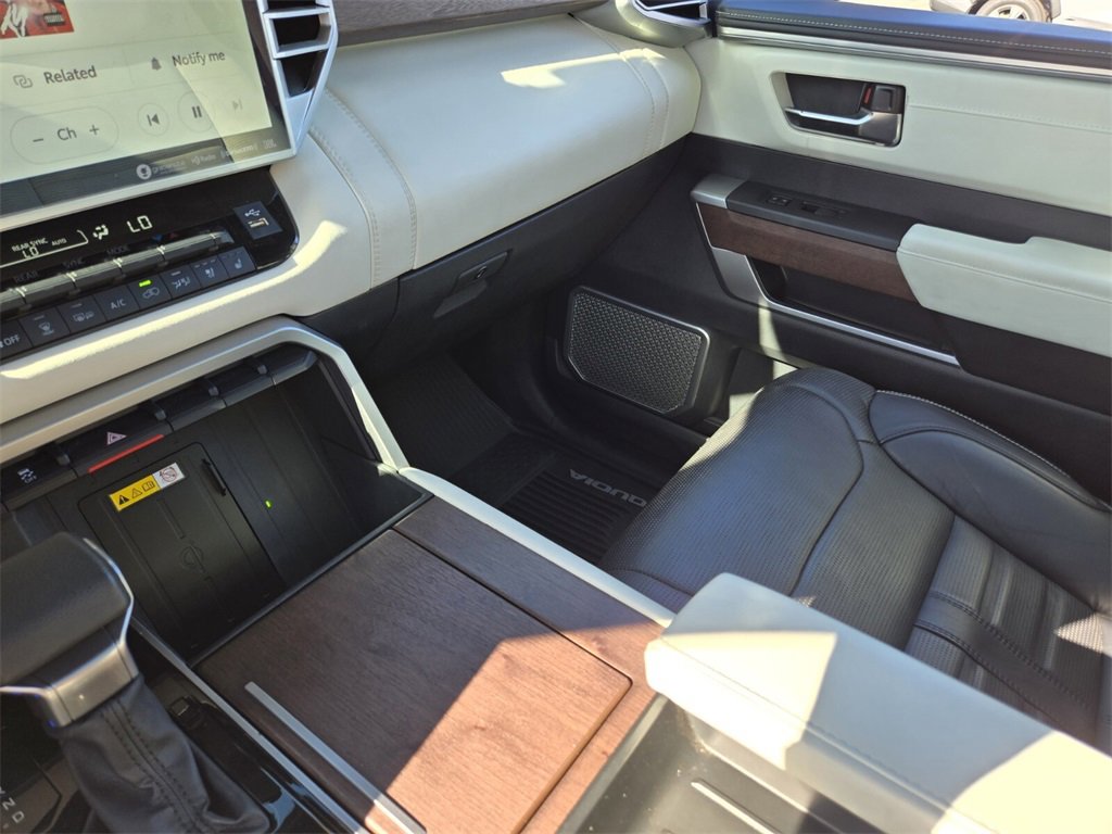 Recent Arrival! This 2024 Toyota Sequoia comes equipped with, V6 Hybrid, 10-Speed Automatic, 4WD, 14 Speakers, 3.31 Axle Ratio, 3rd row seats: split-bench, 4-Wheel Disc Brakes, ABS brakes, Air Conditioning, Alloy wheels, AM/FM radio: SiriusXM, Anti-whiplash front head restraints, Apple CarPlay/Android Auto, Auto High-beam Headlights, Auto tilt-away steering wheel, Auto-dimming door mirrors, Auto-dimming Rear-View mirror, Automatic Power Extending Running Boards, Automatic temperature control, Brake assist, Bumpers: body-color, Capstone, Compass, Delay-off headlights, Driver door bin, Driver vanity mirror, Dual front impact airbags, Dual front side impact airbags, Electronic Stability Control, Emergency communication system: Safety Connect (10-year trial), Exterior Parking Camera Rear, Front anti-roll bar, Front Bucket Seats, Front Center Armrest w/Storage, Front dual zone A/C, Front fog lights, Front reading lights, Front wheel independent suspension, Fully automatic headlights, Garage door transmitter: HomeLink, Genuine wood door panel insert, Head Up Display (HUD), Headlight cleaning, Heads-Up Display, Heated & Ventilated Front Seats, Heated door mirrors, Heated front seats, Heated Power Auto-Dimming Outside Mirrors, Heated rear seats, Heated steering wheel, Illuminated entry, Knee airbag, Leather Shift Knob, Leather steering wheel, Low tire pressure warning, Memory seat, Navigation system: Drive Connect (1 year trial) includes Cloud Navigation with real time traffic and Google POI, Occupant sensing airbag, Outside temperature display, Overhead airbag, Overhead console, Panic alarm, Passenger door bin, Passenger vanity mirror, Power door mirrors, Power driver seat, Power Liftgate, Power moonroof, Power passenger seat, Power steering, Power windows, Premium audio system: JBL, Radio: JBL Premium Audio System, Rain sensing wipers, Rear air conditioning, Rear reading lights, Rear seat center armrest, Rear window defroster, Rear window wiper, Reclining 3rd row seat, Remote keyless entry, Security system, Semi-Aniline Leather Seat Trim, Speed control, Speed-sensing steering, Split folding rear seat, Spoiler, Sport steering wheel, Steering wheel mounted audio controls, Tachometer, Telescoping steering wheel, Tilt steering wheel, Traction control, Trip computer, Turn signal indicator mirrors, Variably intermittent wipers, Ventilated front seats, Ventilated rear seats, Voltmeter, Wheels: 20" Machined-Finish Black Alloy, V6 Hybrid, 10-Speed Automatic, 4WD.